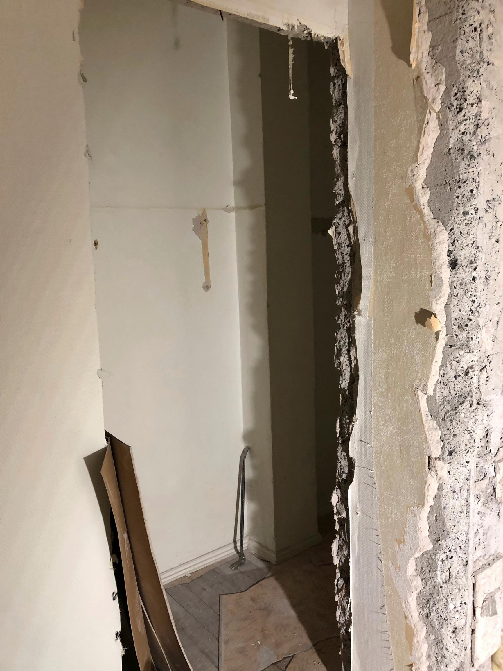 Muutostyöt teki Ekmanin remontti ja maalaus. Käsikirjoituksena toimi lopulta kylpyhuonekaluste-esitteen kanteen piirtämäni tilankäyttösuunnitelma, jota muokattiin lennossa. Vesiputki piti vetää kodinhoitotilaan paksun betoniseinän läpi. Tila vesieristettiin ennen laatoittamista, mutta lattiakaivoa ei taloyhtiön järjestämän ulkopuolisen valvojan mielestä tarvittu.