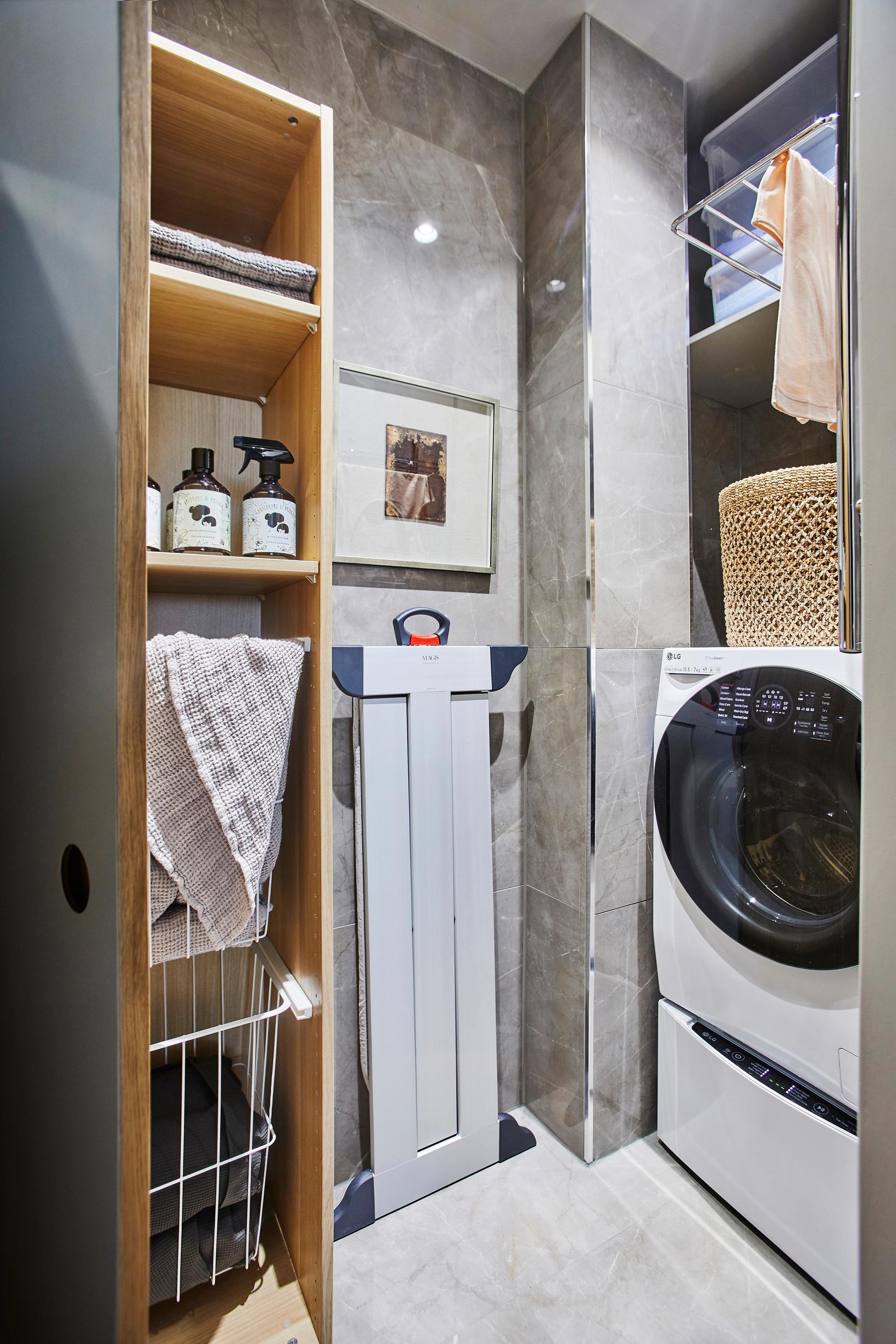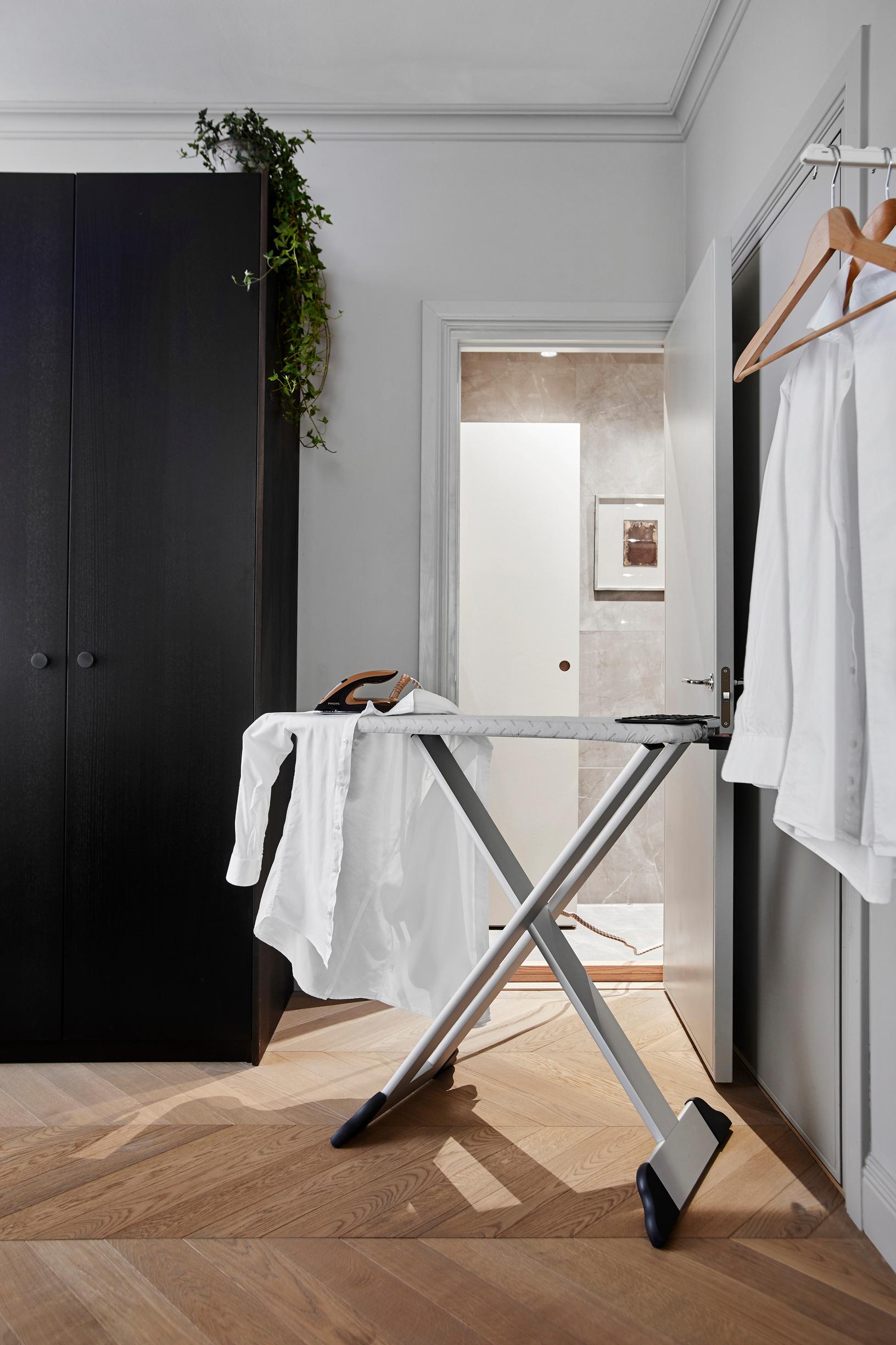 Asunnossa pyörähtänyt sisustusarkkitehti Anna Tiula Helsinki Interiorsista ideoi, että kylpyhuoneen viereisestä pikkukomerosta saisi remontissa mainion kodinhoitotilan. Hän myös suositteli laatoittamaan tilan samalla laatalla kuin kylpyhuoneen, jotta ilme pysyy yhtenäisenä.