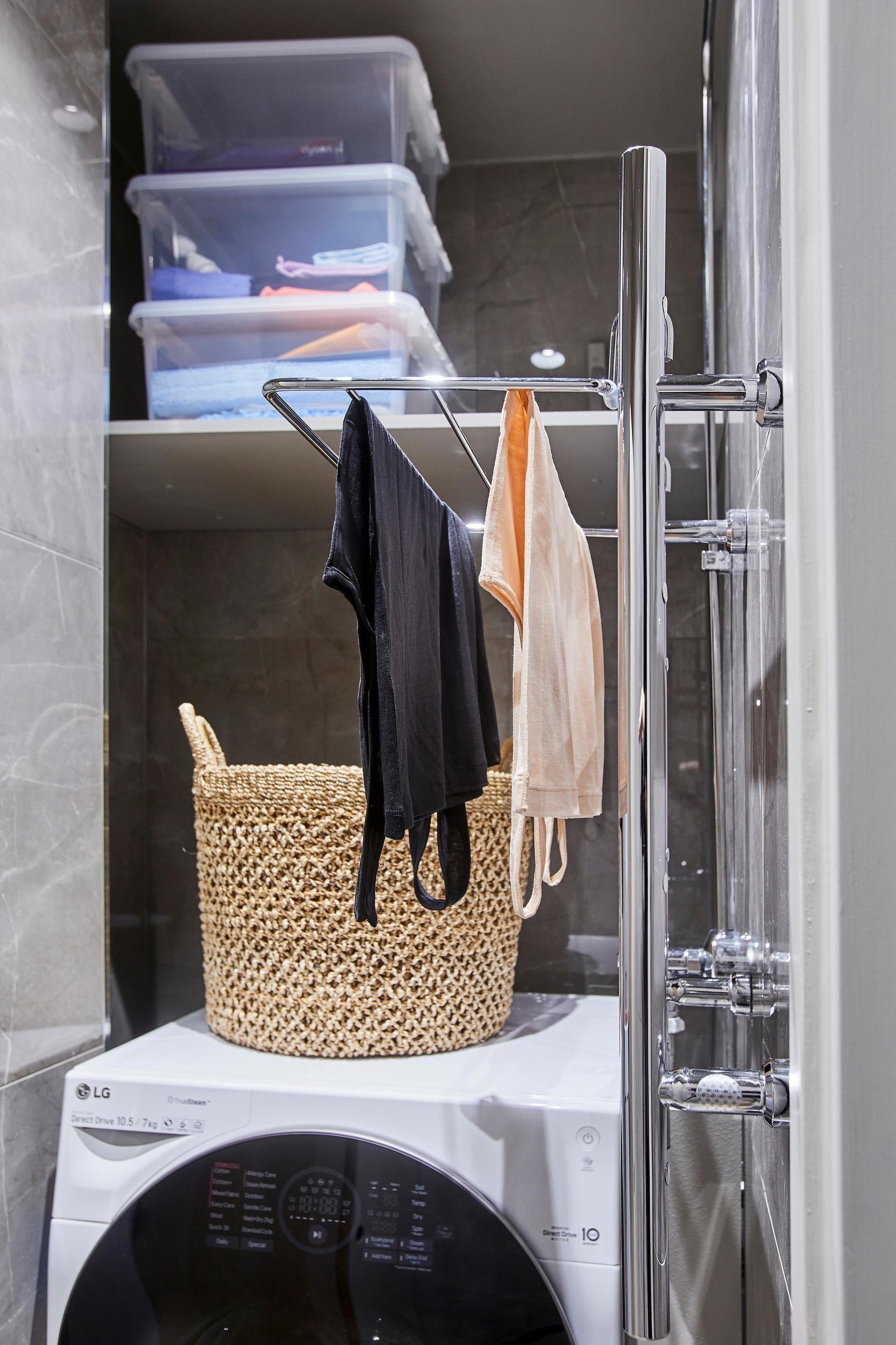 Pesukone mahtui tasan yhteen kohtaan huoneessa. Päädyin pesutornin sijasta kuivaavaan pesukoneeseen, jotta tila jäisi vähän ilmavammaksi. Kuivaavan koneen pesuohjelmat voivat kestää tunteja, joten tuntui näppärältä valita LG Twin Wash, jossa kuivaavan koneen alla on samaan aikaan käytettävissä oleva minipesukone.