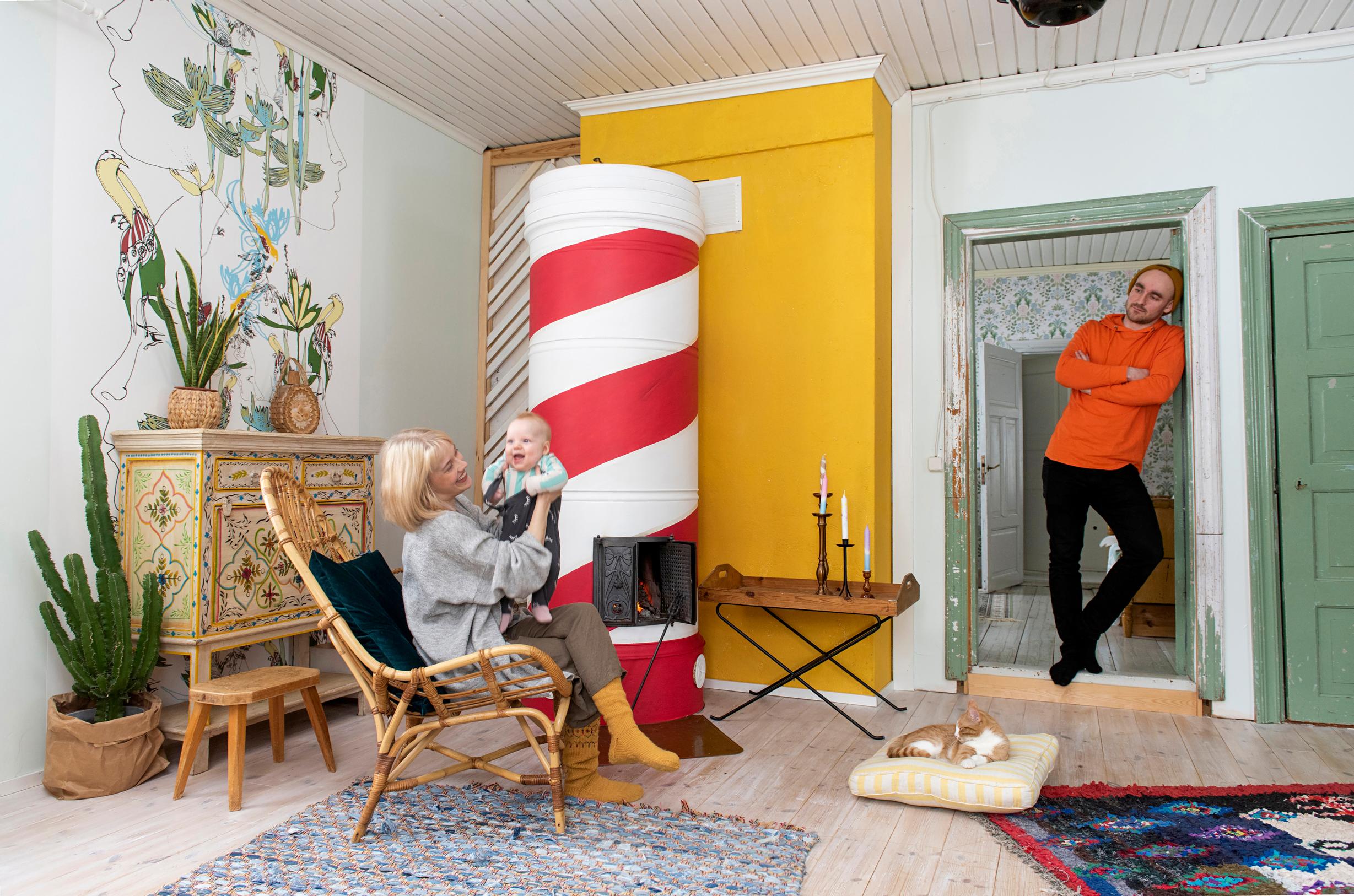 Tässä kodissa kaikki on värikästä ja vähän erilaista kuin muualla. Niinpä pönttöuunikin sai ylleen huomiota herättävän raidoituksen. Kun Heidi Kuulialan ja Väinö Pitkäniityn viisihenkiseen perheeseen saapui korona, Heidille tuli karanteenin aikana tylsää. Hän oli mieltynyt raitoihin ja päätti raidoittaa pönttöuunin.
