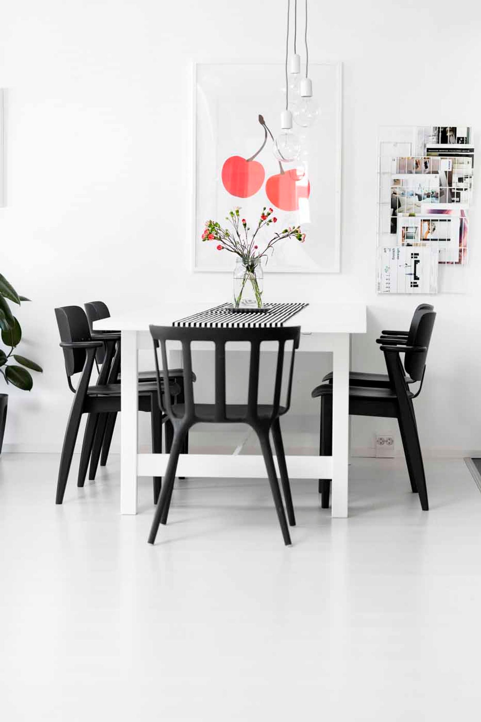 Kirsikkajuliste piristää mustavalkoista ruokailuryhmää. Ilmari Tapiovaaran Domus-tuolit on maalattu mustaksi.