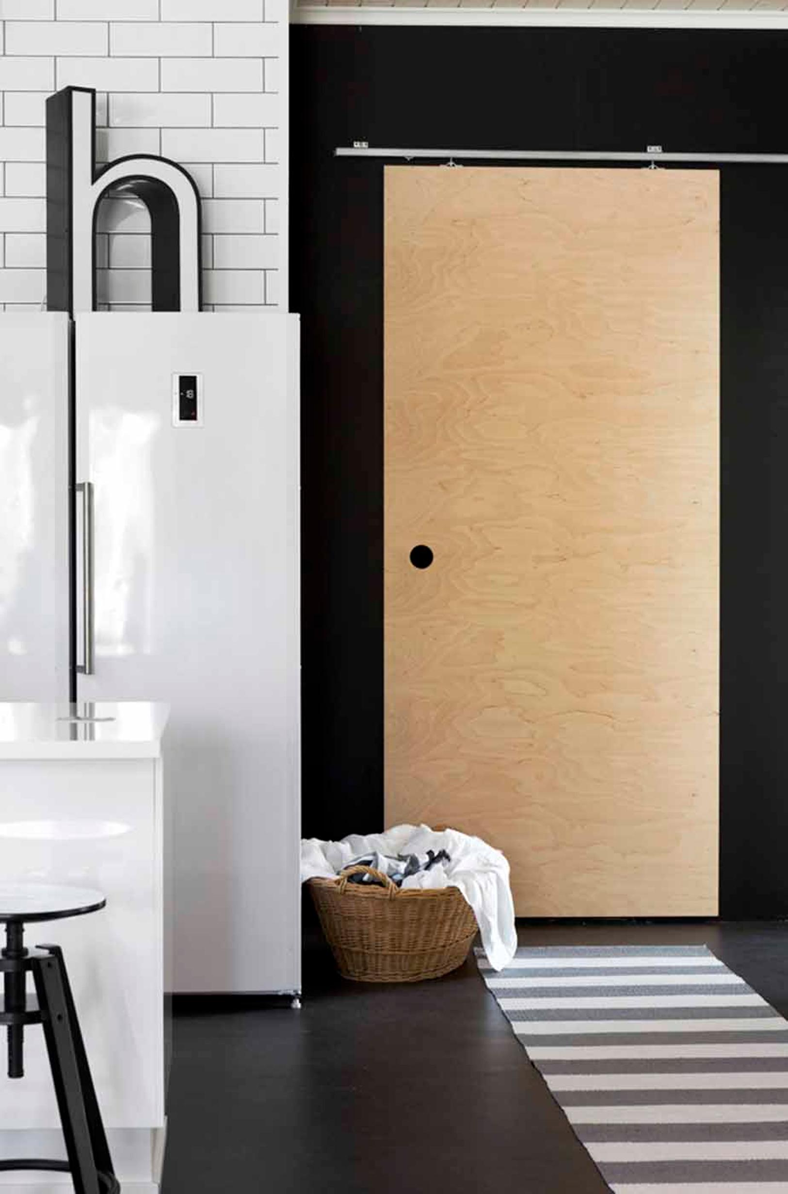 Kodinhoitohuoneen liukuovi on rakennettu vanerista.