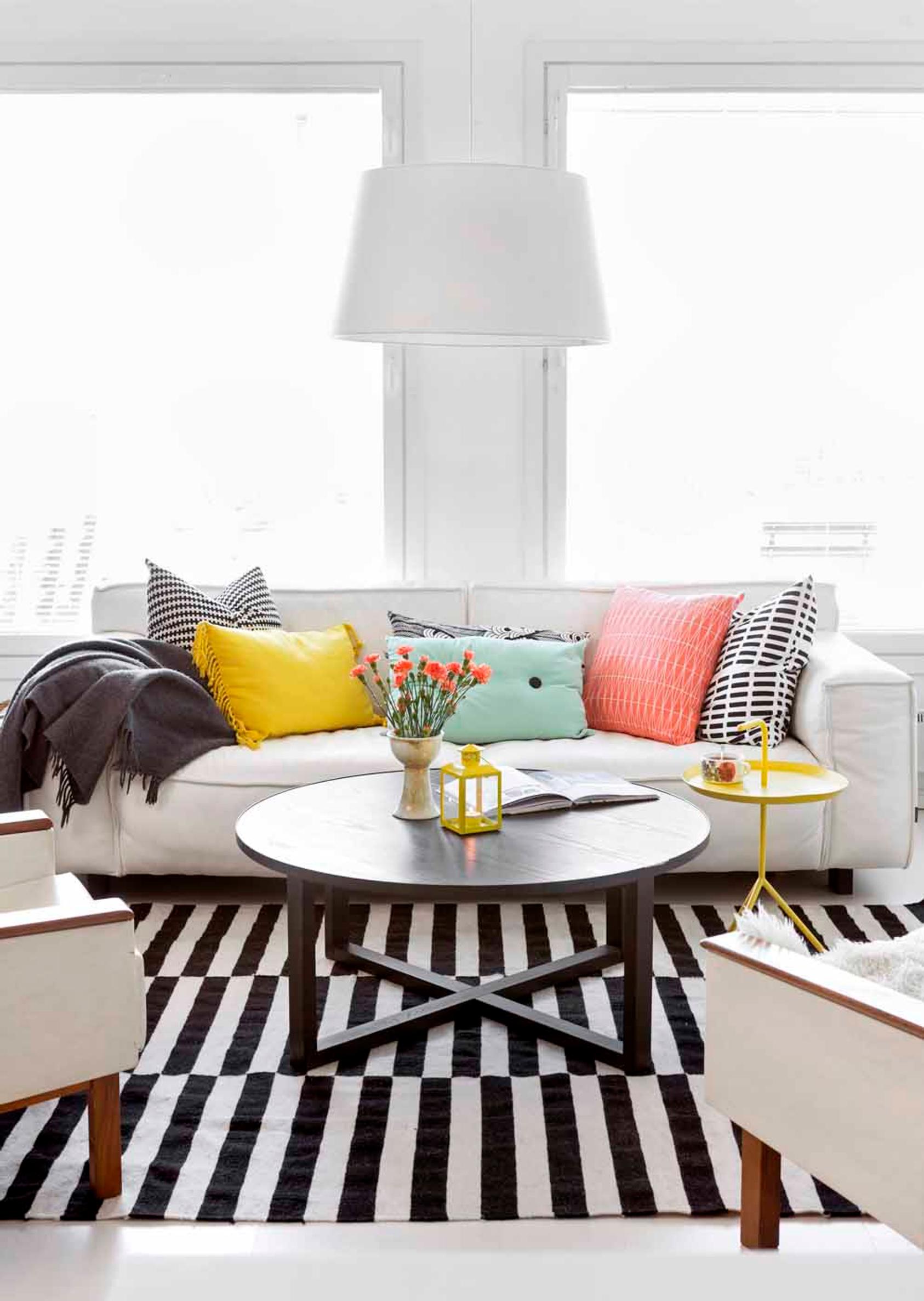 Värikkäät tyynyt pehmentävät olohuoneen ilmettä.