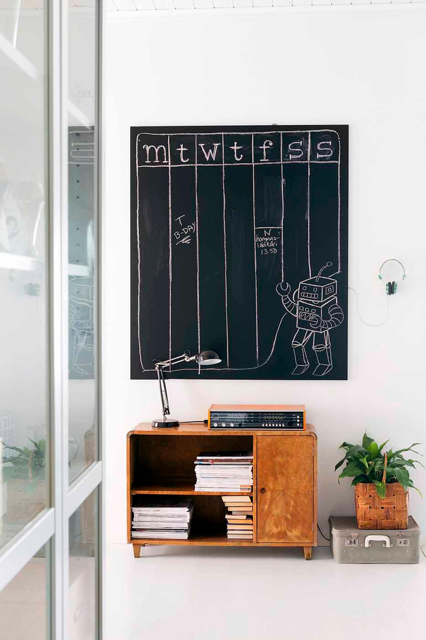 Sisustukseen mahtuu sekä vanhoja että uusia aarteita. Hauskan viikkokalenterin voi tehdä liitutaulumaalilla.