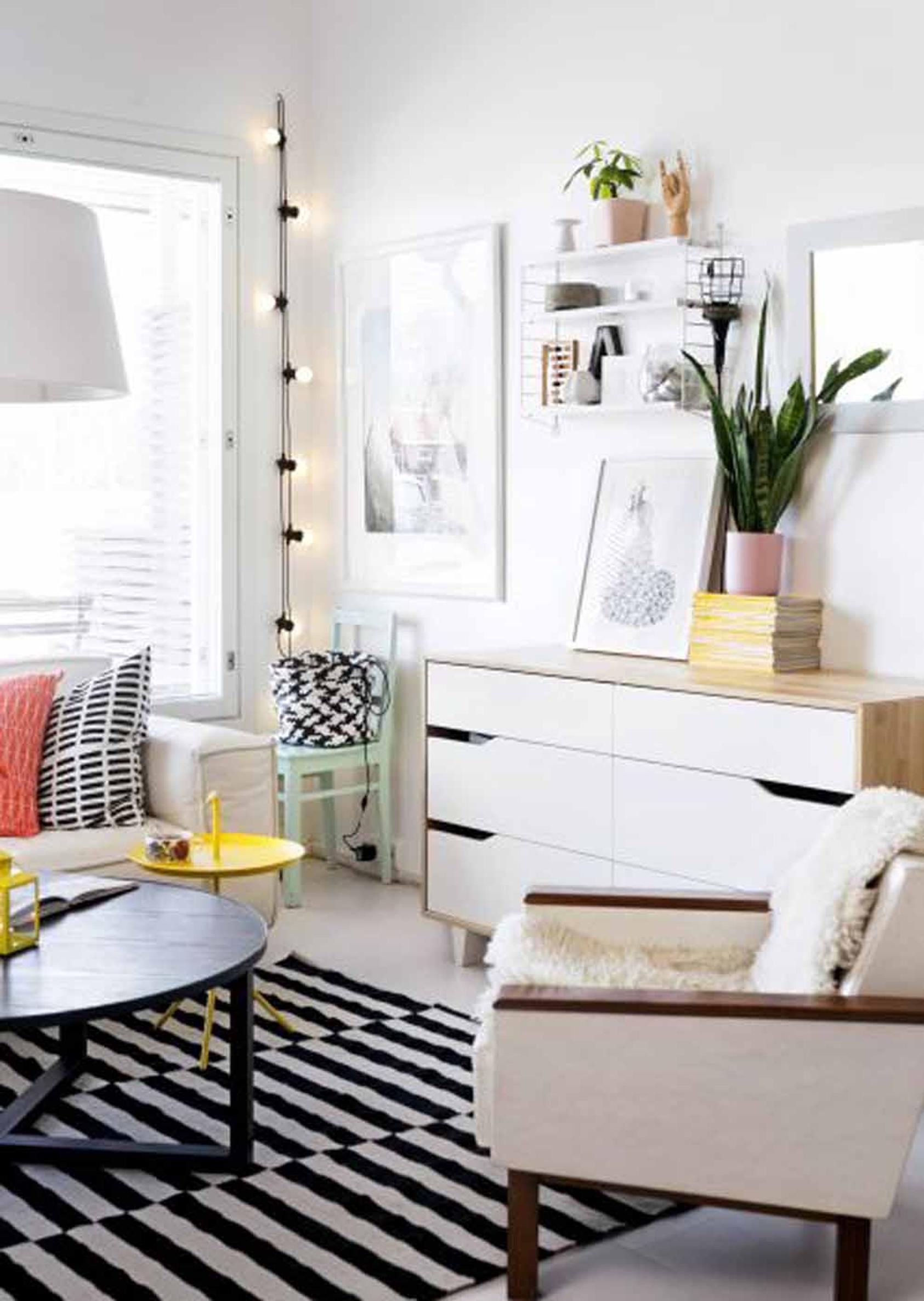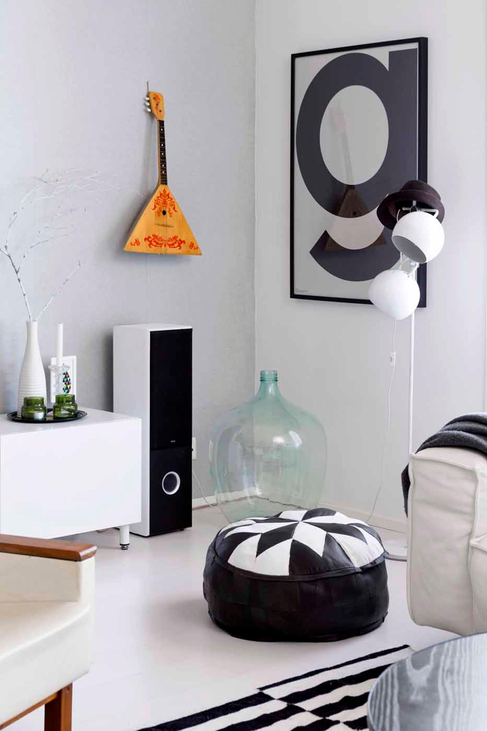 Mustavalkoinen sisustus pehmenee väriläiskillä ja hyvillä materiaalivalinnoilla.