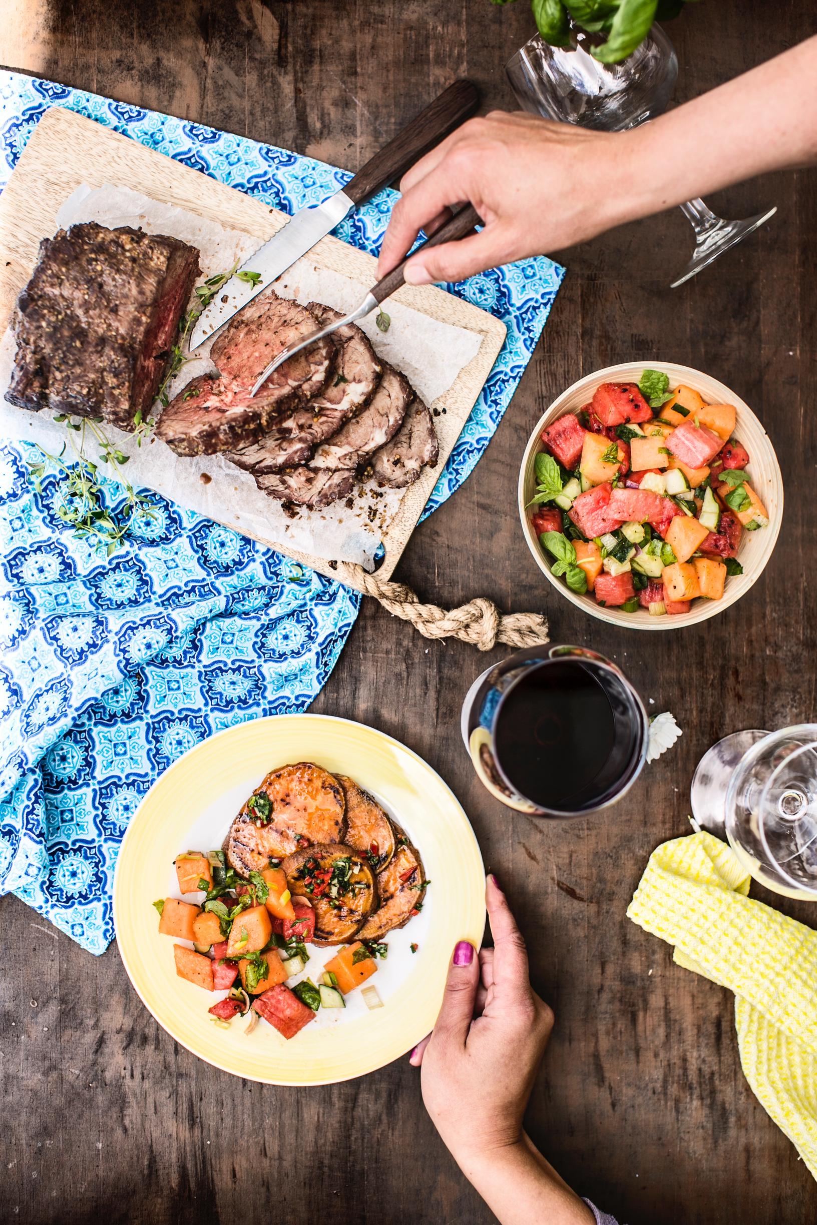 Pääruokana täydelliset pihvit grillattujen bataattien ja melonisalsan kera