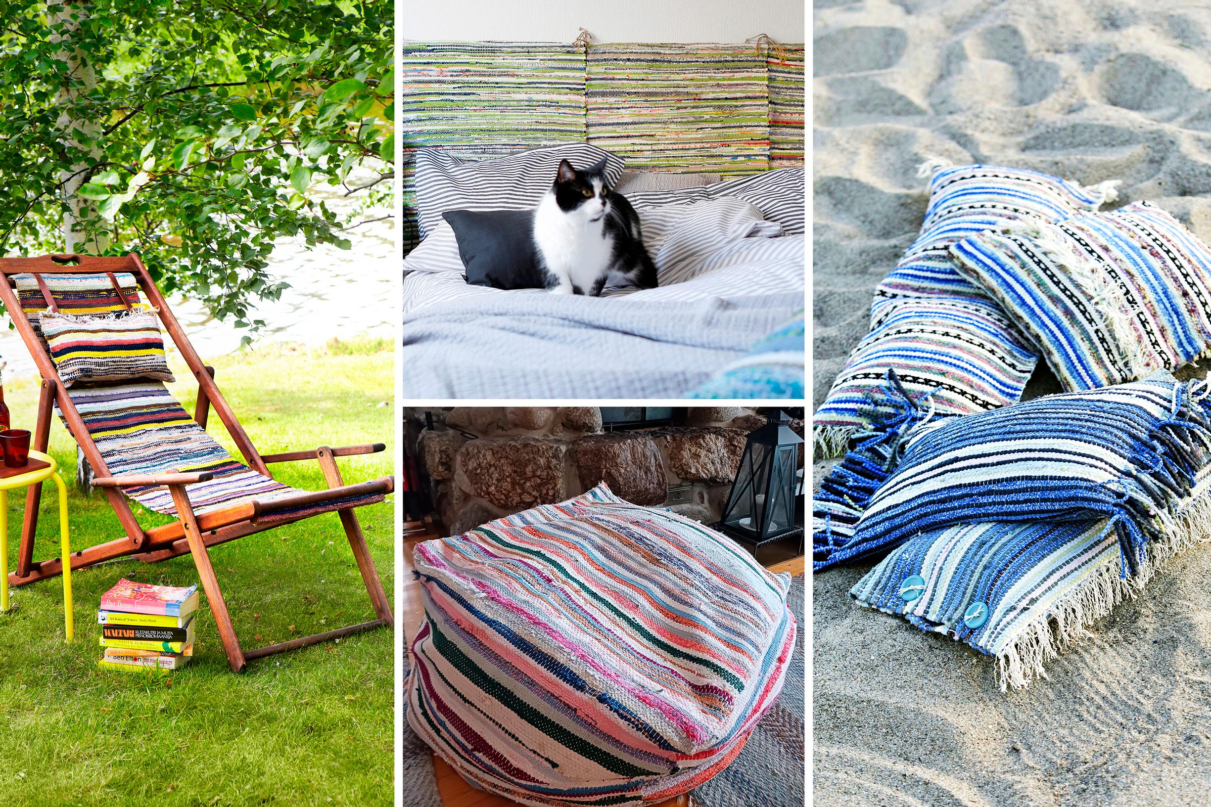 Räsymattotyynyjen materiaaliksi kelpaavat hieman jo rispaantuneetkin matot. Napakat ja kestävät tyynyt voi napata mukaan myös terassille tai rantareissulle. Kurkkaa räsymattotyynyjen ohje!