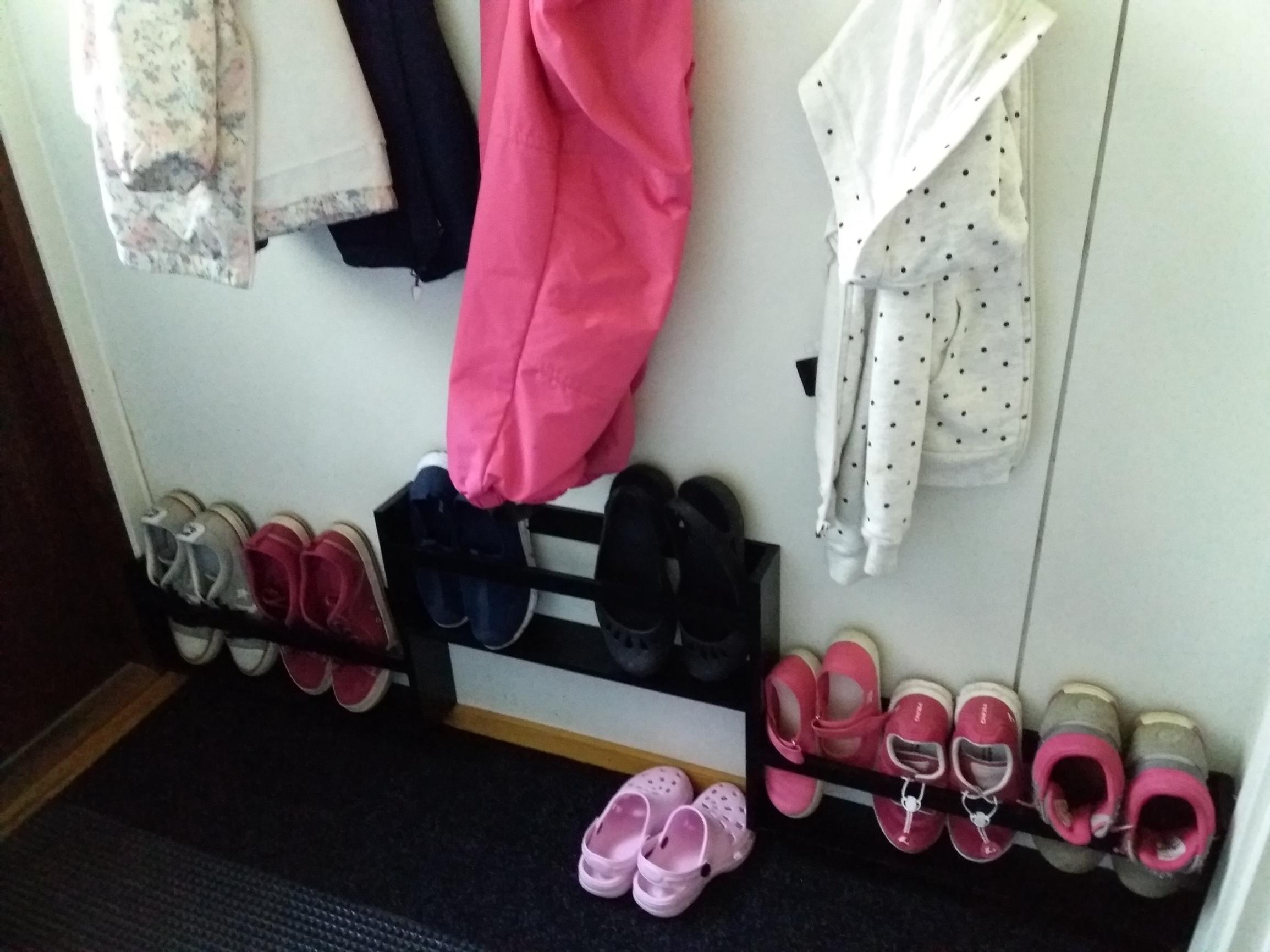 Katri Liiran nelihenkisen perheen eteinen oli hankala, sillä kaikki kenkätelineet ja -kaapit olivat niin syviä, että ne työntyivät oviaukon tielle. Perheenäiti keksi yllättävän ratkaisun ahtaan eteisen ongelmaan: kengät 4 euron lehtihyllyihin. Kurkista Katrin perheen eteiseen.