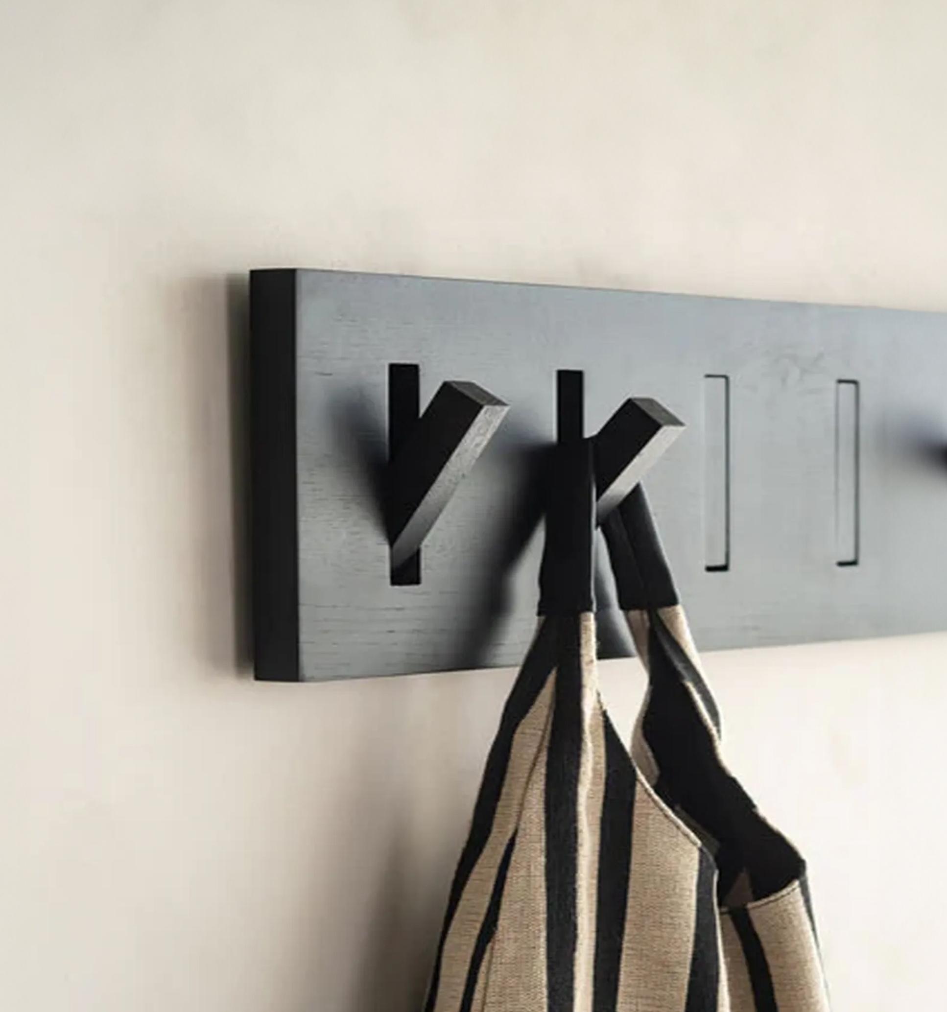Kun käytännöllinen huonekalu on myös kaunis, ei toimivaan tilaan tarvita sen kummempaa. Eteisen naulakoksi valitsimme Boknäsin valikoimaan kuuluvan Ethnicraft Utilitile -seinänaulakon mustassa sävyssä. Tammesta valmistetussa naulakossa on kuusi koukkua takkien ja asusteiden ripustamista varten, ja hauskana yksityiskohtana naulakon ripustimet voi taittaa rungon sisälle odottamaan käyttöä.