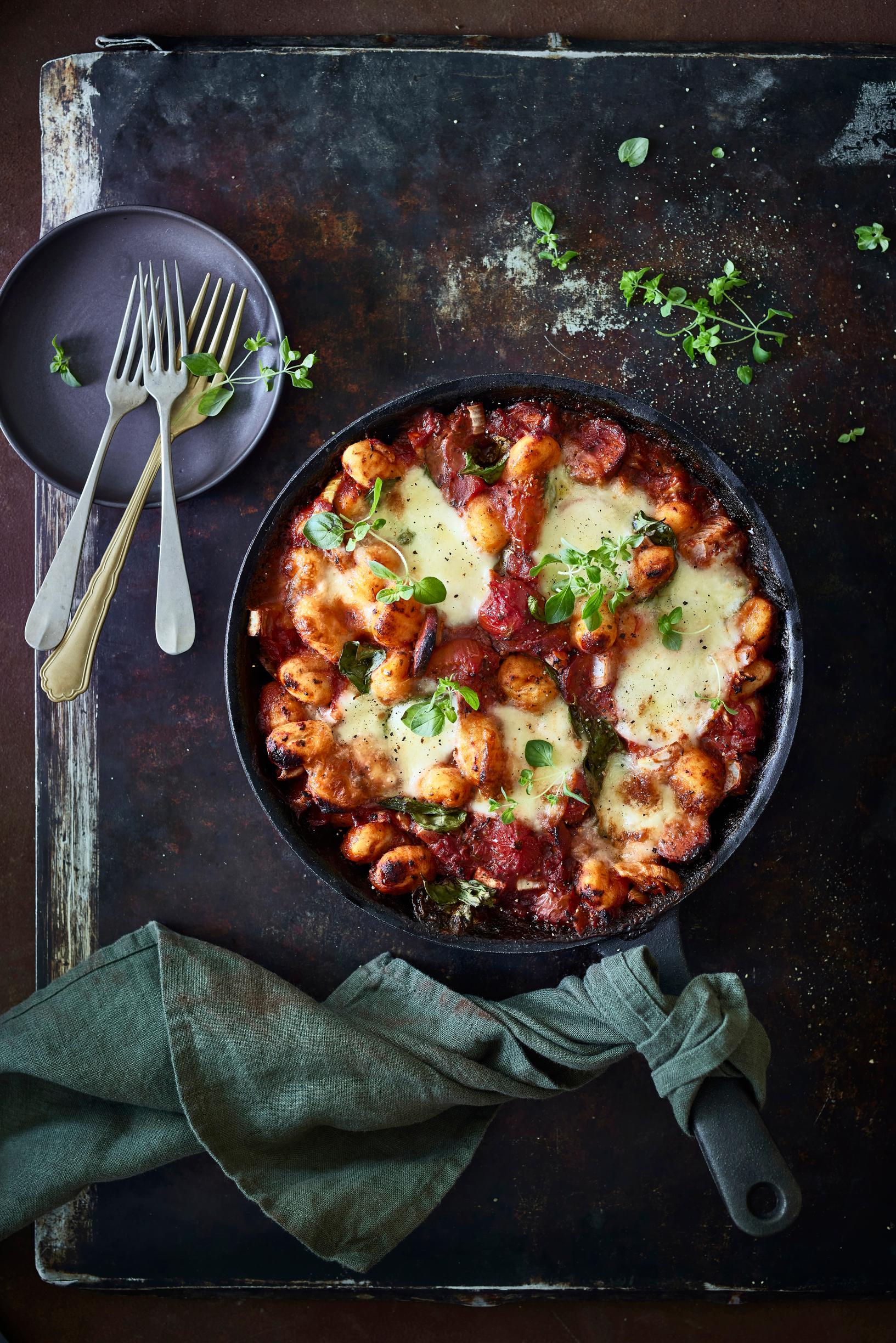 Mausteisen makkarainen gnocchivuoka valmistuu yhden astian taktiikalla. Kipakkaa makua tuo chorizomakkara, ja gnocchit imevät ihanasti makua marinara-kastikkeesta.