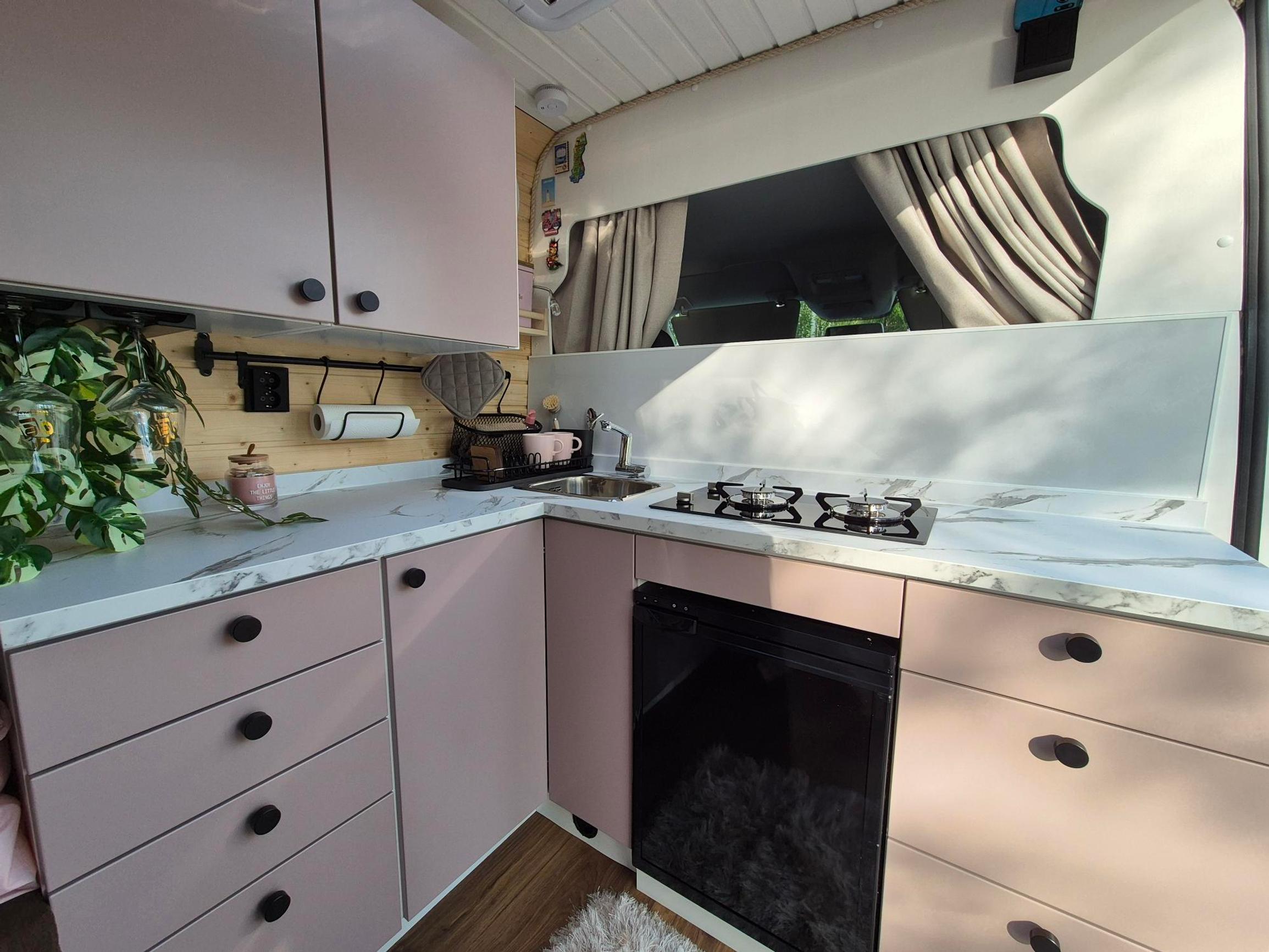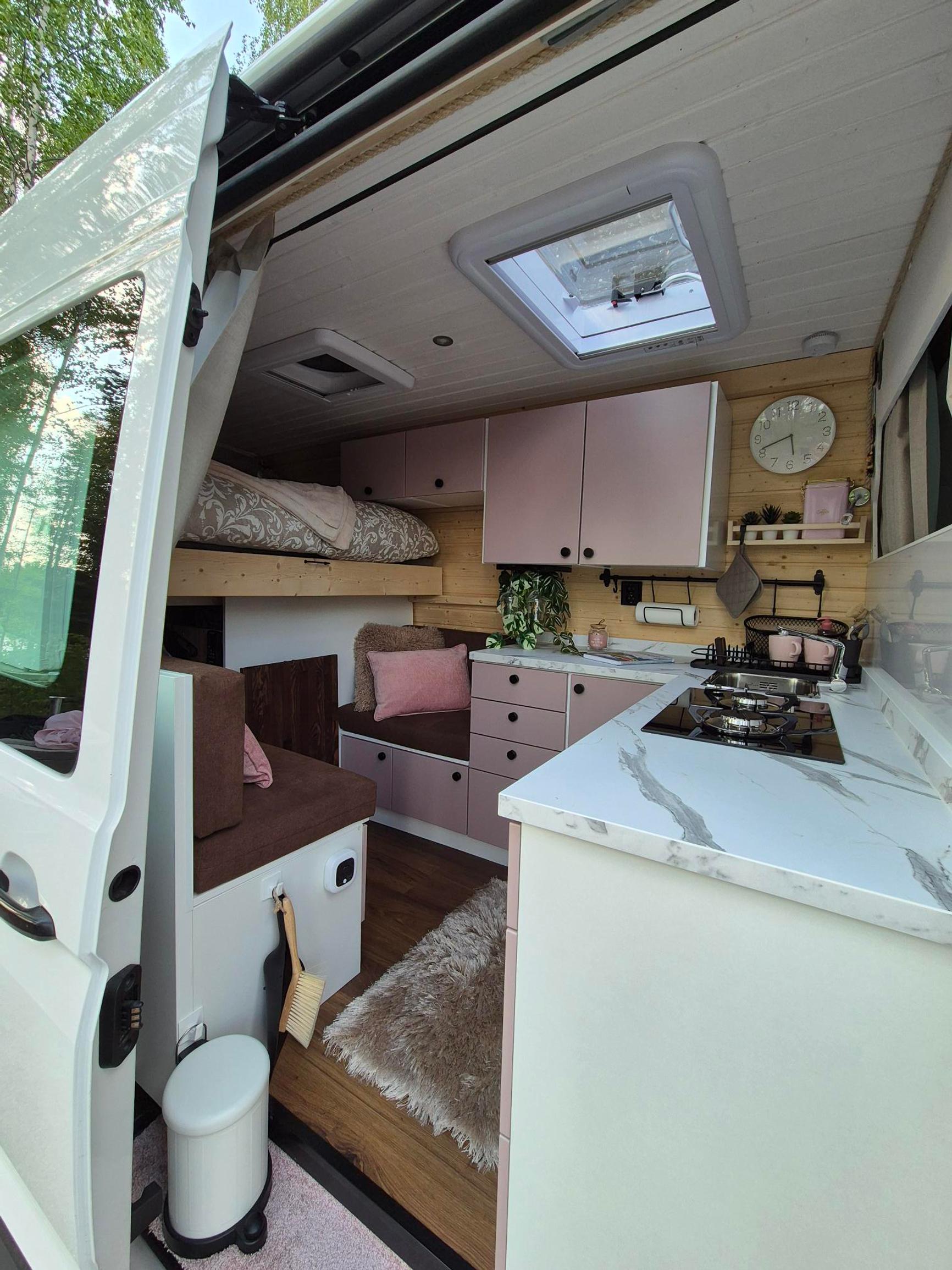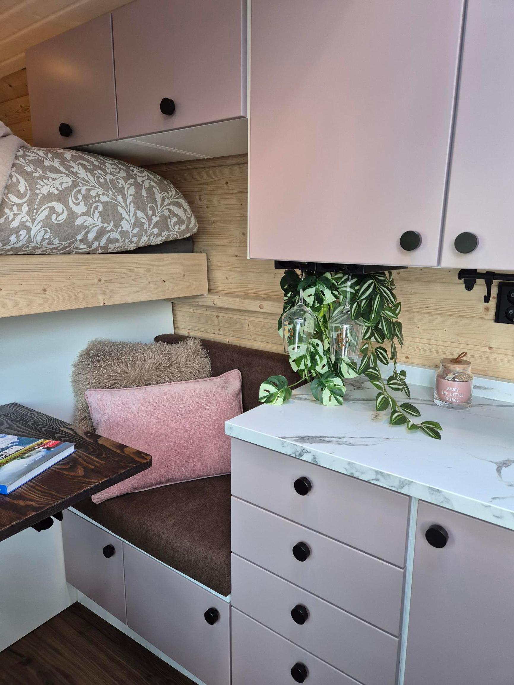 Suunnittelu oli yllättävän hauskaa, mutta myös haastavaa – erityisesti tilankäytön optimointi aiheutti päänvaivaa. Halusimme, että pakussa olisi kaikki tarpeellinen, mutta ilman, että se tuntuisi ahtaalta. Halusimme myös riittävästi säilytystilaa. Piirsimme monta versiota pohjapiirroksesta ennen kuin löytyi se oikea.