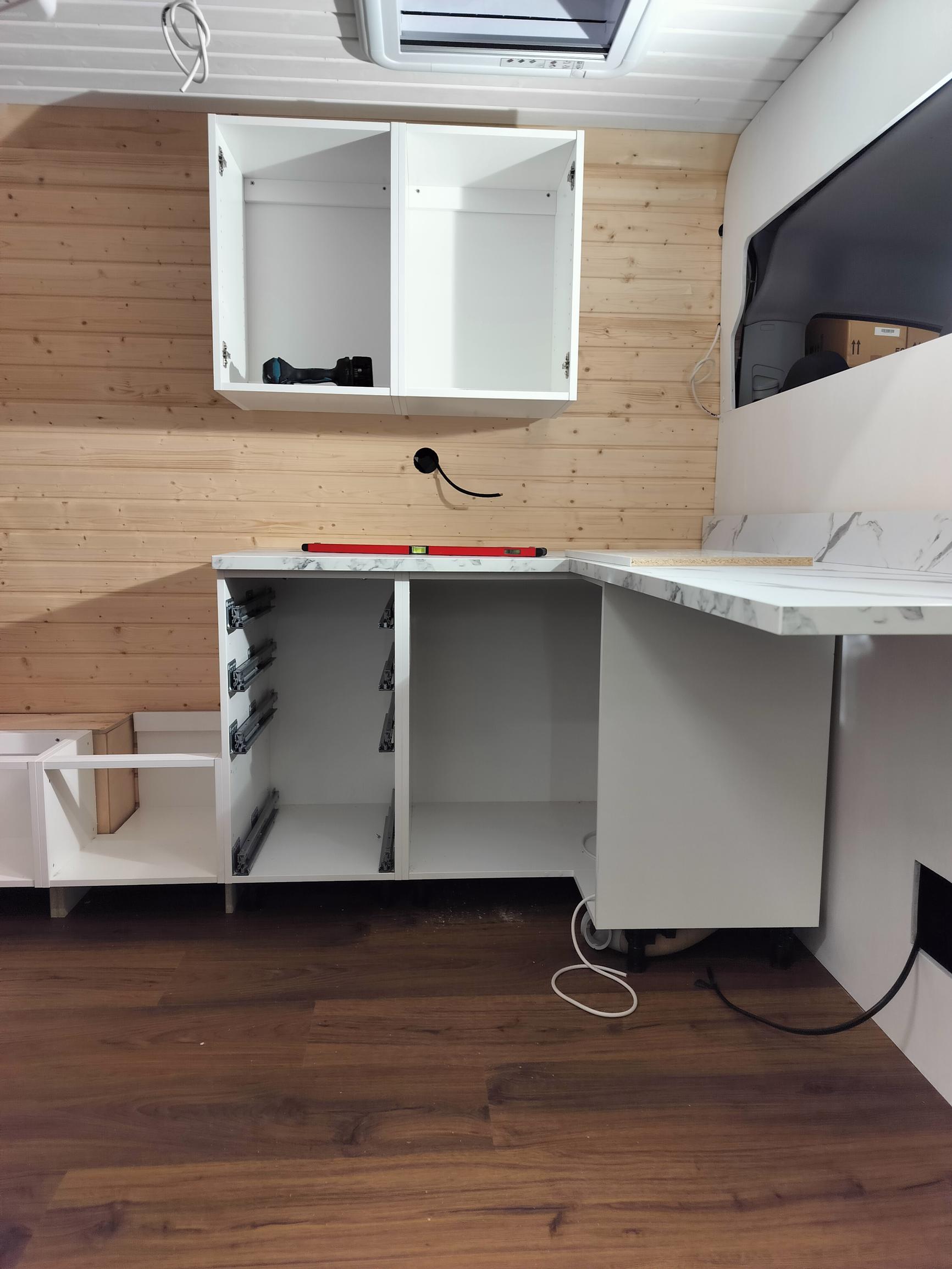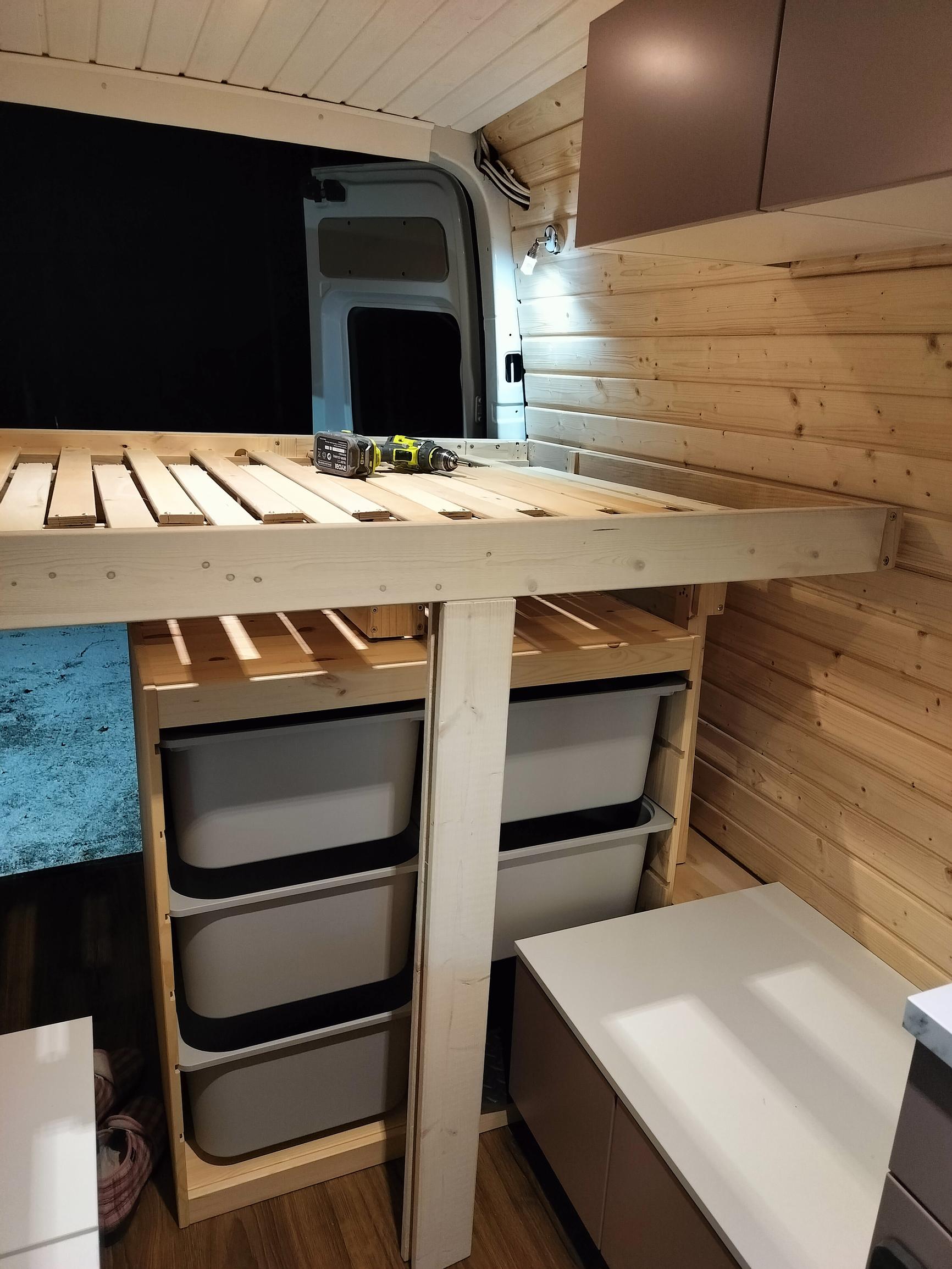 Rakentaminen kesti kolme kuukautta, sillä huhkimme vain iltaisin ja viikonloppuisin. Rakentaminen oli niin mielenkiintoista, että välillä huomasimme olevamme autotallissa vielä puoliltaöin. Kivointa oli nähdä, miten paku alkoi muuttua tyhjästä kopista kodiksi.