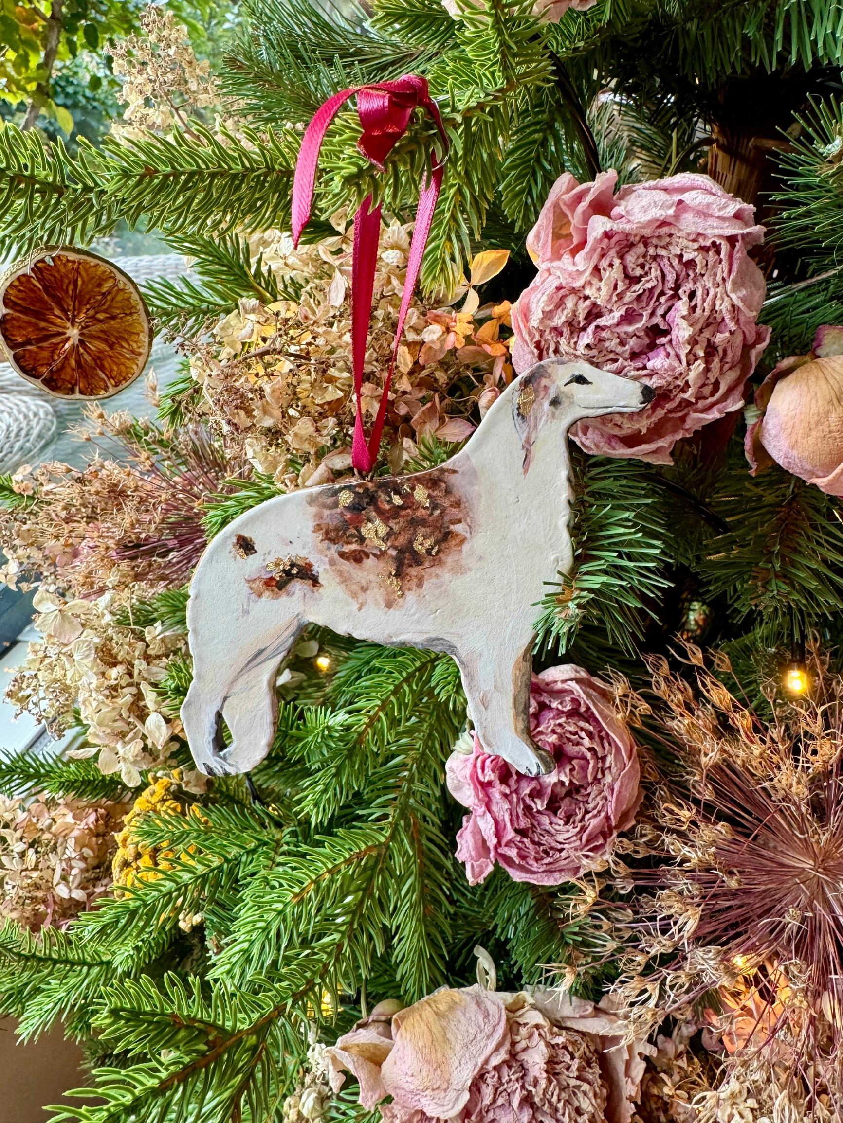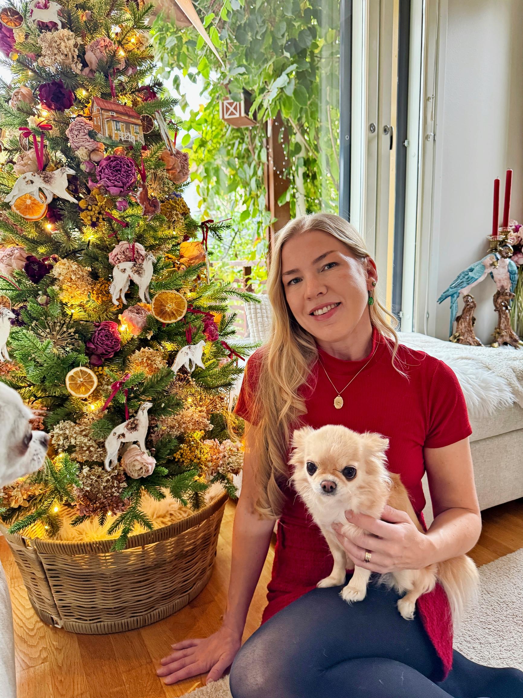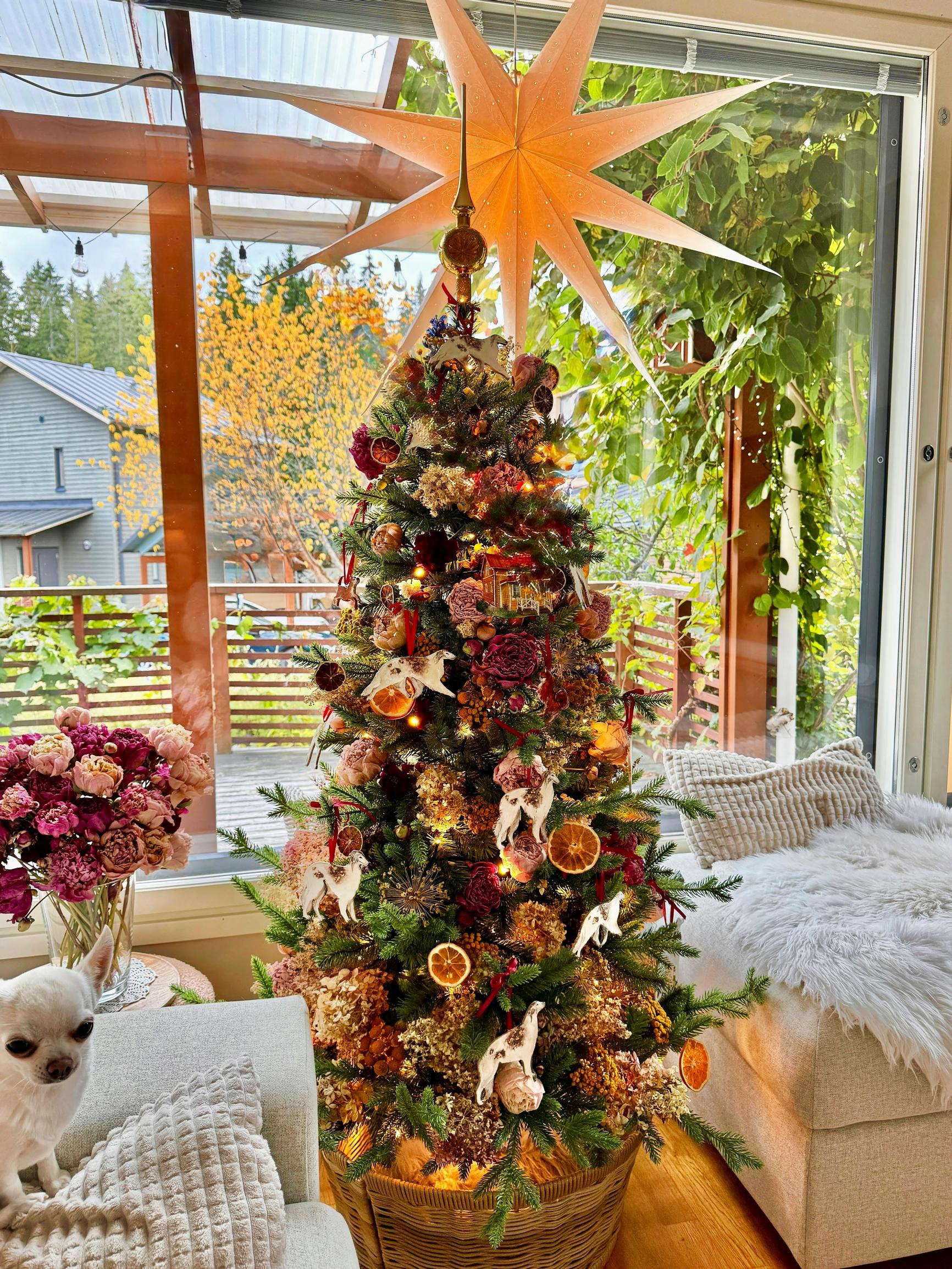 Kukkien lisäksi pikkujoulukuusessani on kuivattuja sitruksia ja itse savesta tekemiäni koirakoristeita. Vinttikoirakoristesarja on tehty edesmenneen koiramme Irman muistoksi. Kuusessa on myös pienet näköiskoristeet nykyisistä koiristamme.