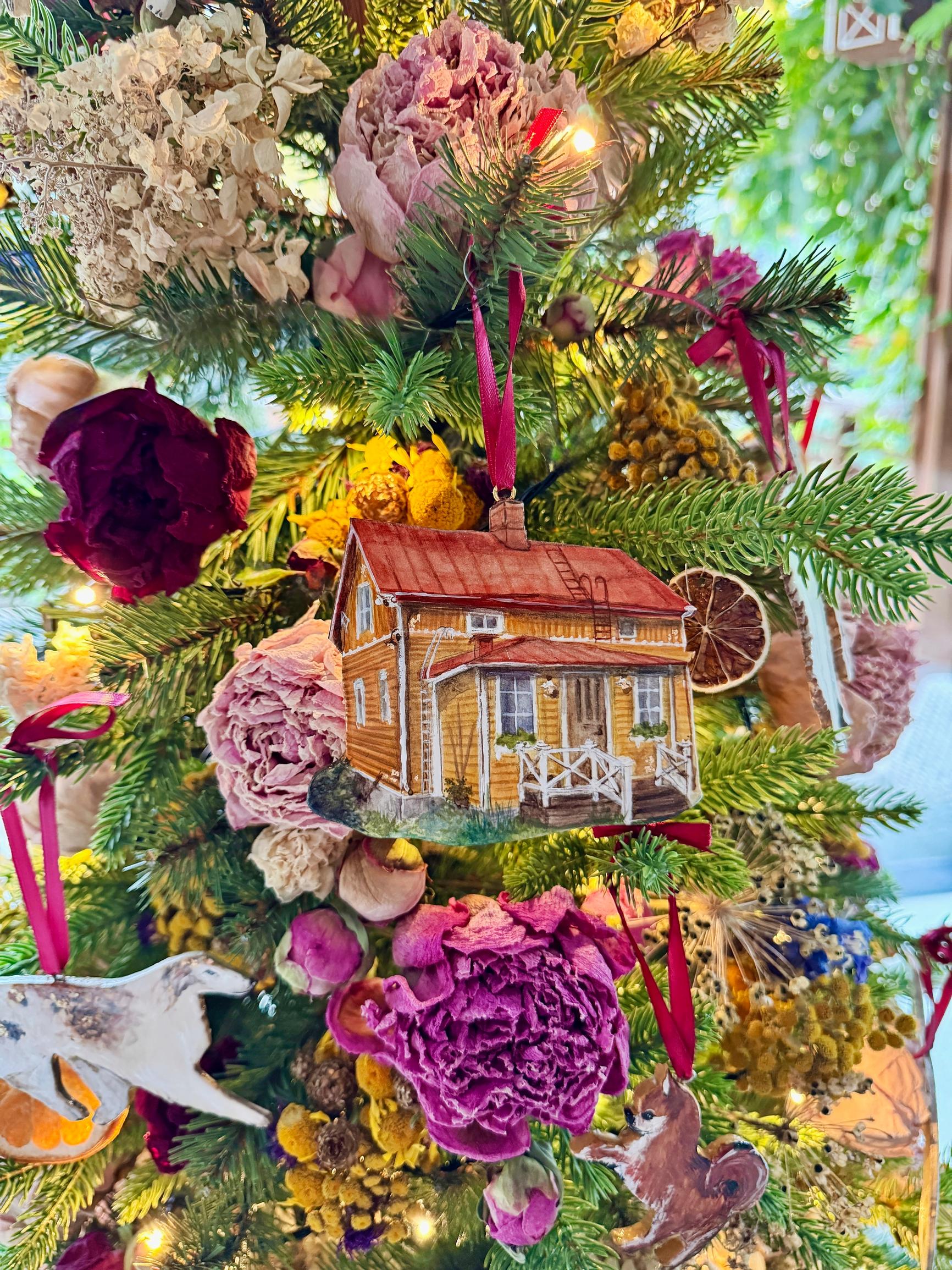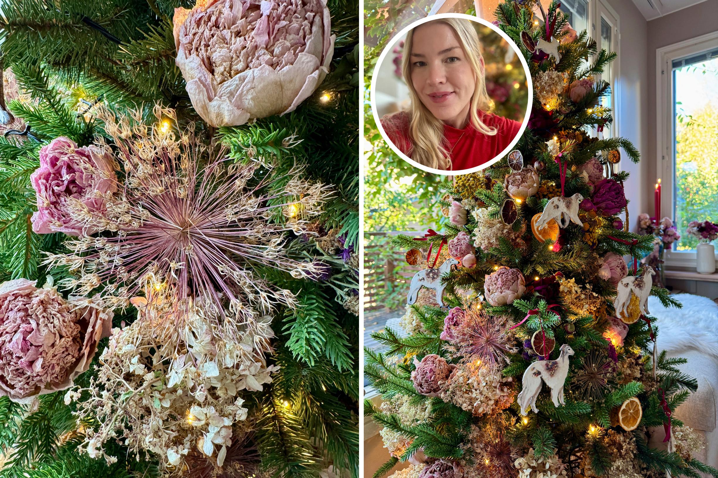 Riikka Huttunen rakastaa joulua niin paljon, että aloittaa valmistelut jo elokuussa. Tänä vuonna hän keksi idean pikkujoulukuusesta, jotta pääsee nauttimaan joulukuusen tuomasta taiasta jo syksyllä. Oksille hän ripusti kesän kukkasadon ja itse tehdyt koristeet.
