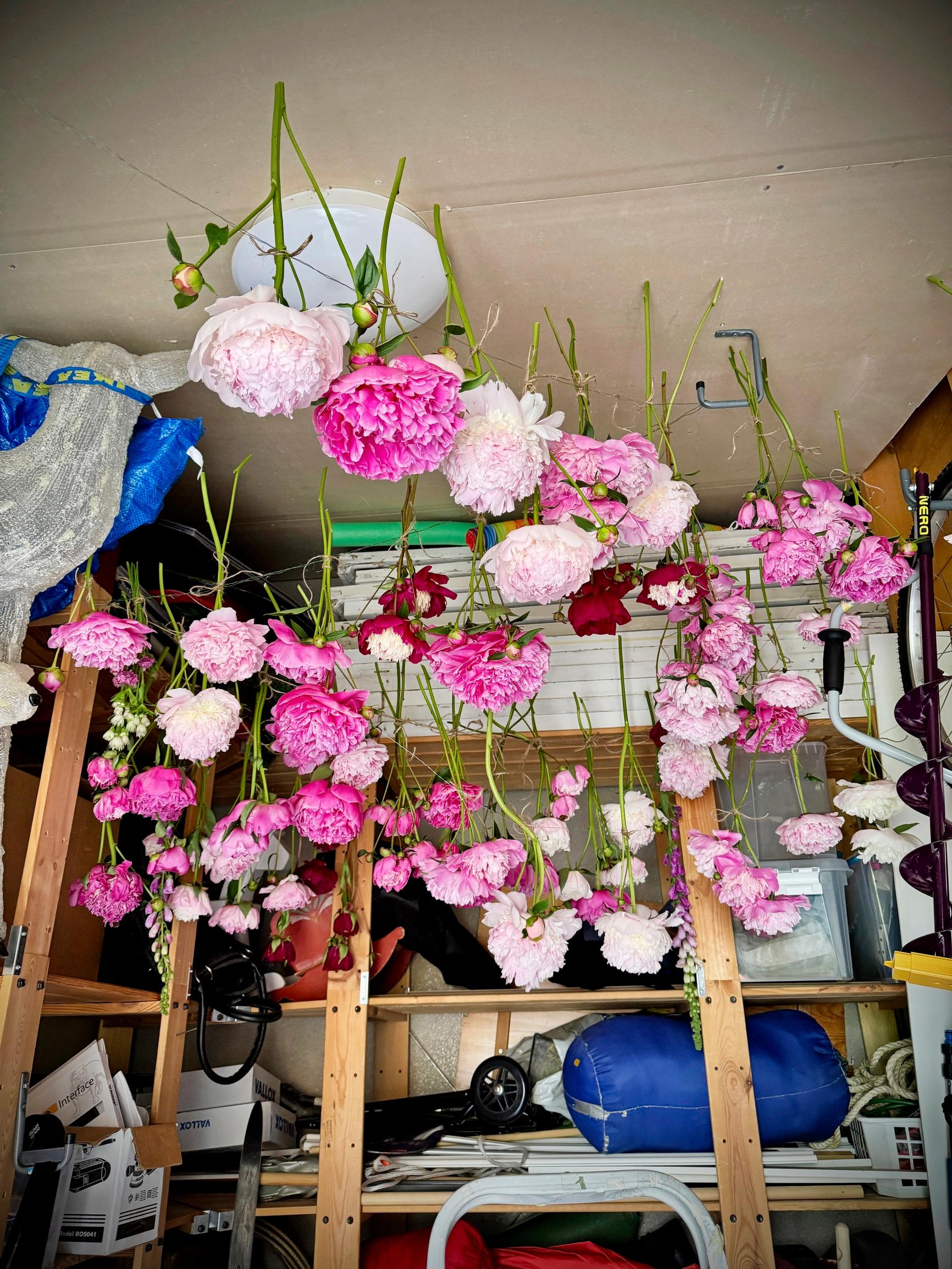 ”Sää pionien kukinta-aikaan oli suorastaan onneton, joten raaskin leikata sadat kukinnot kuivumaan heti niiden puhjettua.”