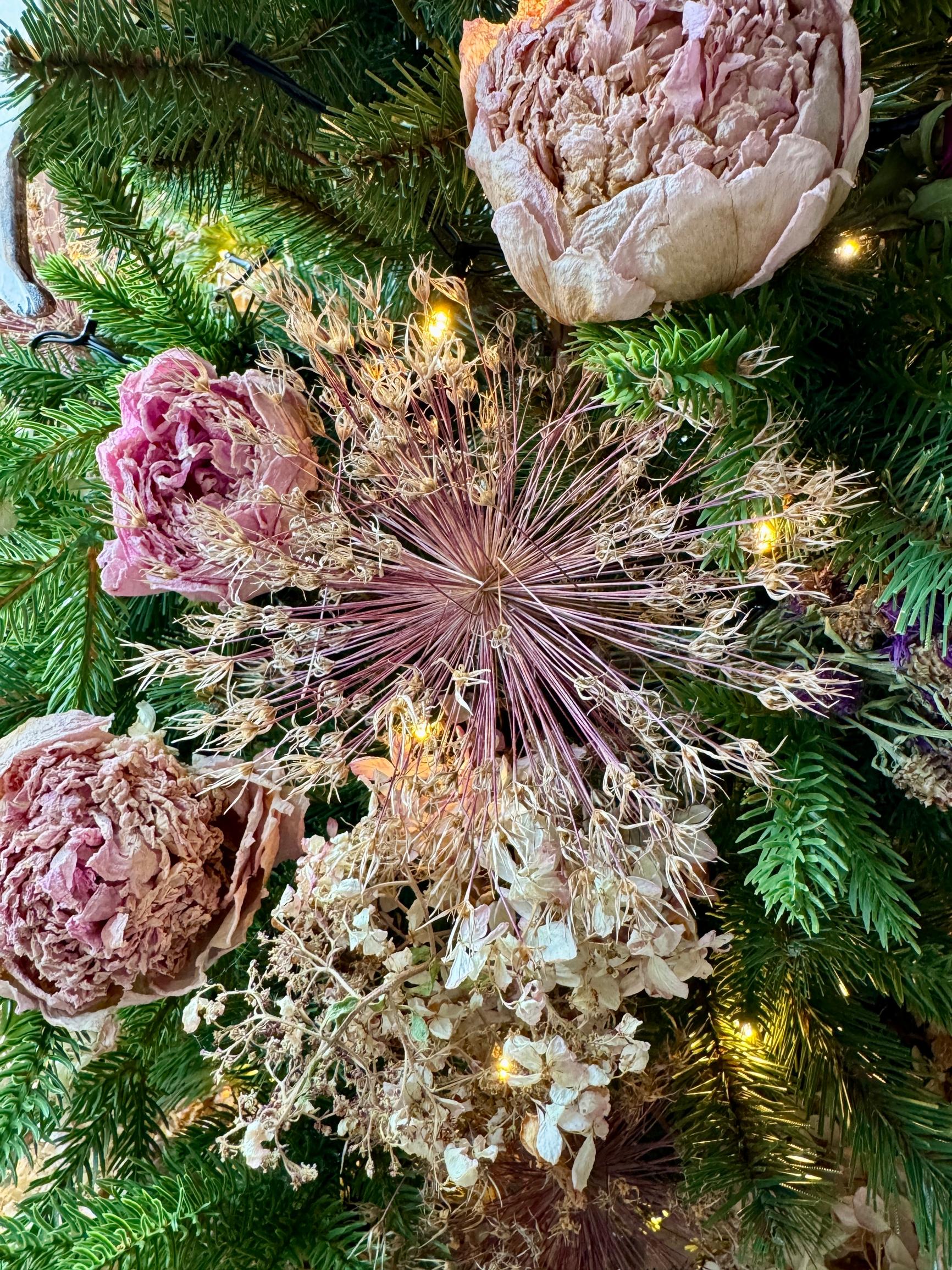 Jouluni teema on tänä vuonna ikuinen kesä, ja siitä lähti ajatus kuivata kesän kukkaloisto kuuseen. Osan kukista säästin varsinaiseen kuuseen.