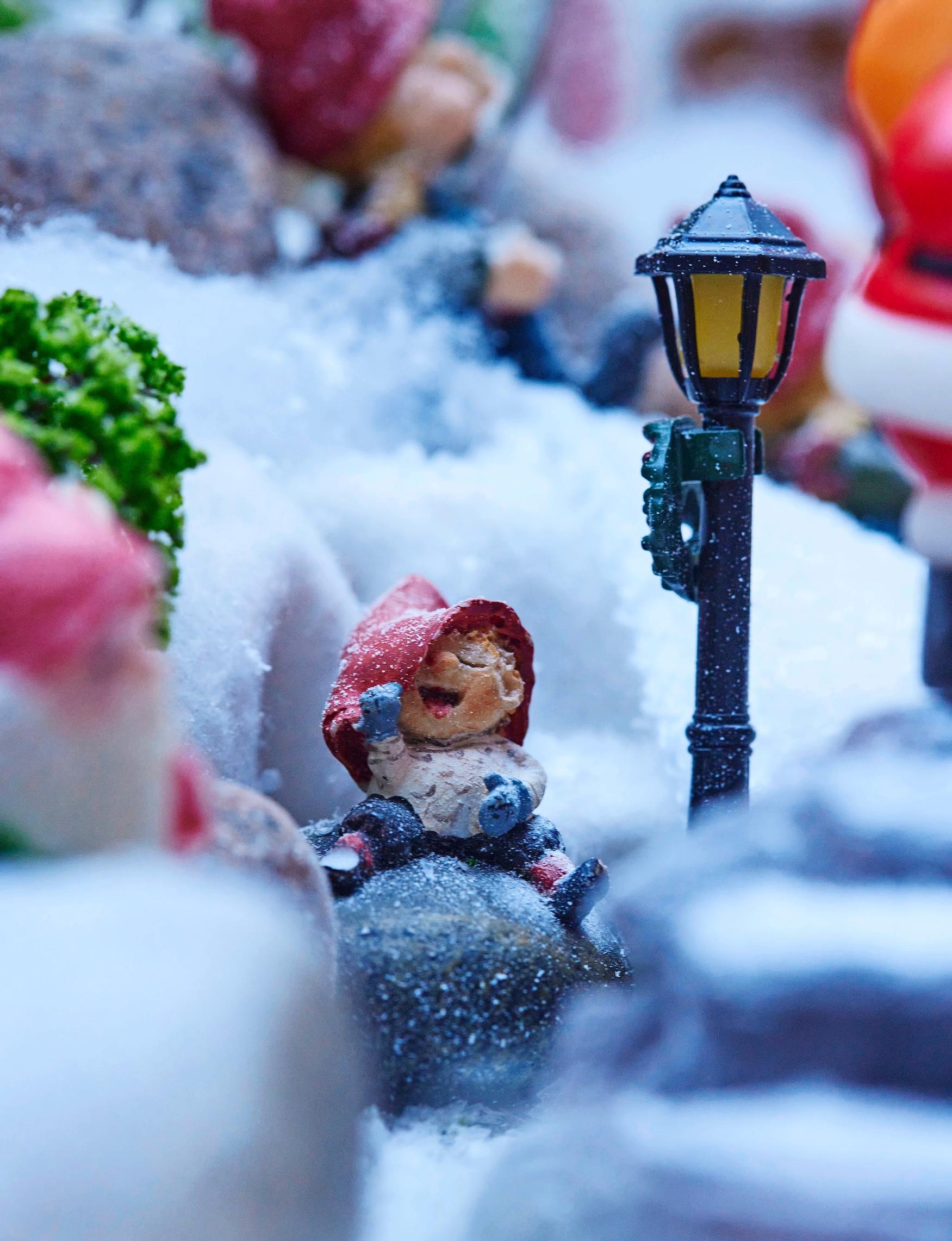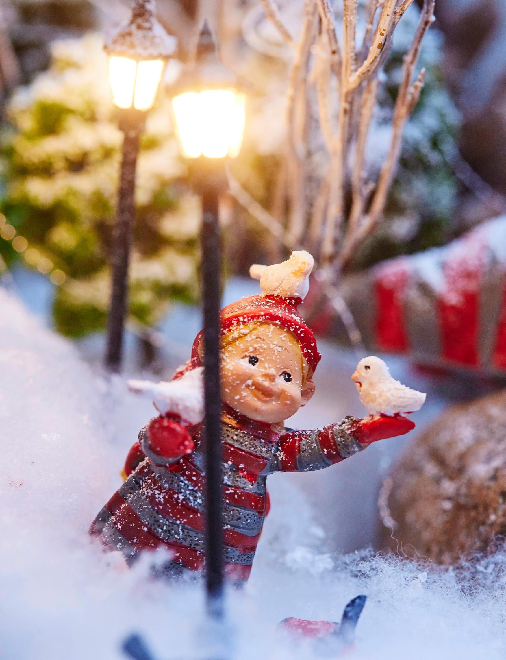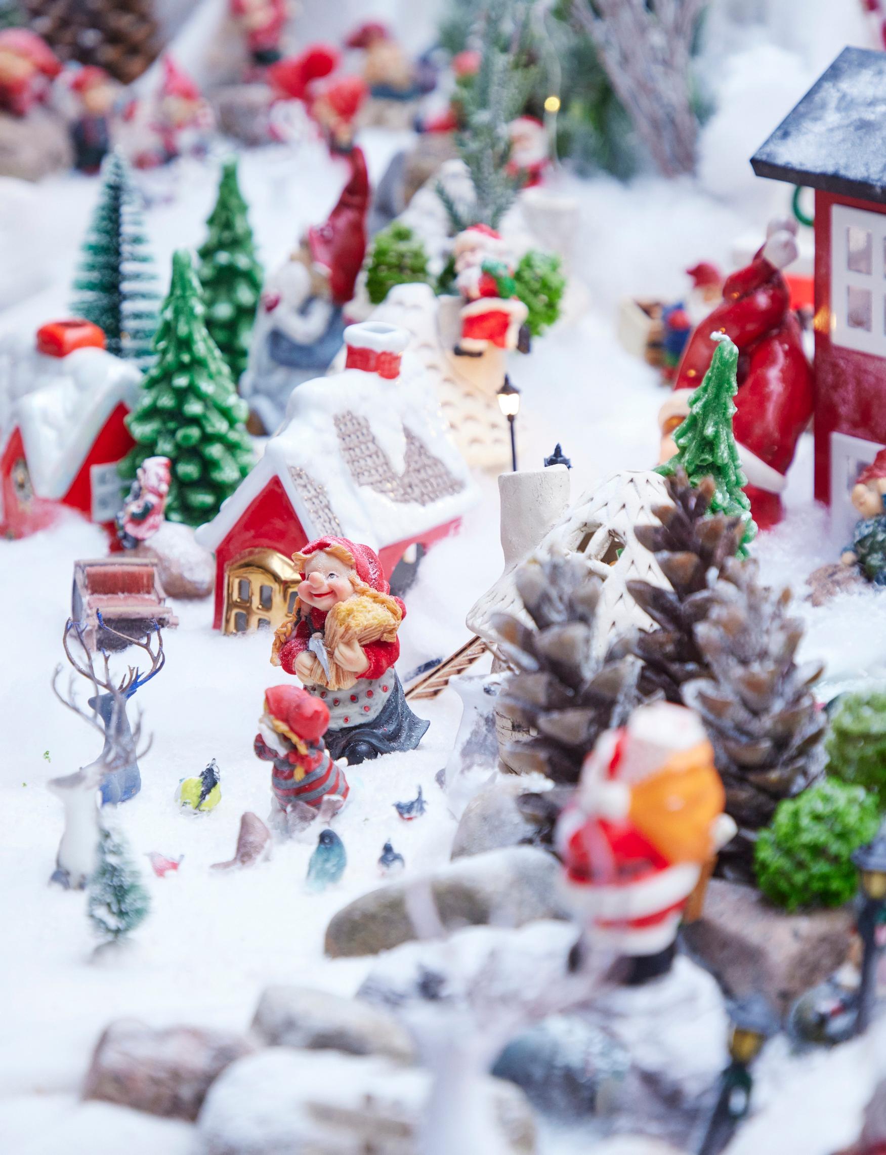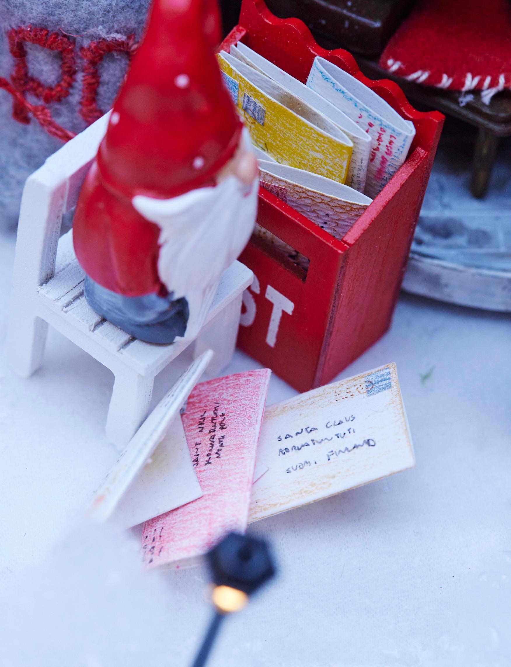 Toteutan asetelman pienellä budjetilla. En tee tyylillisesti yhteneväistä joulukylää, vaan käytän paljon erilaisia esineitä sekaisin. Jos löydän esimerkiksi kivan lintulaudan tai kynttilälyhdyn, sellainen saattaa sopia Tonttulandiaan taloksi. Mieheni rakentelee asetelmaan valaistuksia. Hän on myös tehnyt 3D-tulostimella kaikenlaista pientä, kuten poroja, taloja, sillan ja kuun. Myös tyttäret ovat avustaneet. Yksi tyttäristäni näpersi pieniä kirjeitä tonttujen postitoimistoon.