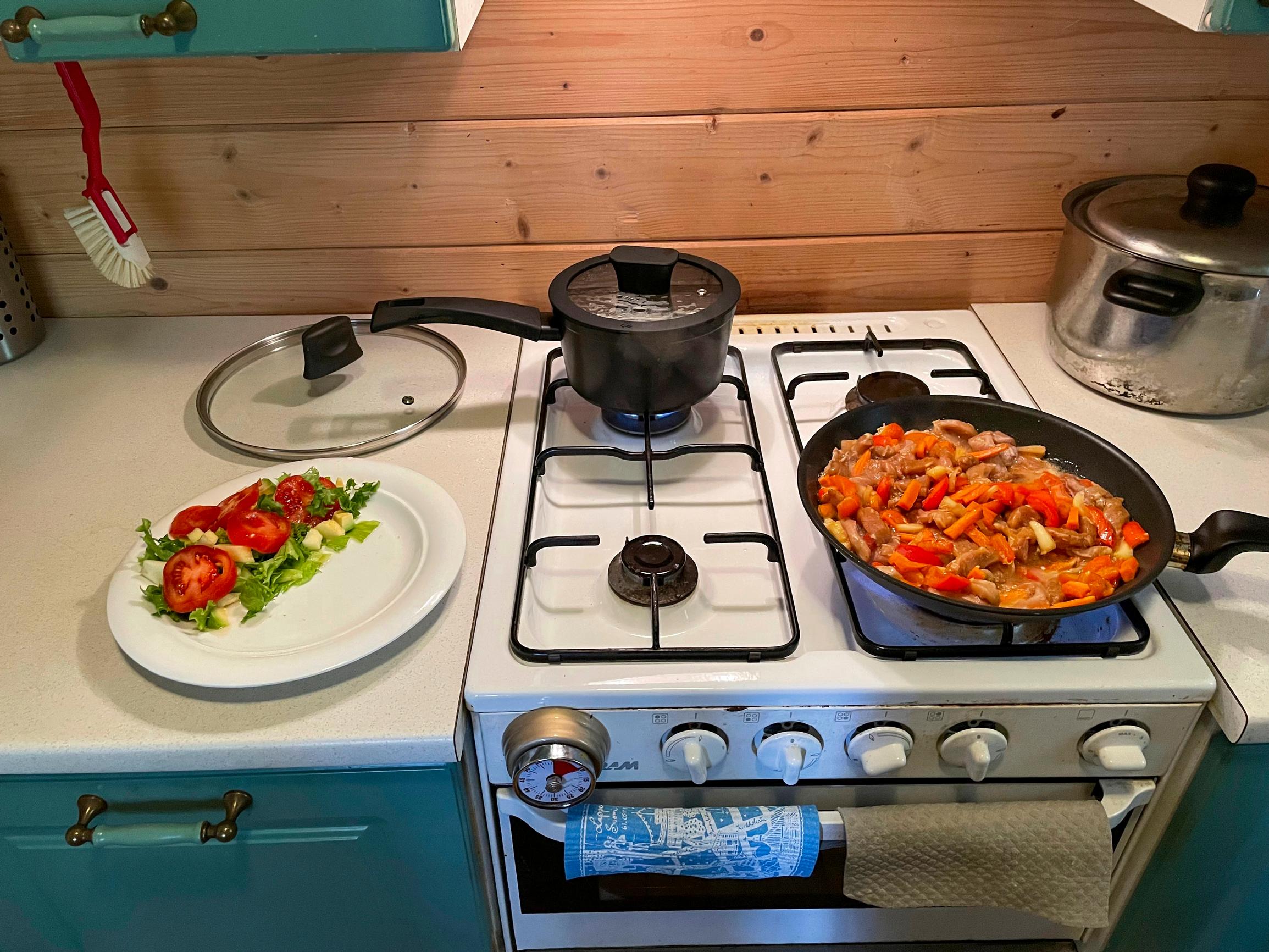 Kun mökki on venematkan päässä, sinne ei tule vietyä mitään turhaa. Totta kai saaressa on myös kuivaruokavarasto ja säilykkeitä. Teen usein ruokien esivalmistelut jo kaupungissa. Esimerkiksi lihapadan ainekset vien saareen valmiiksi pilkottuina ja marinoituina. Keitot teen ihan valmiiksi ja lämmitän mökillä.