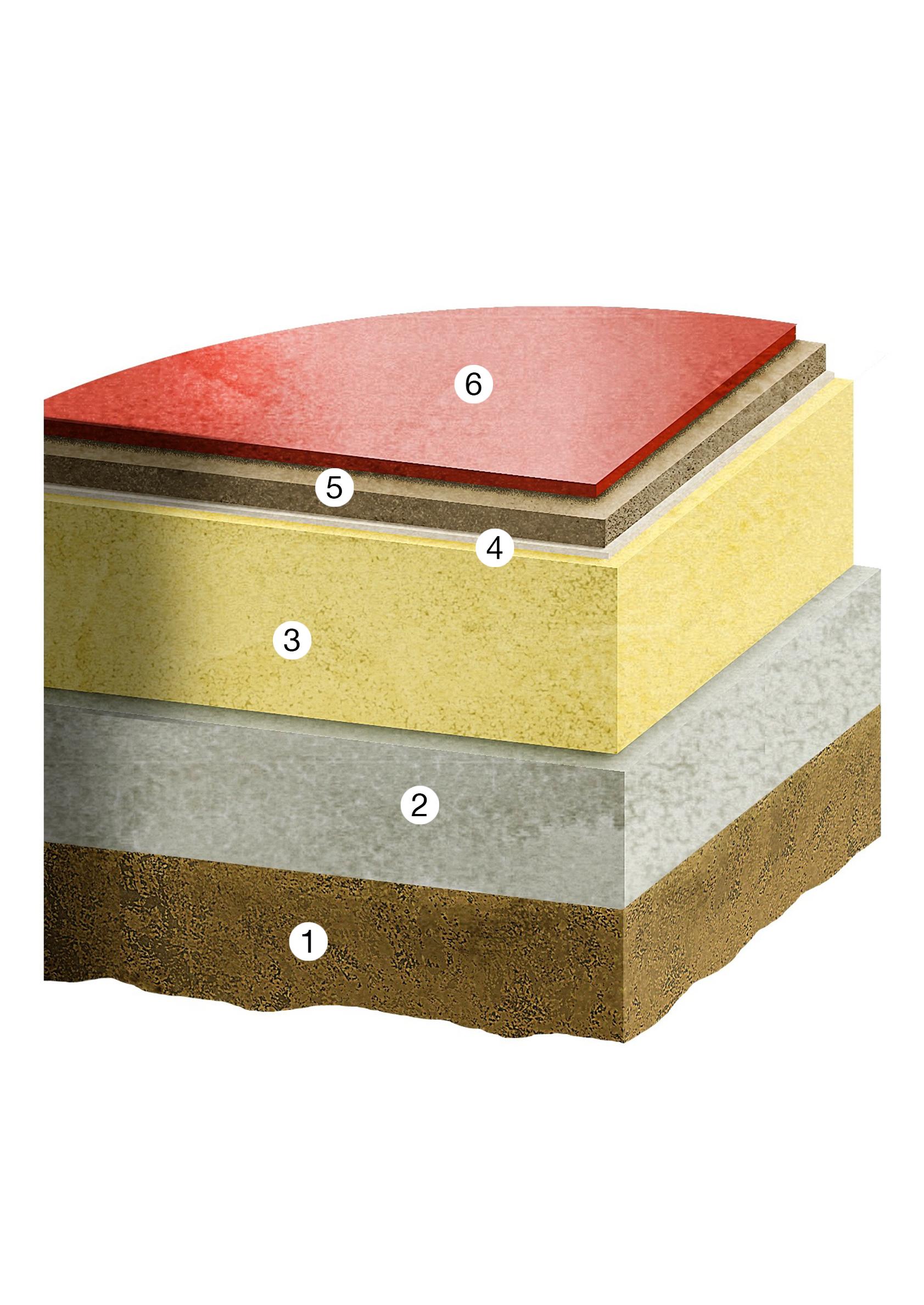 1. hiekka tai sora 2. betonilaatta 3. puukoolaus + pehmeä eristevilla 4. höyrynsulkumuovi 5. lattialastulevy 6. pintamateriaali