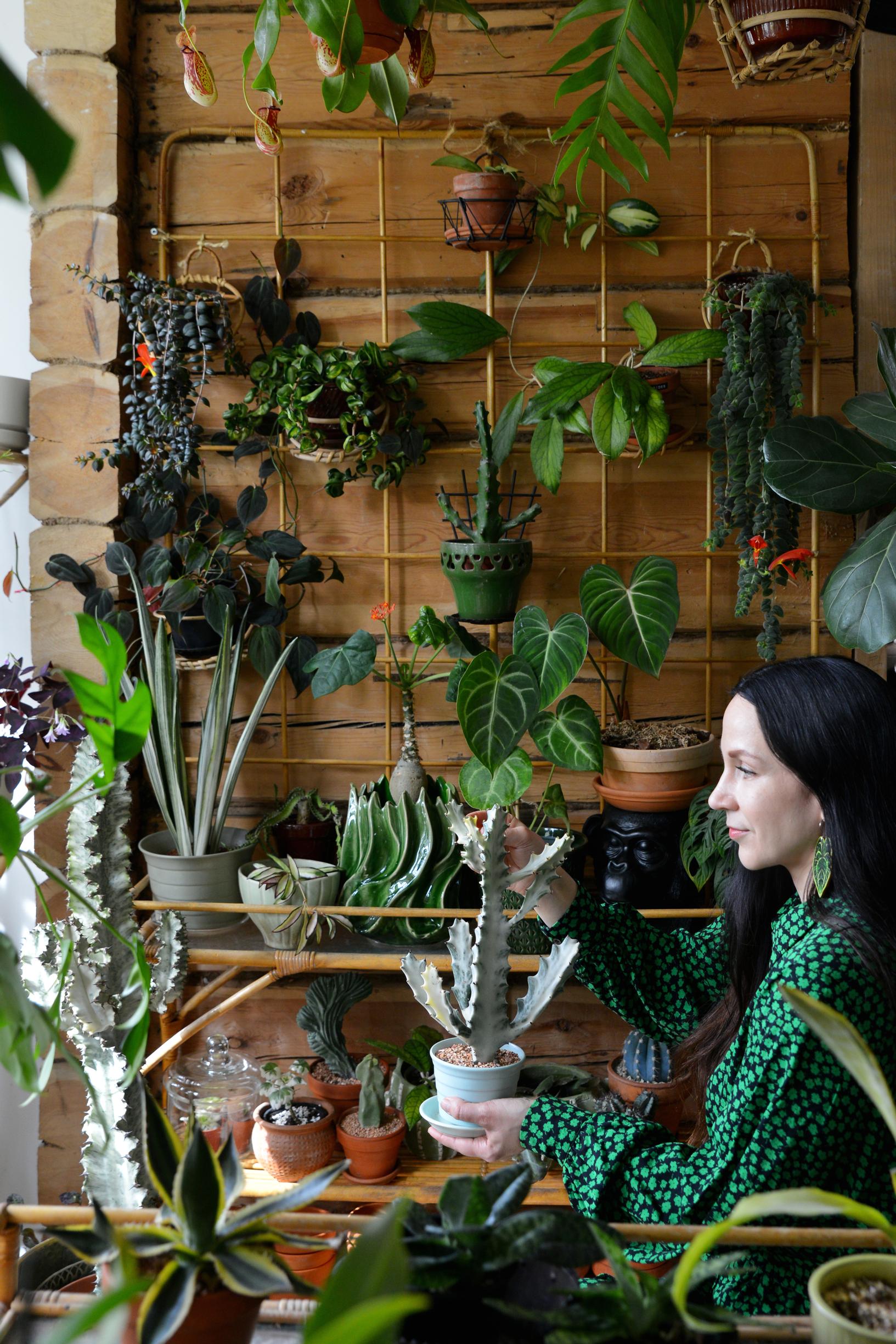 Kasviryhmiä on sijoitettu kodissa eri tasoille, ja näkymä on kuin sademetsästä, missä orkideat, peikonlehdet, saniaiset, ilmakasvit ja muut epifyytit eli päällyskasvit kasvavat puiden oksilla. Näyttäviä lehtikaktuksia ja kannukasveja killuu katonrajassa kasvilamppujen tuntumassa, ja kymmeniä erilaisia posliinikukkia kiertää seinillä. Kasvit ovat saaneet suojakseen vanhoja Arabian ja Kupittaan Saven ruukkuja sekä metallisia ja solmittuja vintage-amppeleita.