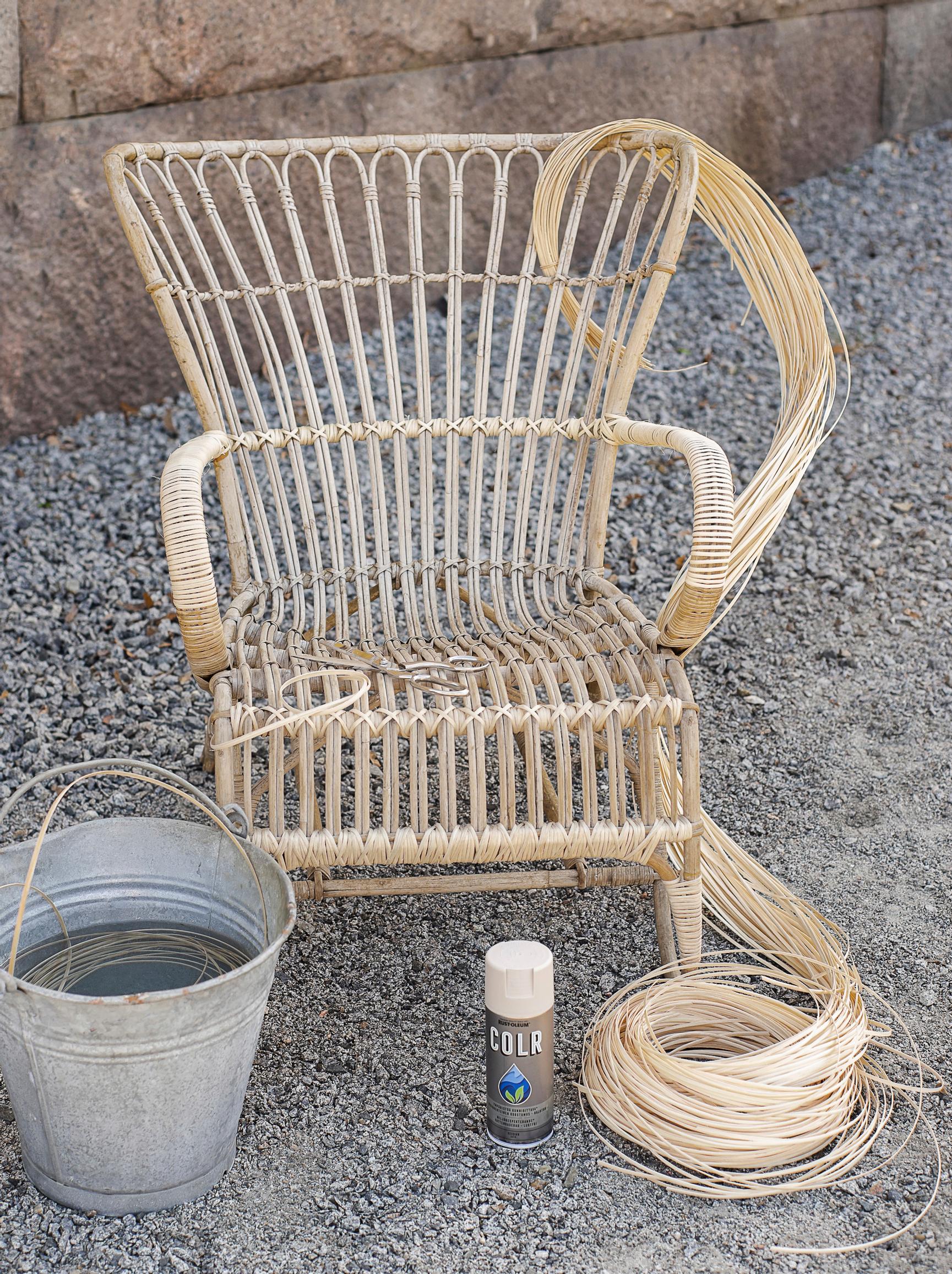 - Liota rottinkinauhaa vedessä muutama tunti tai yön yli, jotta nauhasta tulee taipuisaa ja voit korjata sillä tuolin sidoksia helposti. Kieputa rottinkinauhaa paksujen rottinkien ympärille, ota mallia sidoksista tai kieputa kuten haluat. Päättele rottinkinauhat huolella.