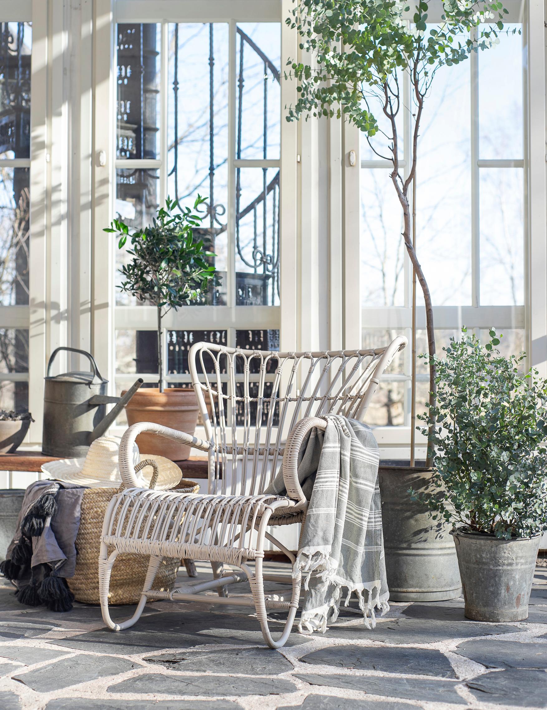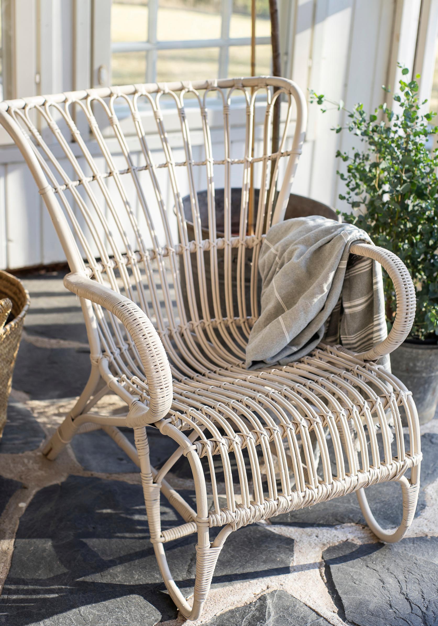 ”Rottinkikaluste on helppo maalata spraymaalilla. Kokeile trendikästä armeijanvihreää tai pehmeää beigeä.”