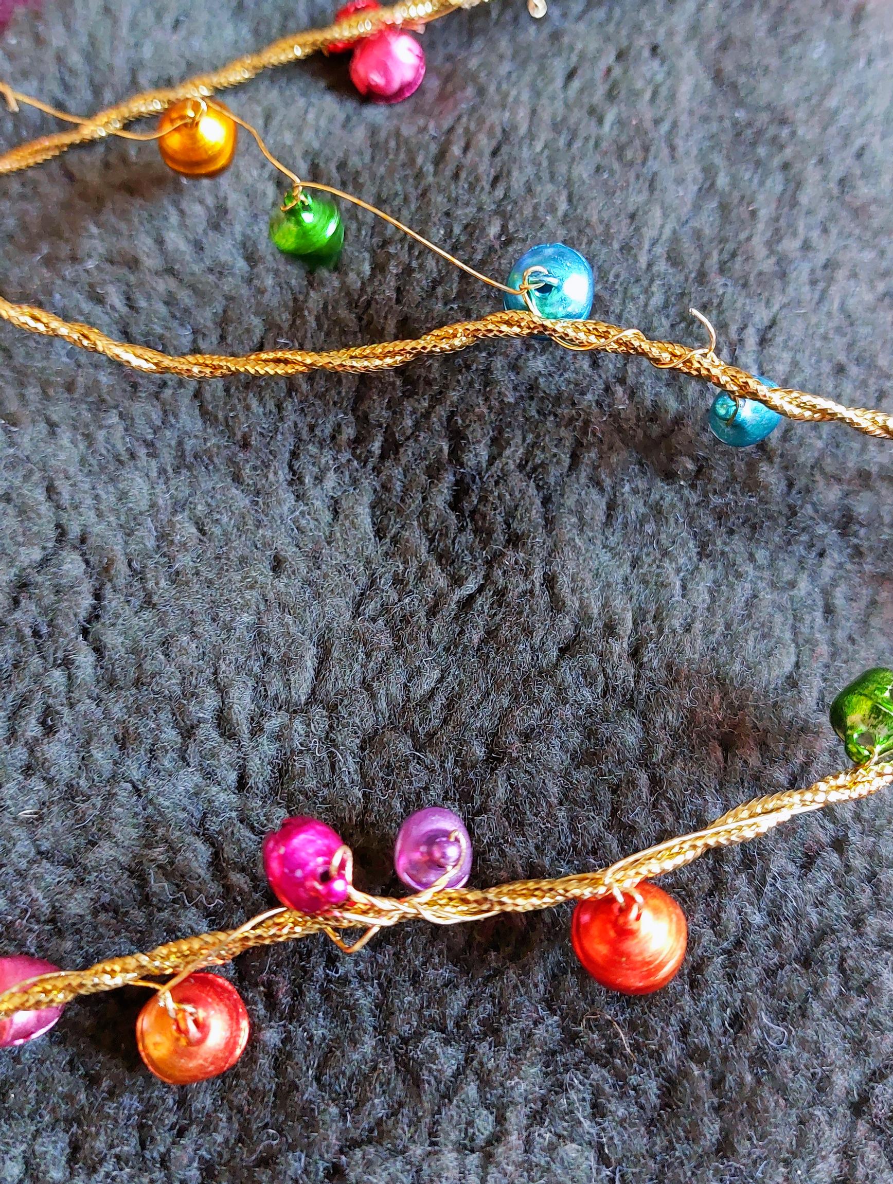 7. Koristele kuusi. Virittele kultanauhaa oksalta toiselle. Kiinnitä se useasta kohdasta muutamalla huomaamattomalla pistolla. Kiinnitä kulkuset nauhaan ommellen tai, kuten mallityössä, pujota ne ensin erikoisohueen rautalankaan ja sitten kultalankaan kieputellen. Ohuenkin rautalangan päät on syytä kiertää huolellisesti kultalangan ympärille.