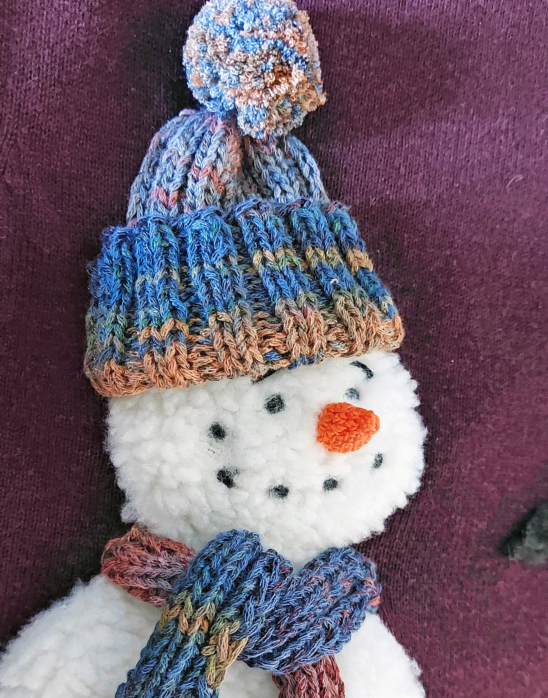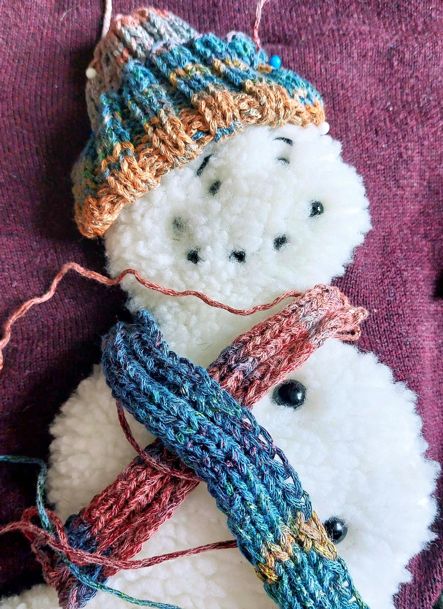 5. Neulo kaulaliina kahdesta pätkästä. Tee molempiin kaulaliinan kappaleisiin hapsut toiseen päähän. Ompele liinan hapsuttomat päät lumiukon kaulan molemmille puolille ja solmi kaulaliina yhteen.