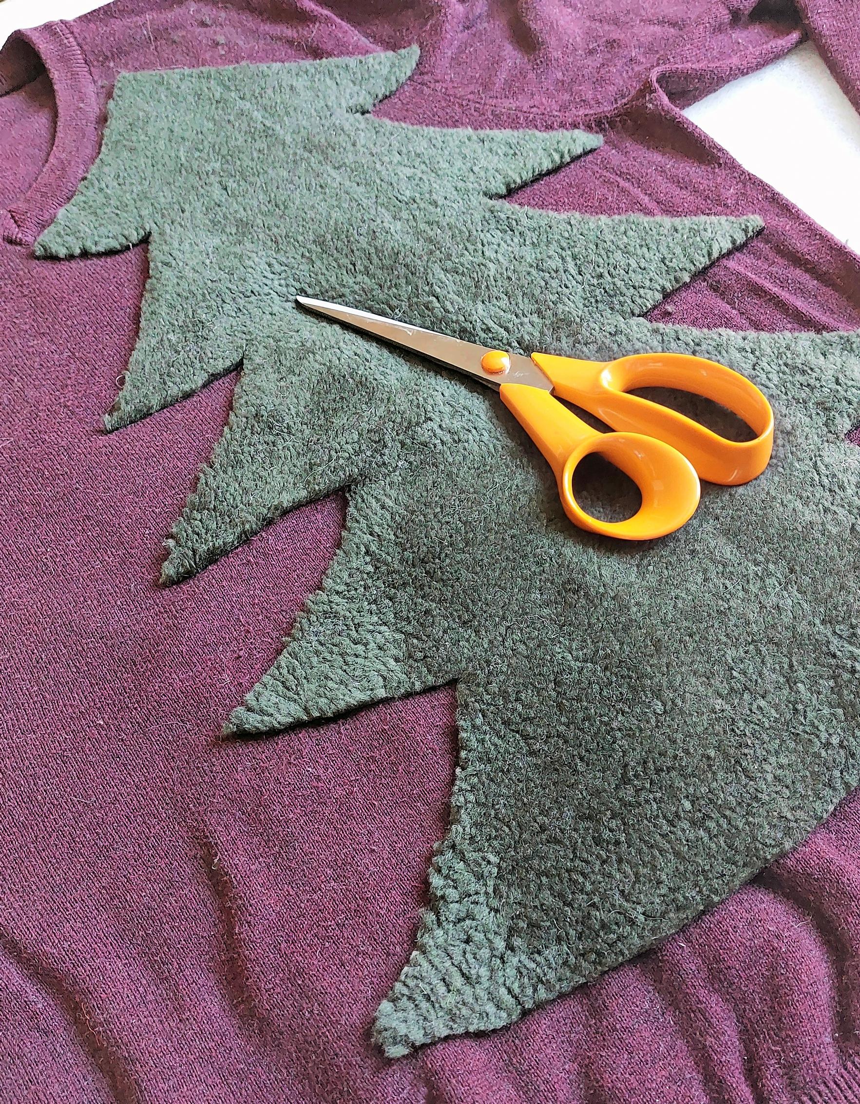 1. Piirrä isolle paperille (esim. sanomalehti tai leivinpaperi) kuusi ja lumiukko. Asettele ja neulaa kaavat neuleeseen sopivaan kohtaan. Tarkista toimivuus pukemalla pusero päälle. Varmista, etteivät kuviot häviä esimerkiksi kainaloihin. Tee vielä nietokset lumiukon ja kuusen alle.