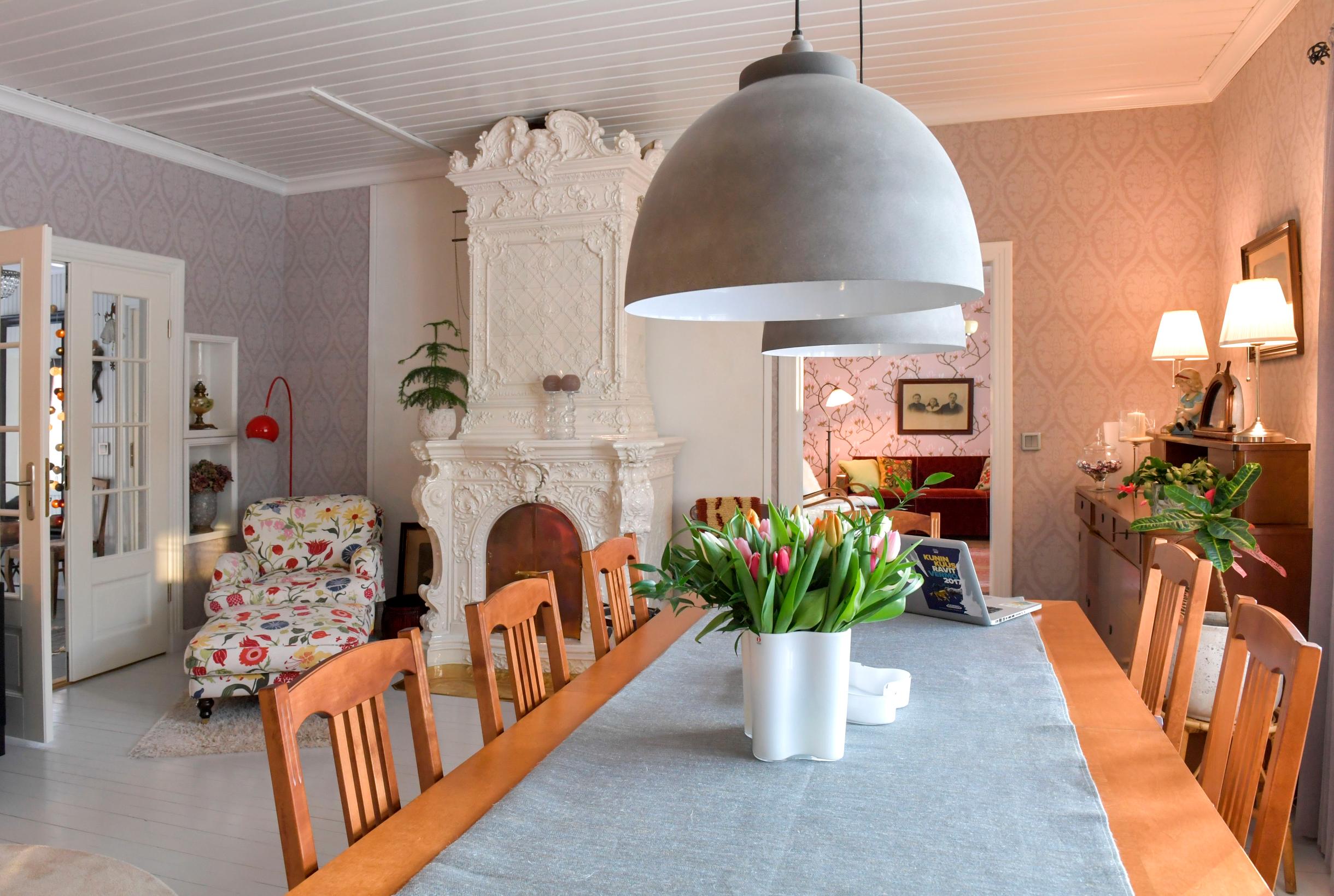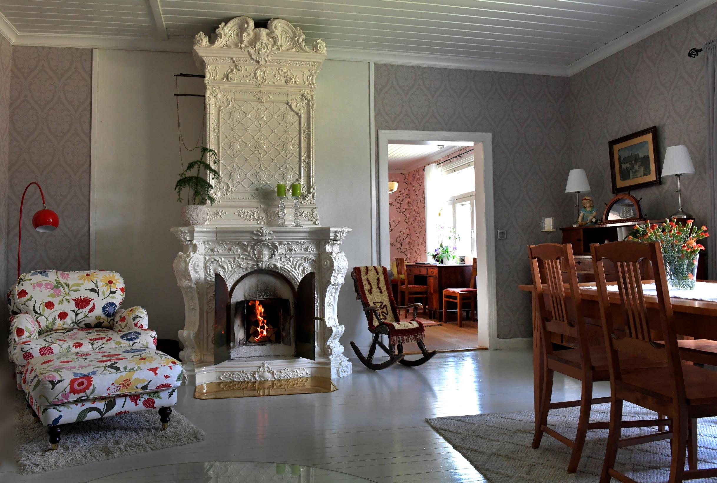 Sali kätki sisälleen myös kaakeliuunin, joka on tuotu aikanaan purjelaivalla. Nykyään se lämpiää kylmillä säillä harva se päivä.