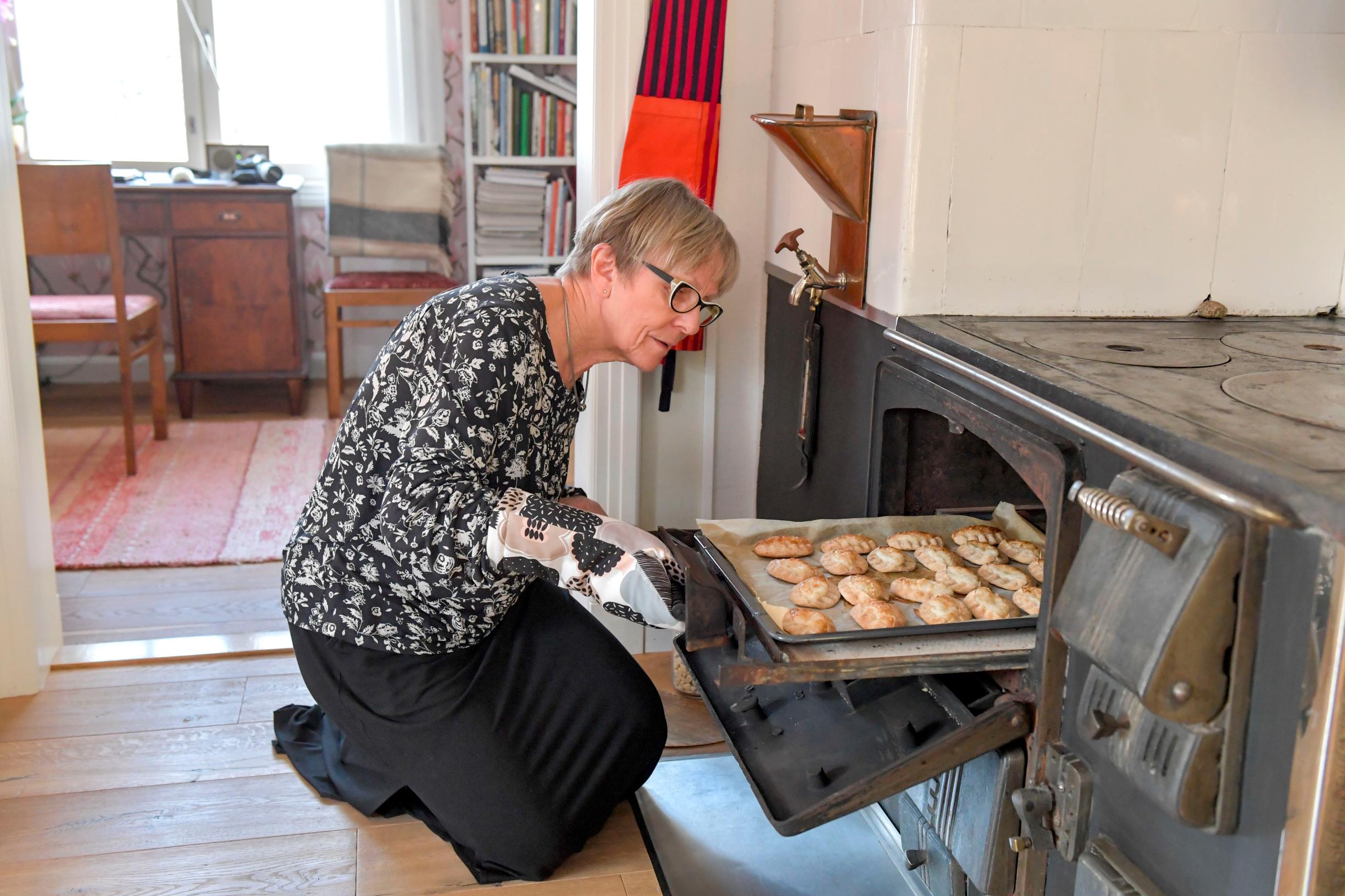 Laila Ruohola sytyttää tottuneesti tulen vanhaan puuhellaan. Vastaleivotun leivän, kakon, tuoksu on toivottanut tulijan tervetulleeksi taloon jo monen sukupolven ajan.