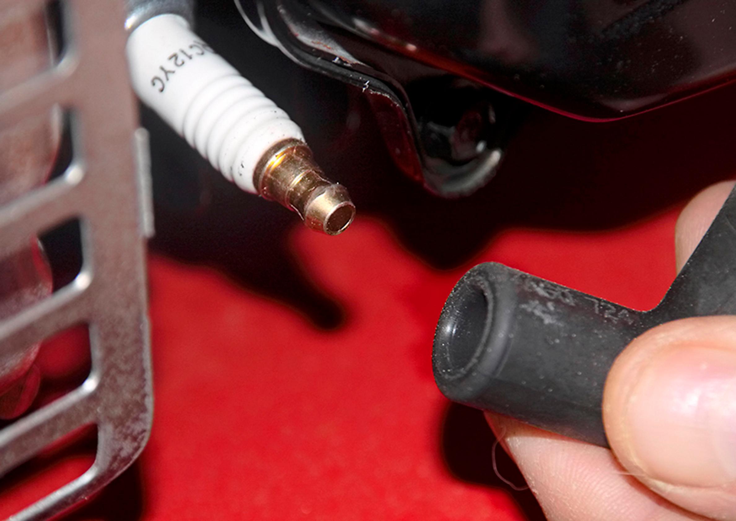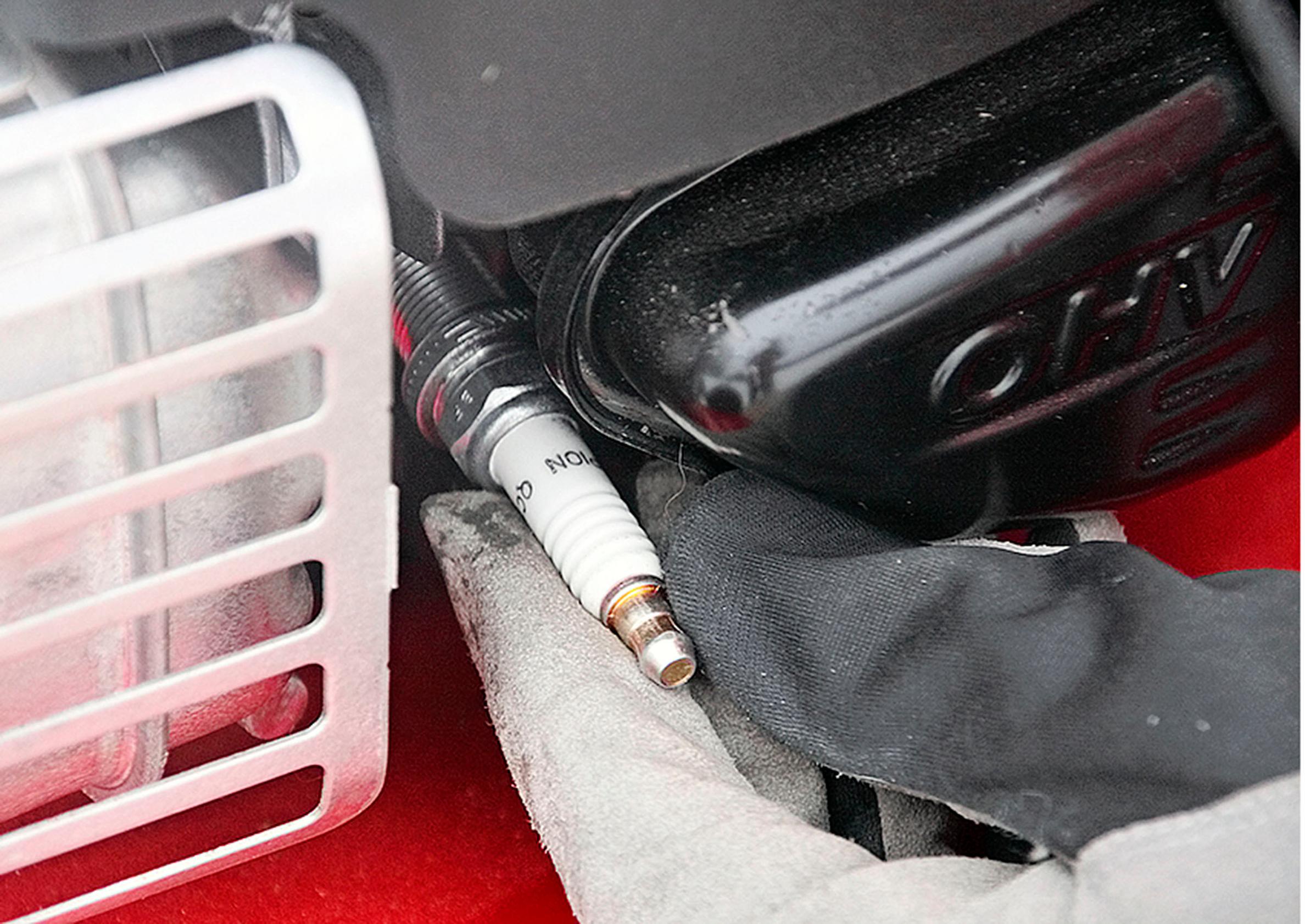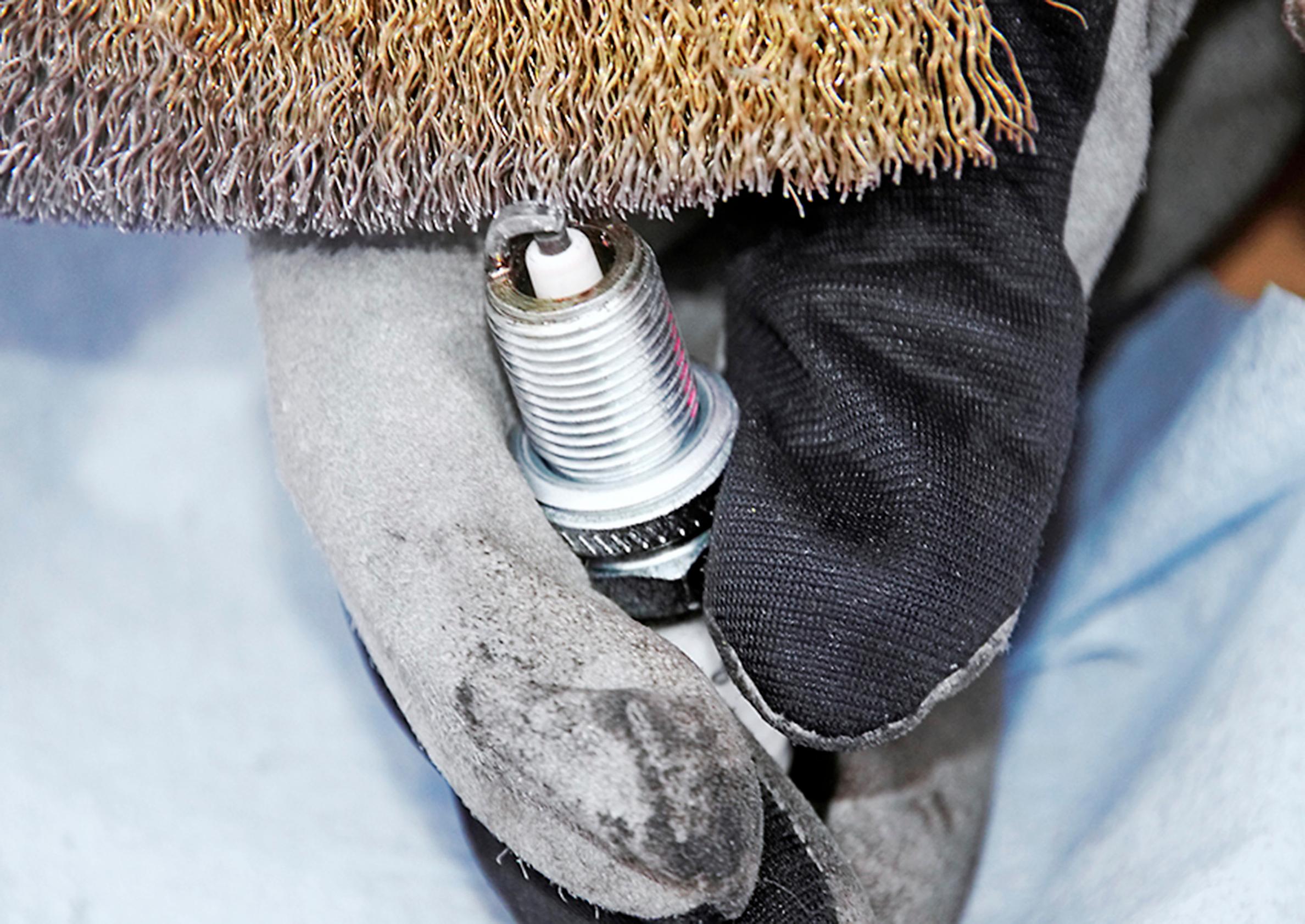 4. Puhdista ruohonleikkurin tulppa esimerkiksi teräsharjalla ja naputtele sitä ylösalaisin työpöytää vasten irtokarstan poistamiseksi. Jos tulpan kärkiväli on esimerkiksi kovan käytön seurauksena suurentunut, kannattaa ostaa uusi tulppa. Varminta on ottaa vanha tulppa malliksi kauppaan mukaan.