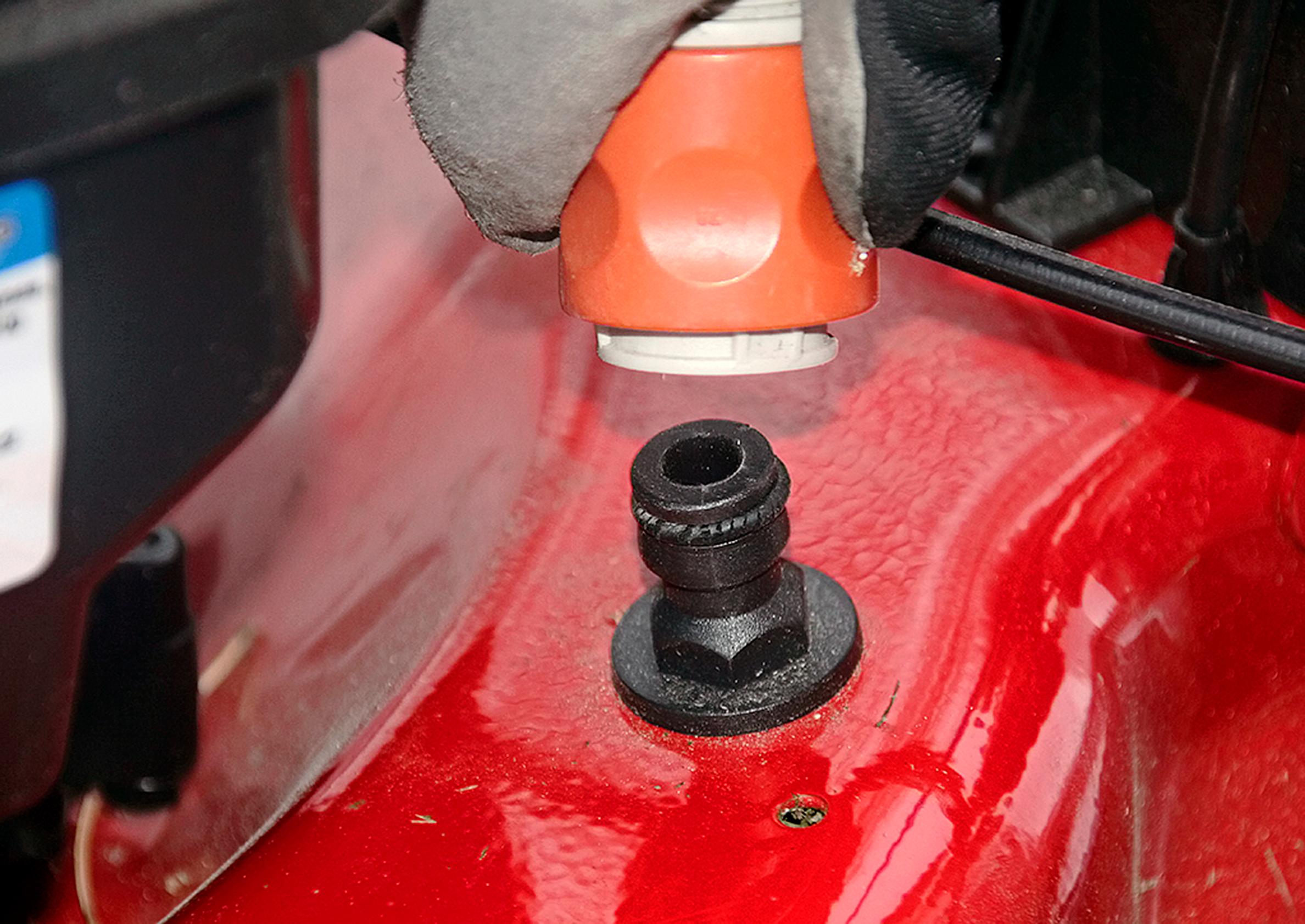 7. Uusiin ruohonleikkurimalleihin kiinnitettävä vesiletku helpottaa alustan puhdistamista kesällä käytön jälkeen. Letkun kiinnitys onnistuu esimerkiksi Gardena-liittimen avulla. Kun letku on kytketty ruohonleikkuriin, vesihana avataan ja moottori käynnistetään muutamaksi minuutiksi. Kun alusta on puhdas, ruohonleikkurin moottori sammutetaan, vesihana suljetaan ja letku irrotetaan.