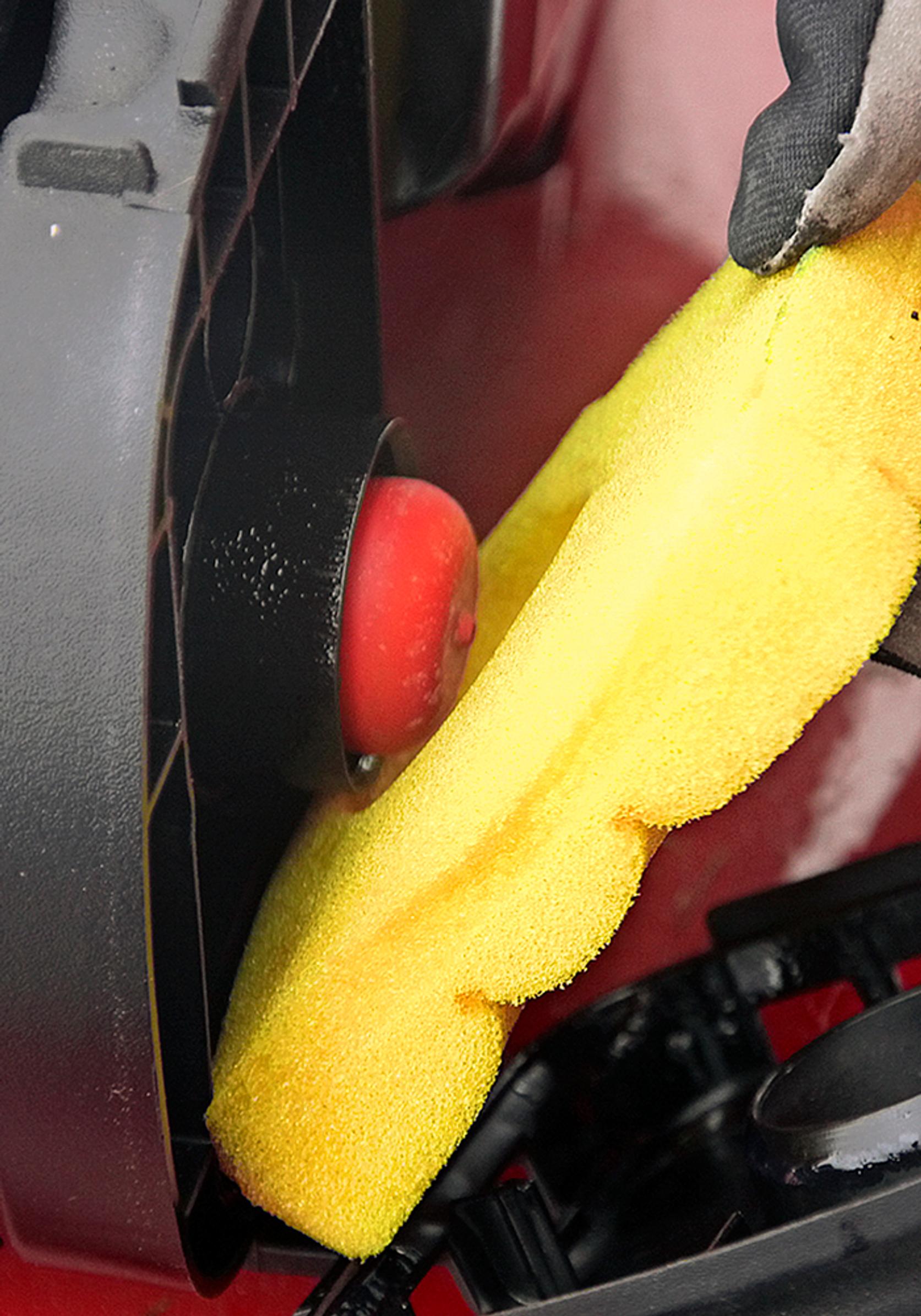 6. Kun ruohonleikkurin suodatin on pesun jälkeen kuivunut, lisää siihen tilkka moottoriöljyä estämään epäpuhtauksien pääsyä moottoriin. Purista ylimääräinen öljy pois ennen suodattimen paikoilleen laittamista.