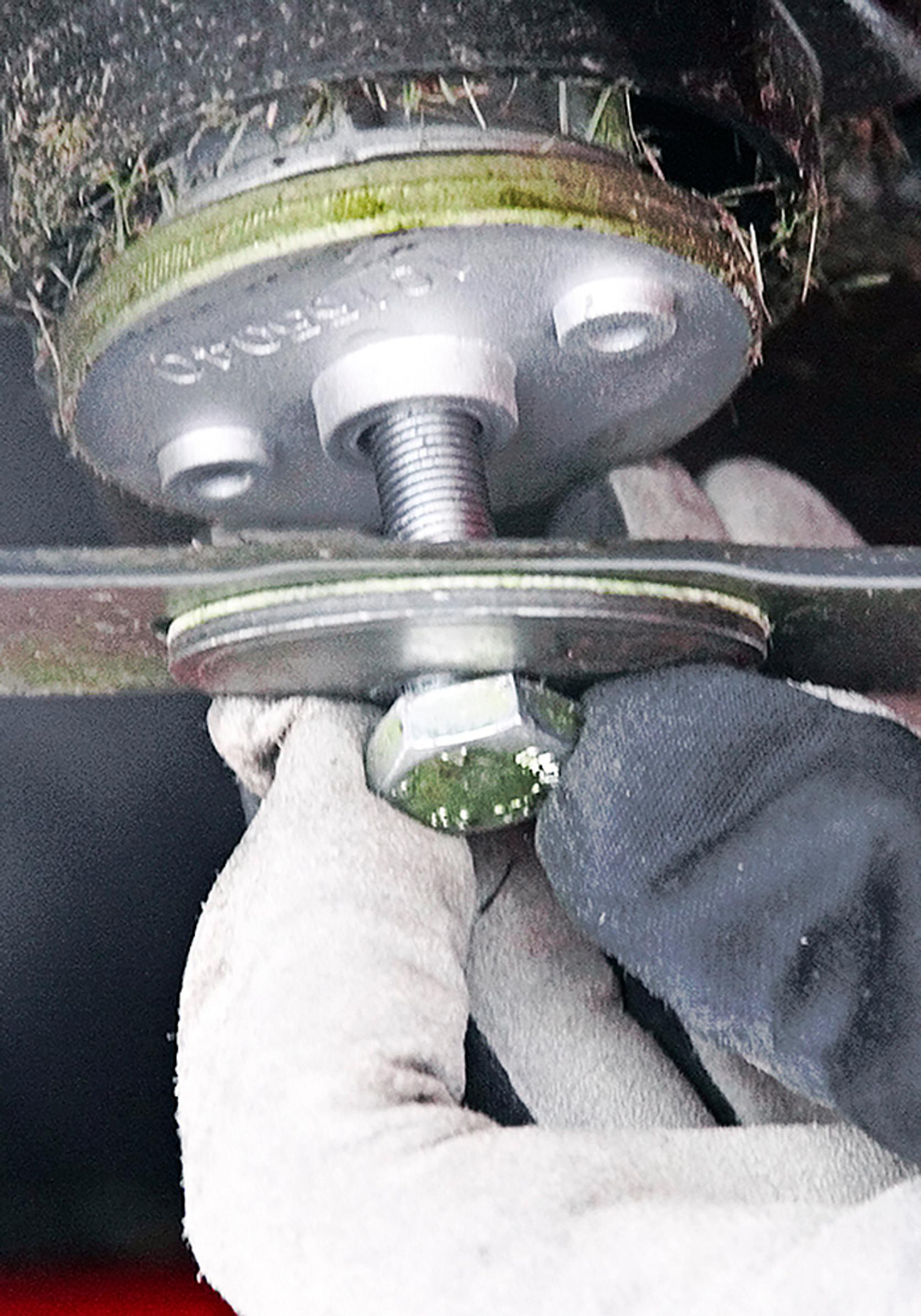 1. Viimeistele ruohonleikkurin huolto terien teroituksella. Irrota ruohonleikkurin terä löystyttämällä pultti tai mutteri sopivalla lenkkiavaimella ja ruuvaamalla lopuksi käsin irti.