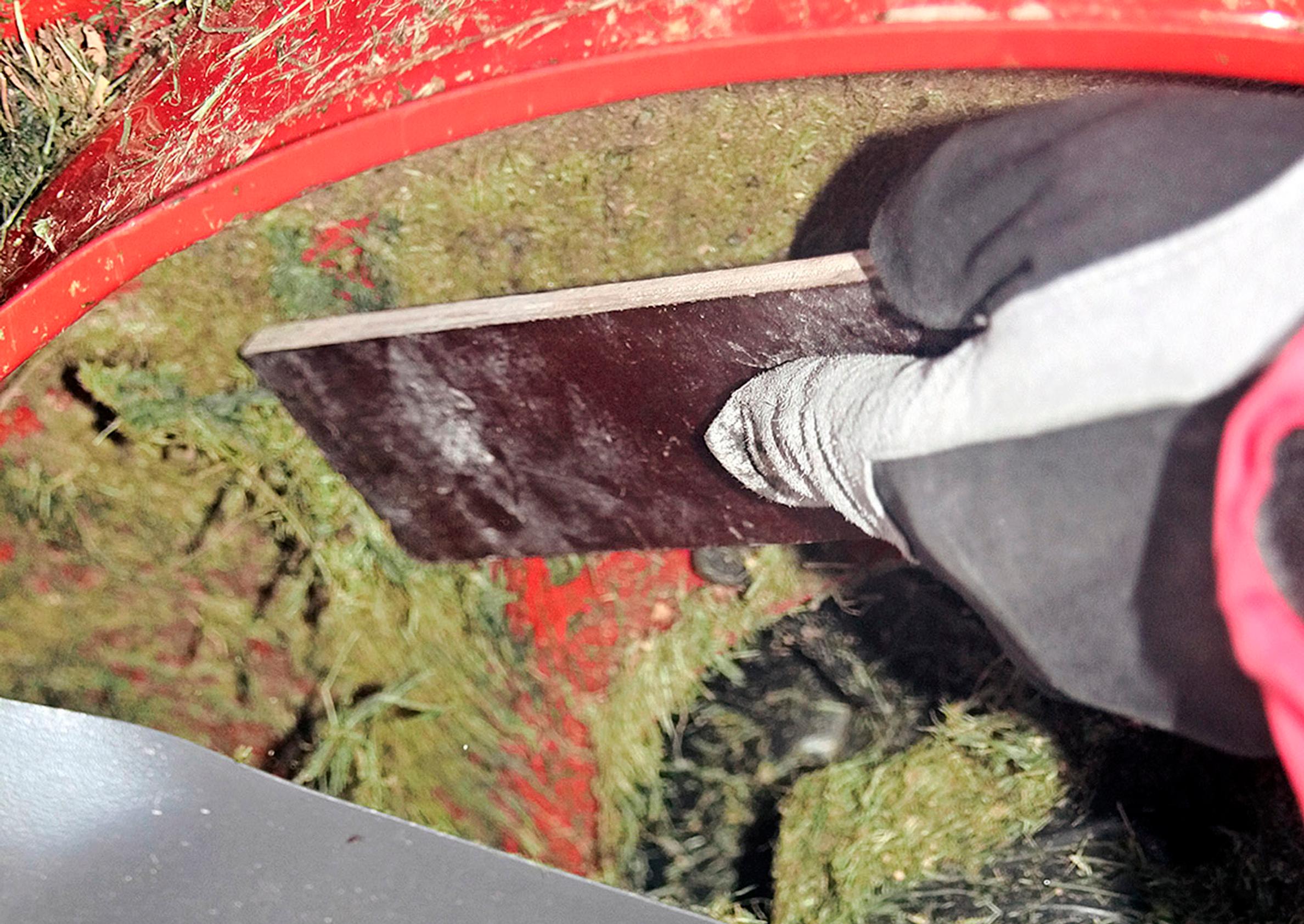 5. Poista kuivunut leikkuujäte ruohonleikkurin pohjasta, mikäli se on jäänyt tekemättä viimeisen leikkuukerran jälkeen. Kaavi enimmät ruohomättäät pois puulastalla tai harjalla.