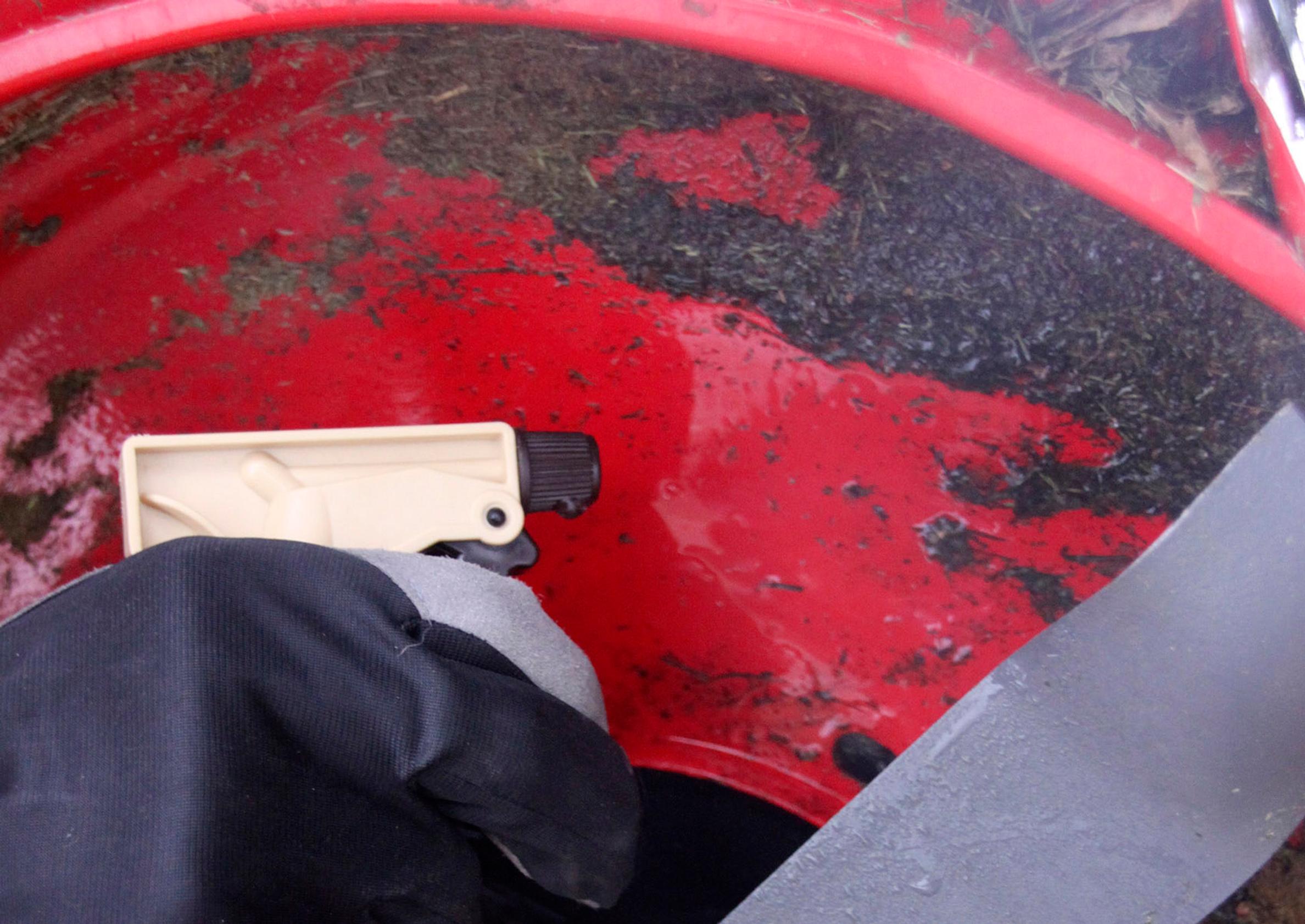 6. Jos ruoho on tiukkaan pinttynyttä, kastele sitä veteen kostutetulla sienellä tai sumuta sumupullolla, kunnes se pehmenee ja irtoaa helpommin. Huuhtele ruohonleikkurin alusta tarvittaessa vedellä tai pyyhi kostealla sienellä.