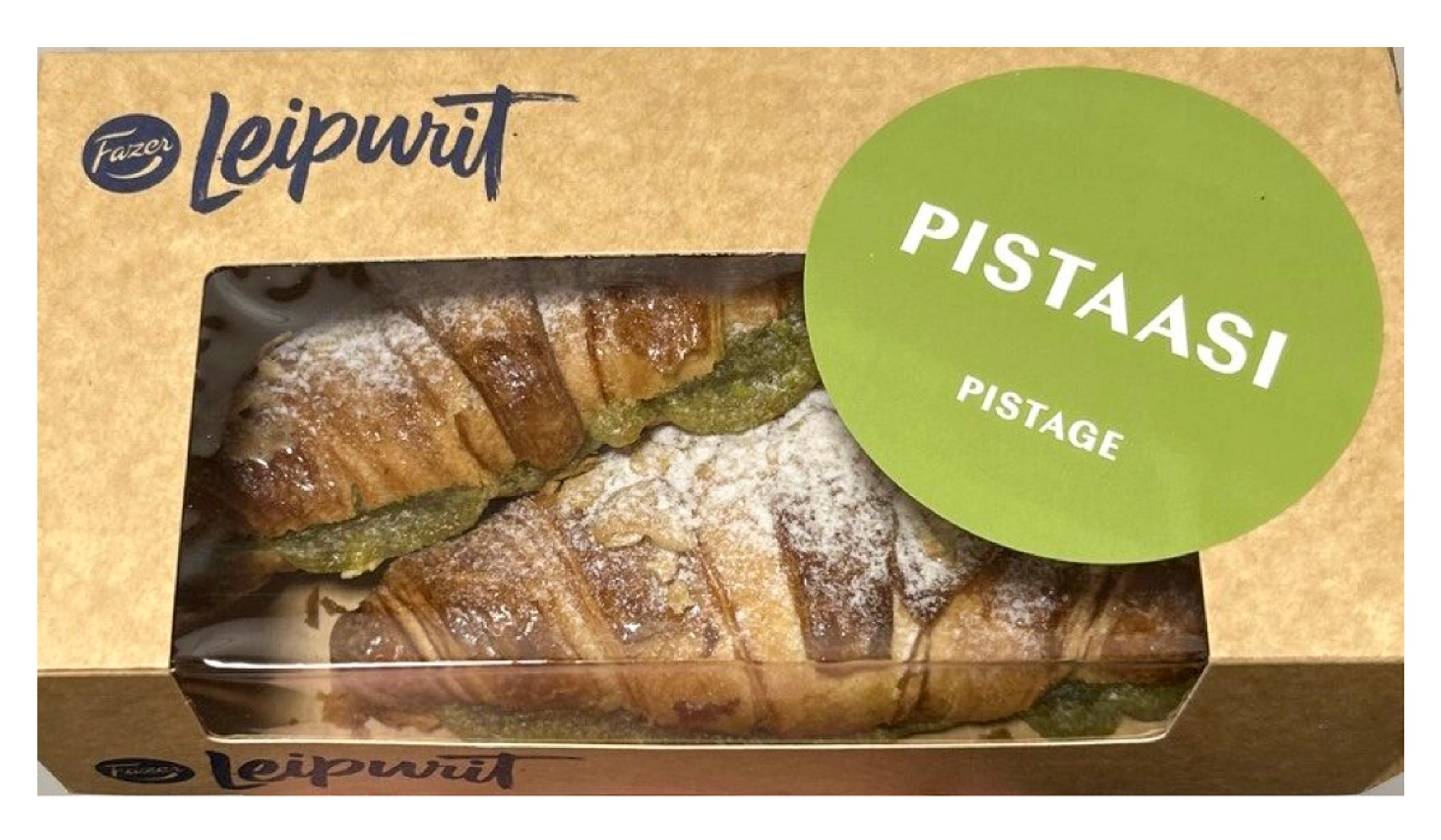 Rapean makealla mantelitoscalla päällystetyt croissantit kätkevät sisäänsä reilusti pistaasinmakuista mehevää täytettä, johon on sekoitettu myös purutuntumaa tuovaa rapeaa pistaasicrumblea. Lehtevä ja tuhti herkku on juuri sopivan kokoinen kahvin kera nautittavaksi.
