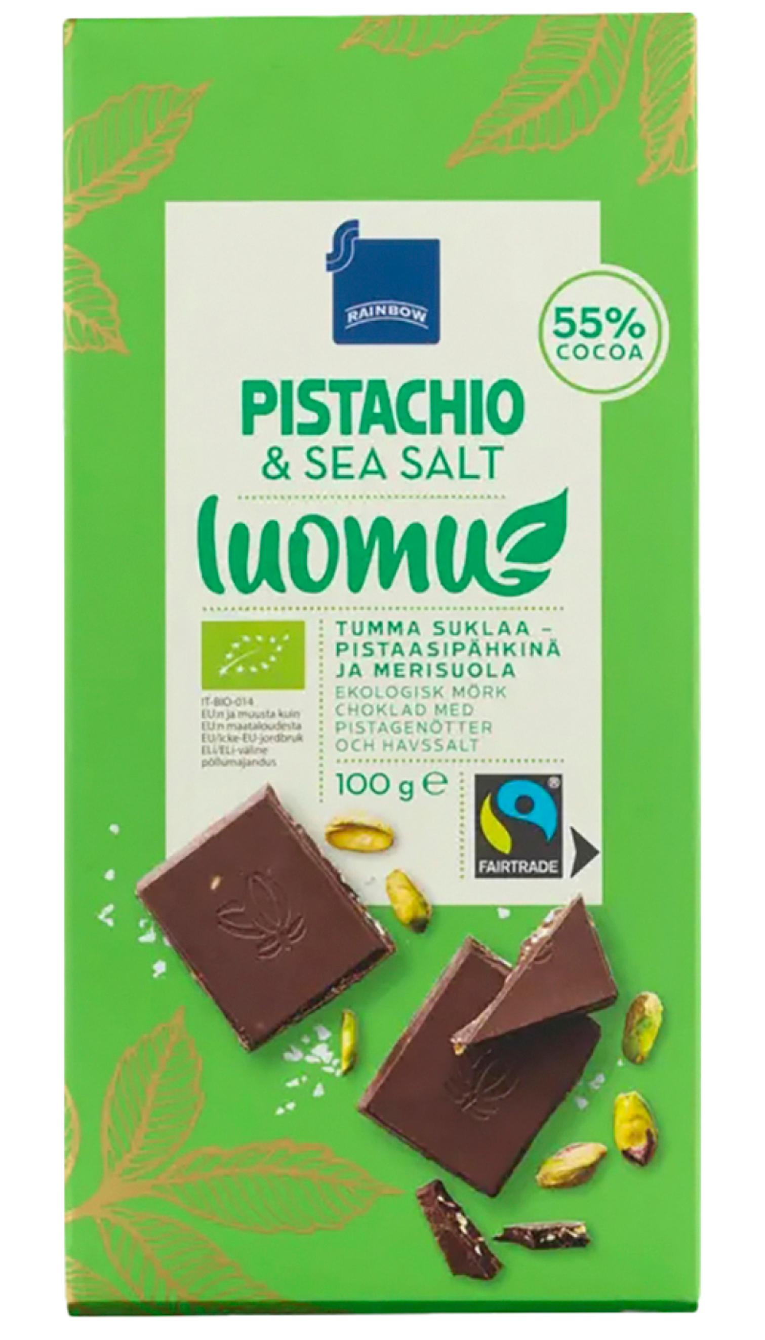 Tummasta luomusuklaasta valmistettu ohut suklaalevy on maustettu rapealla pistaasirouheella ja merisuolalla. Tumman suklaan kaakaoprosentti on juuri sopiva, joten suklaa ei ole liian kitkerä eikä liian makea. Tyylikkääseen pahvipakkaukseen pakattu suklaalevy on maidoton.
