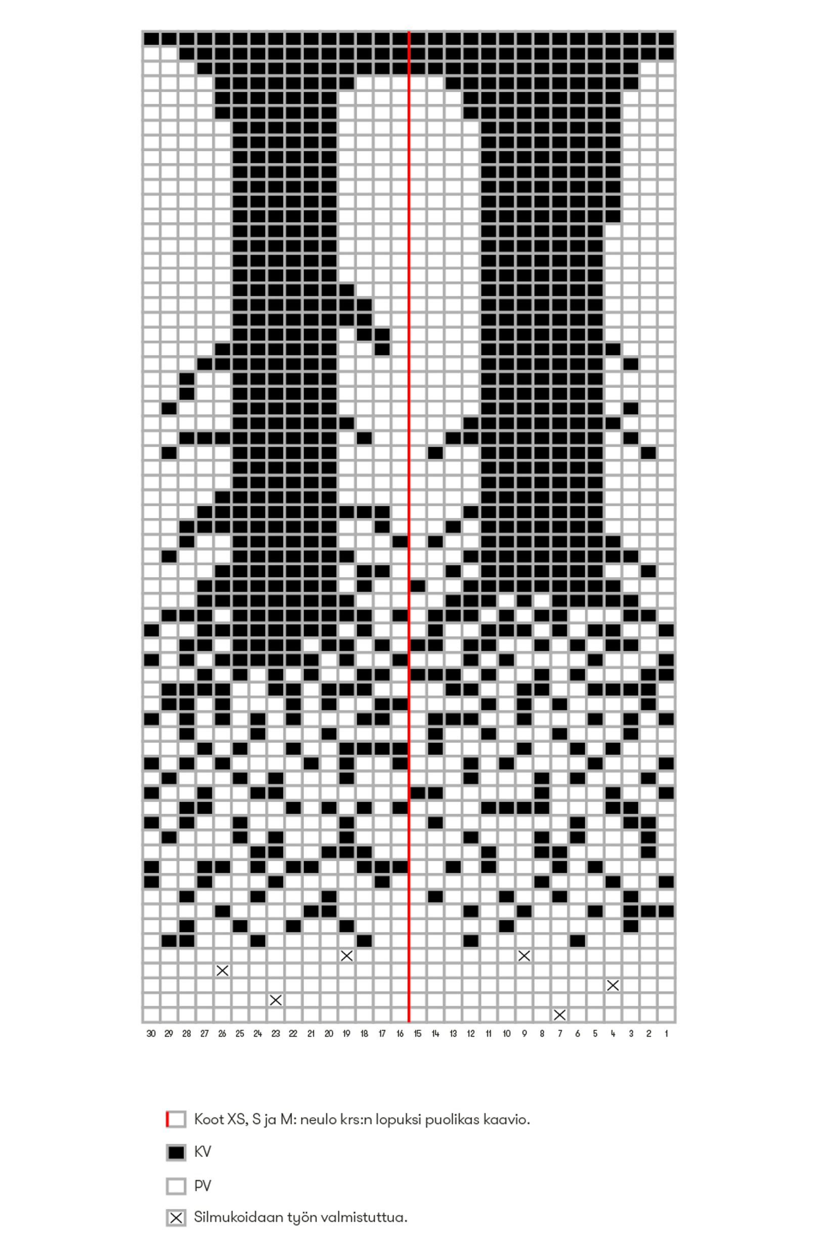 Vaihda työhön paksuimmat puikot ja neulo kaavion krs:t 6–67: Kaavio toistuu krs:lla 7,5 (8,5; 9,5; 10) (11, 12 ,13) krt.
