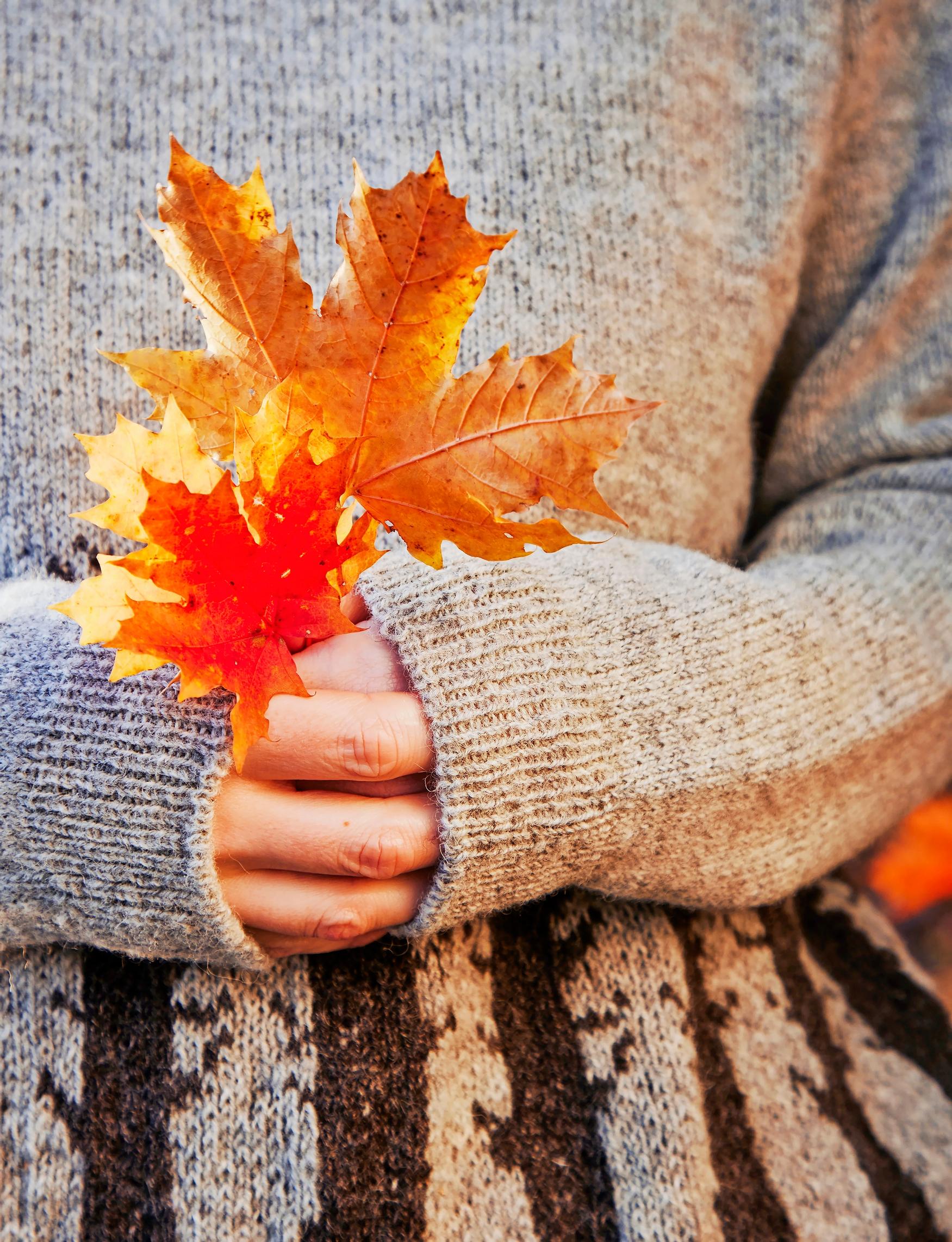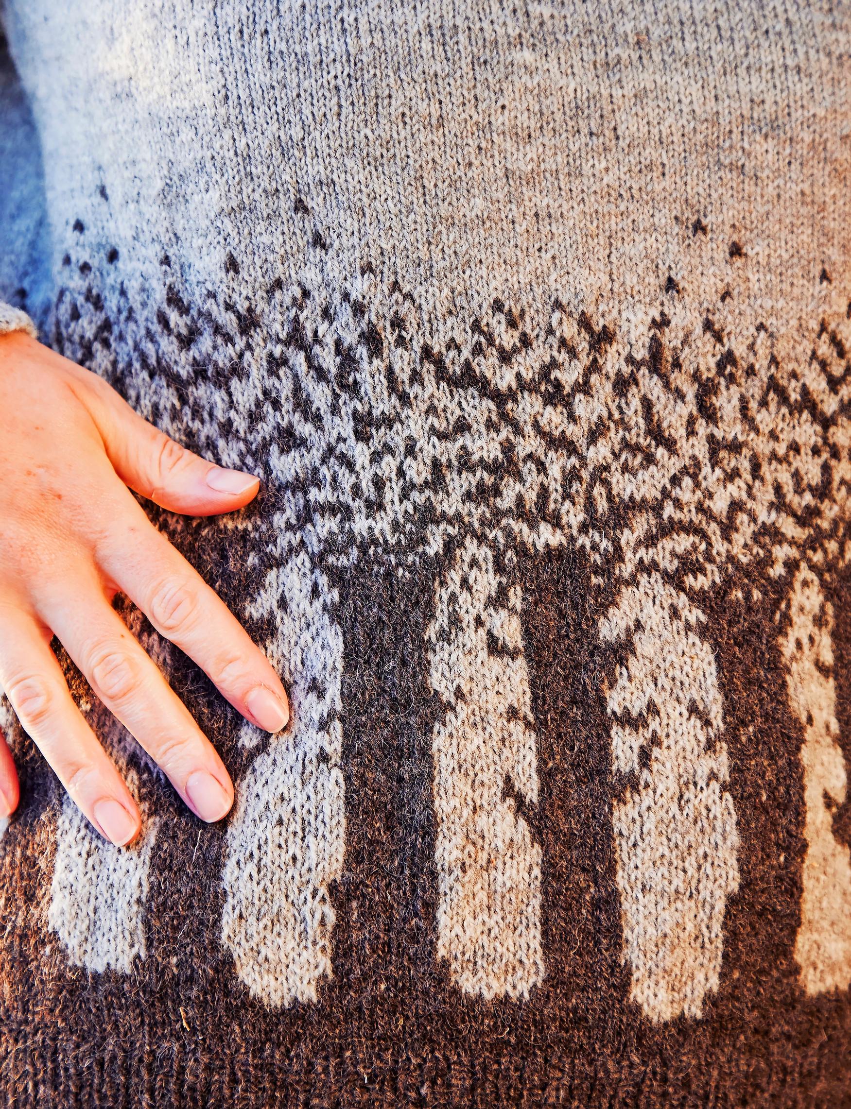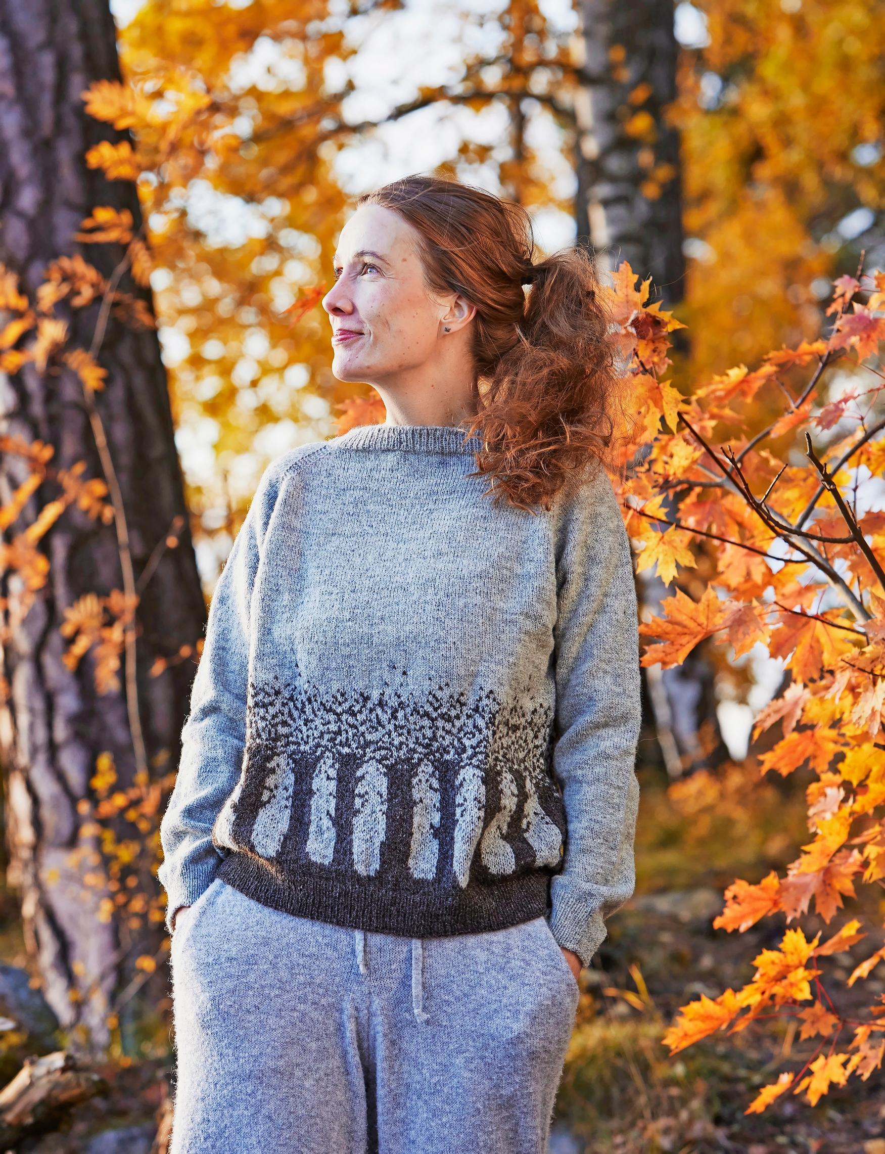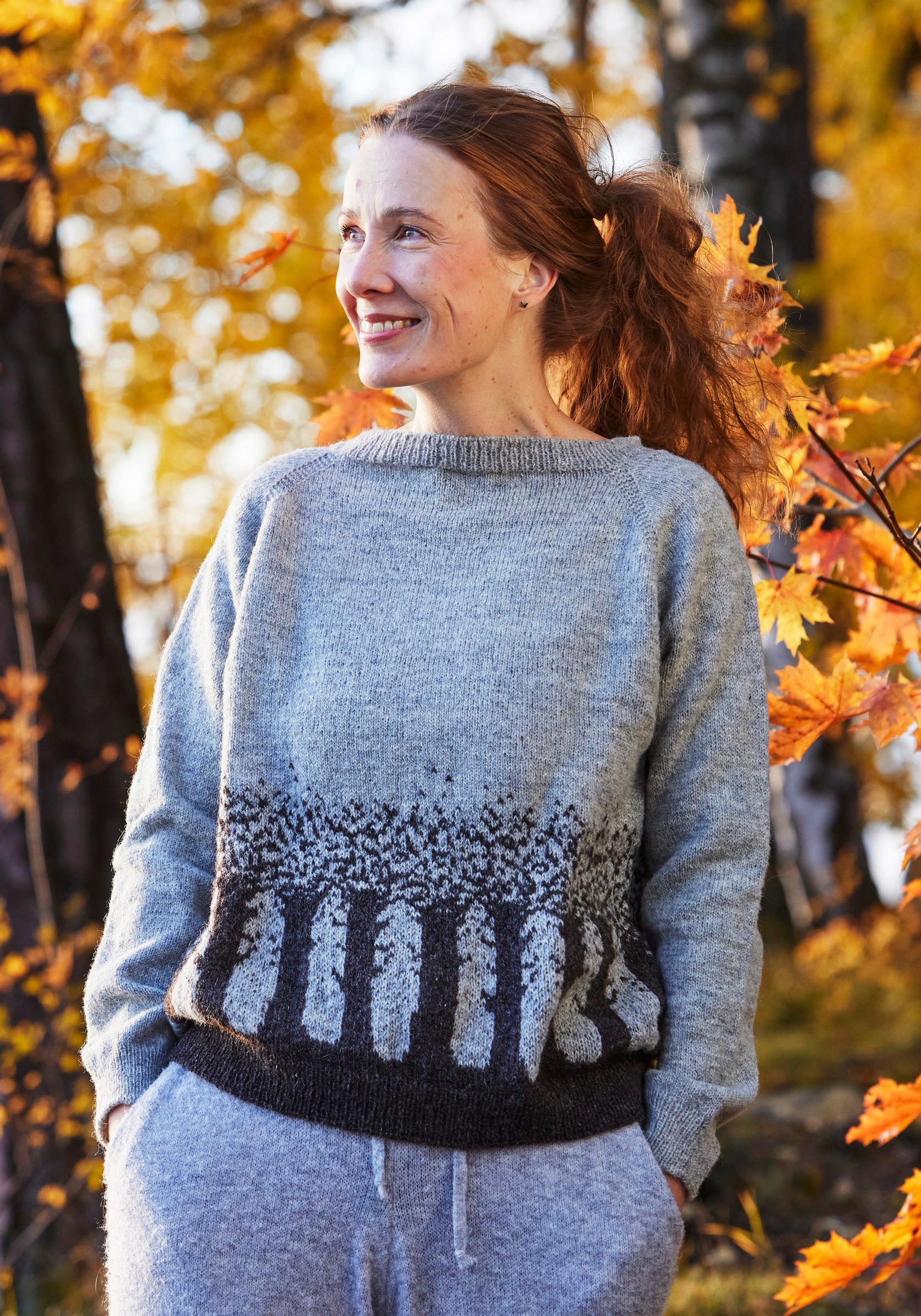 Kahden värin kirjoneulepaitaa koristavat syksyiset puut – katso ohje ja neulo näyttävä pusero