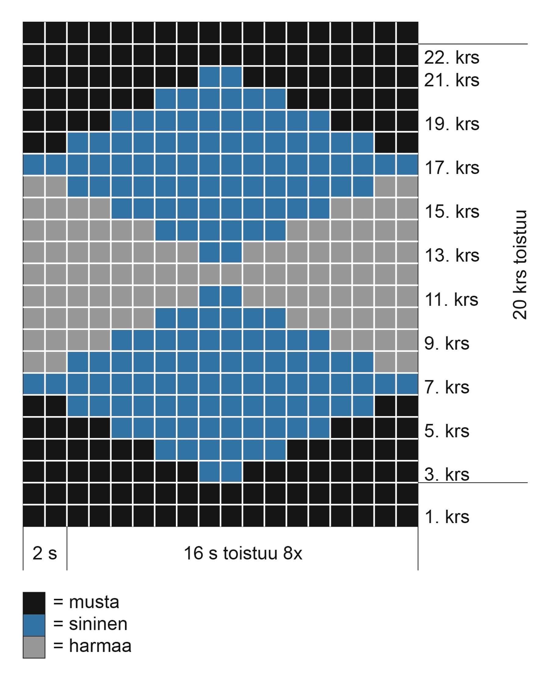 Aloita kirjovirkkaus mustalla ja sinisellä kuteella ruutupiirroksen mukaan. Vaihda väriä aina vetämällä täytelanka viimeisen s:n läpi ja kiristä kuteita hieman, jotta silmukat eivät jää löysiksi värien rajalla.
