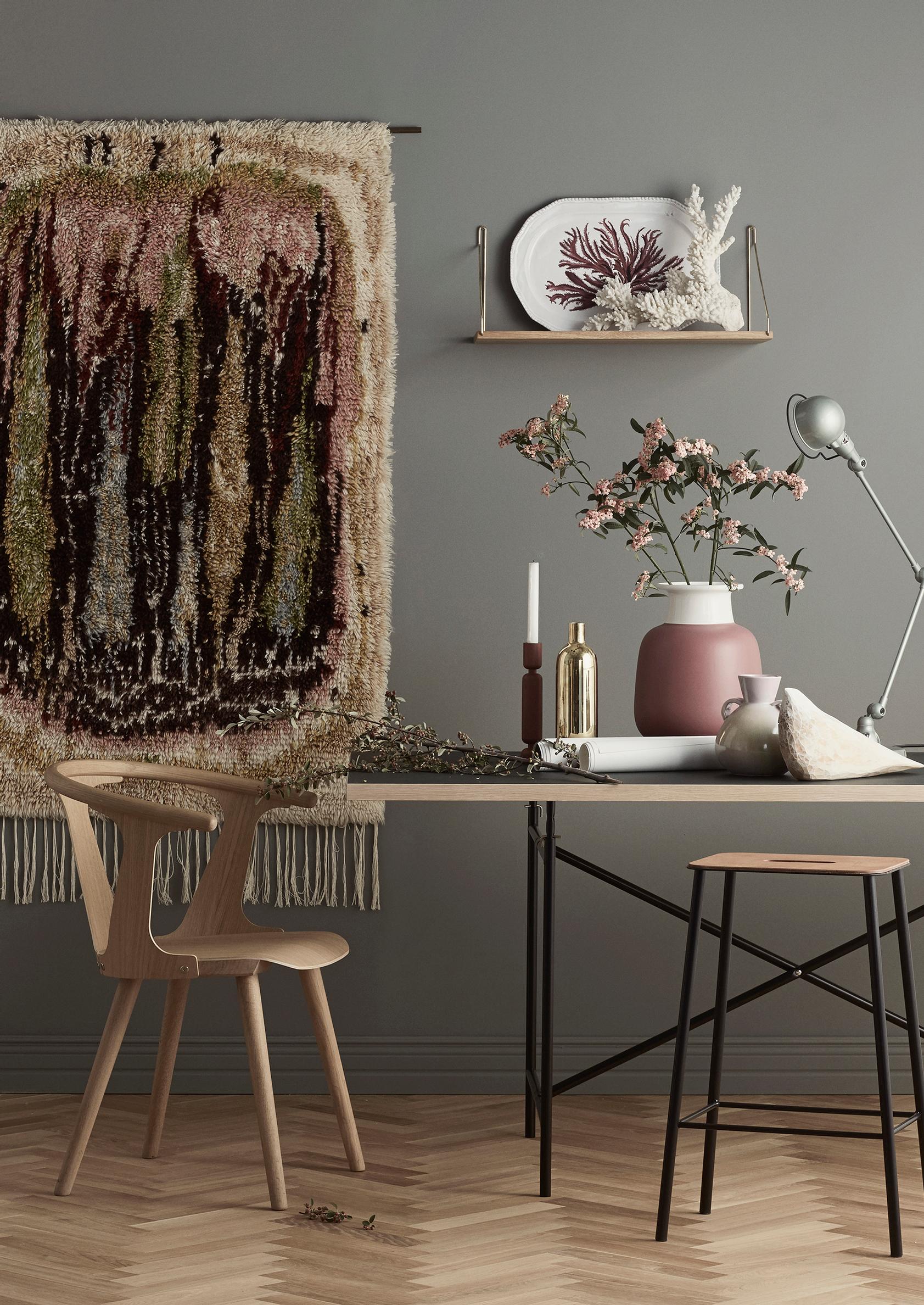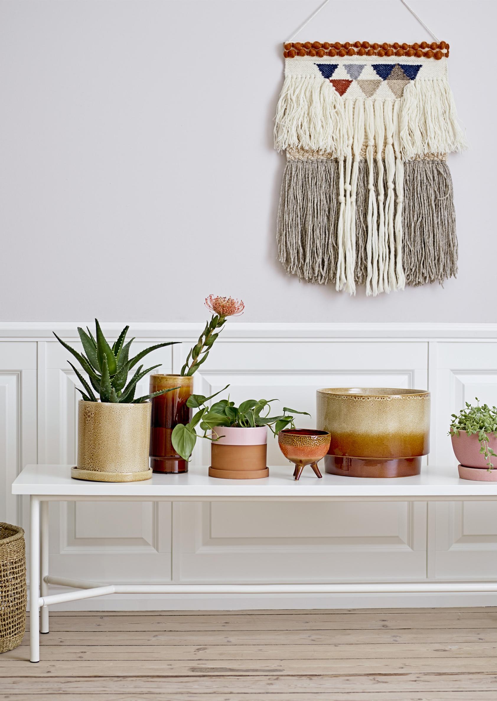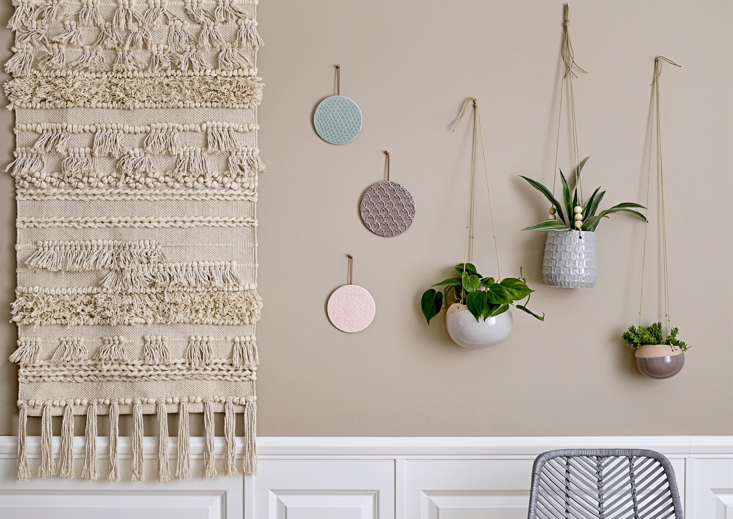 Makrameet olivat suosittuja 1970-luvulla. Saman vuosikymmenen folklore-tyylinen boheemi sisustus inspiroi nyt muotia ja sisustusta. Makramee on käsinkosketeltavan kodikas seinäkoriste, joka sopii yhteen vntagetyylisen keramiikan kanssa. Wall hanger (70 x 50 cm) 89,95 €, Bloomingville. Myös jutun pääkuva on Bloomingvillen.