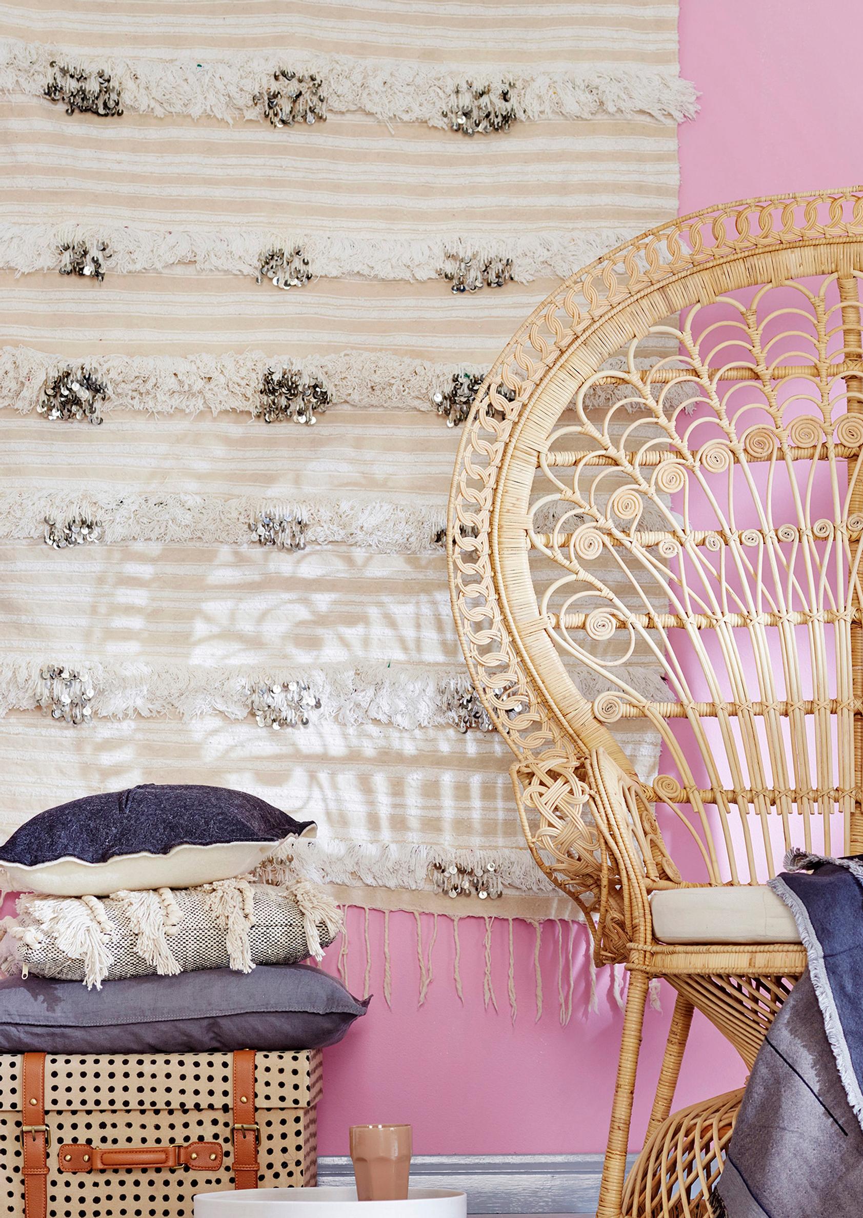 Marokkolainen vintagehääpeitto tuo seinälle sopivasti bling blingiä. Koristeellinen peitto on ryijyä huomattavasti edullisempi vaihtoehto. Peiton reunaan ommeltiin kuja, johon pujotettiin puutanko. Sitten seinälle kiinnitettiin kaksi koukkua, johon tanko pujotettiin. Peiton koko 190 x 200 cm, 270 €, Nest Factory. Rottinkituoli 695 €, Sali. Kuva: Johanna Myllymäki.