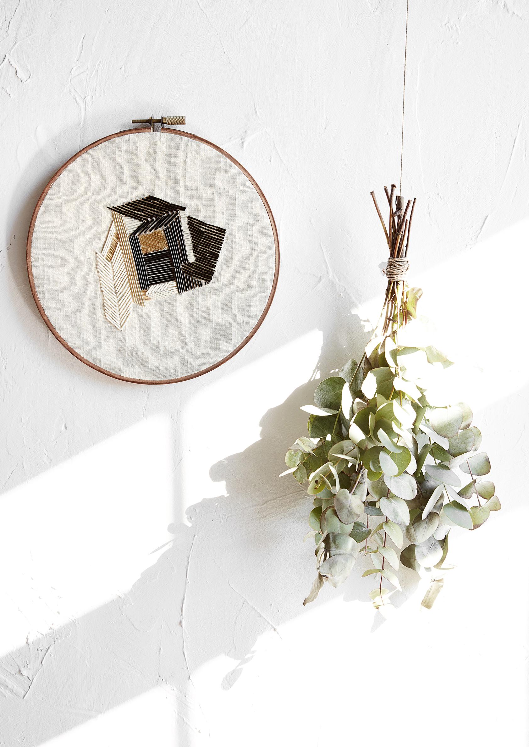 Kirjonta kunniaan! Kirjonta on perinteistä käsityötä, jossa kankaalle kirjotaan kuvioita langalla tai lankaan pujotetuilla helmillä. Muodikaat kirjontatyöt ovat graafisia ja väritykseltään maanläheisiä mutta eivät tunkkaisia. Wall art -teos, House Doctor.