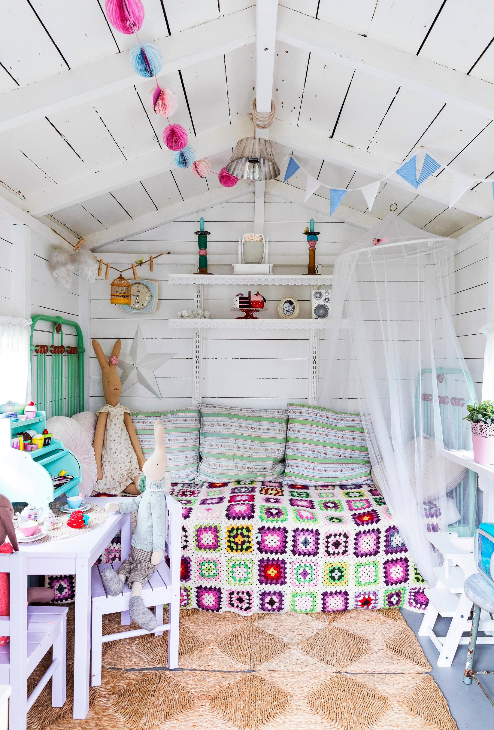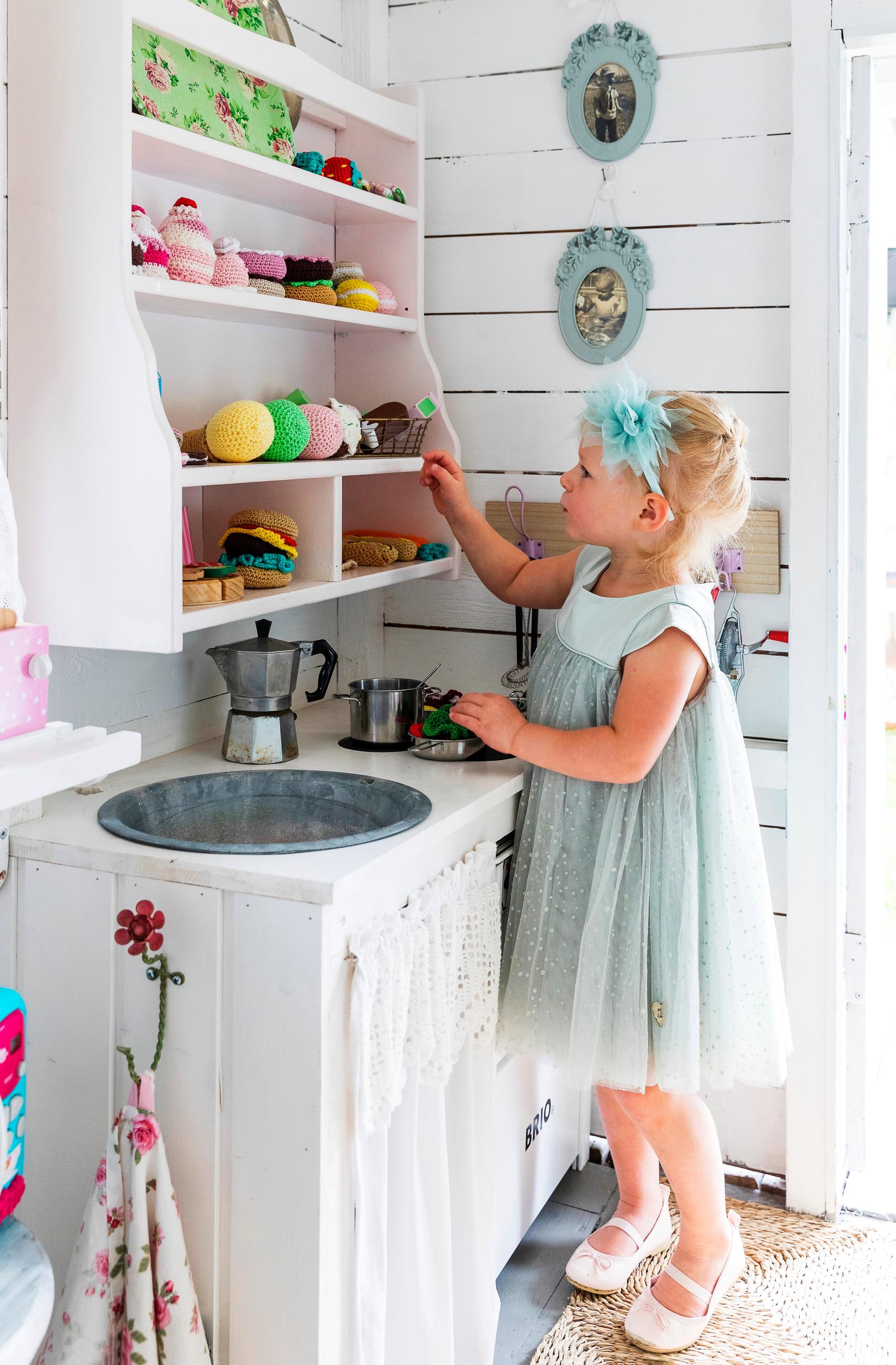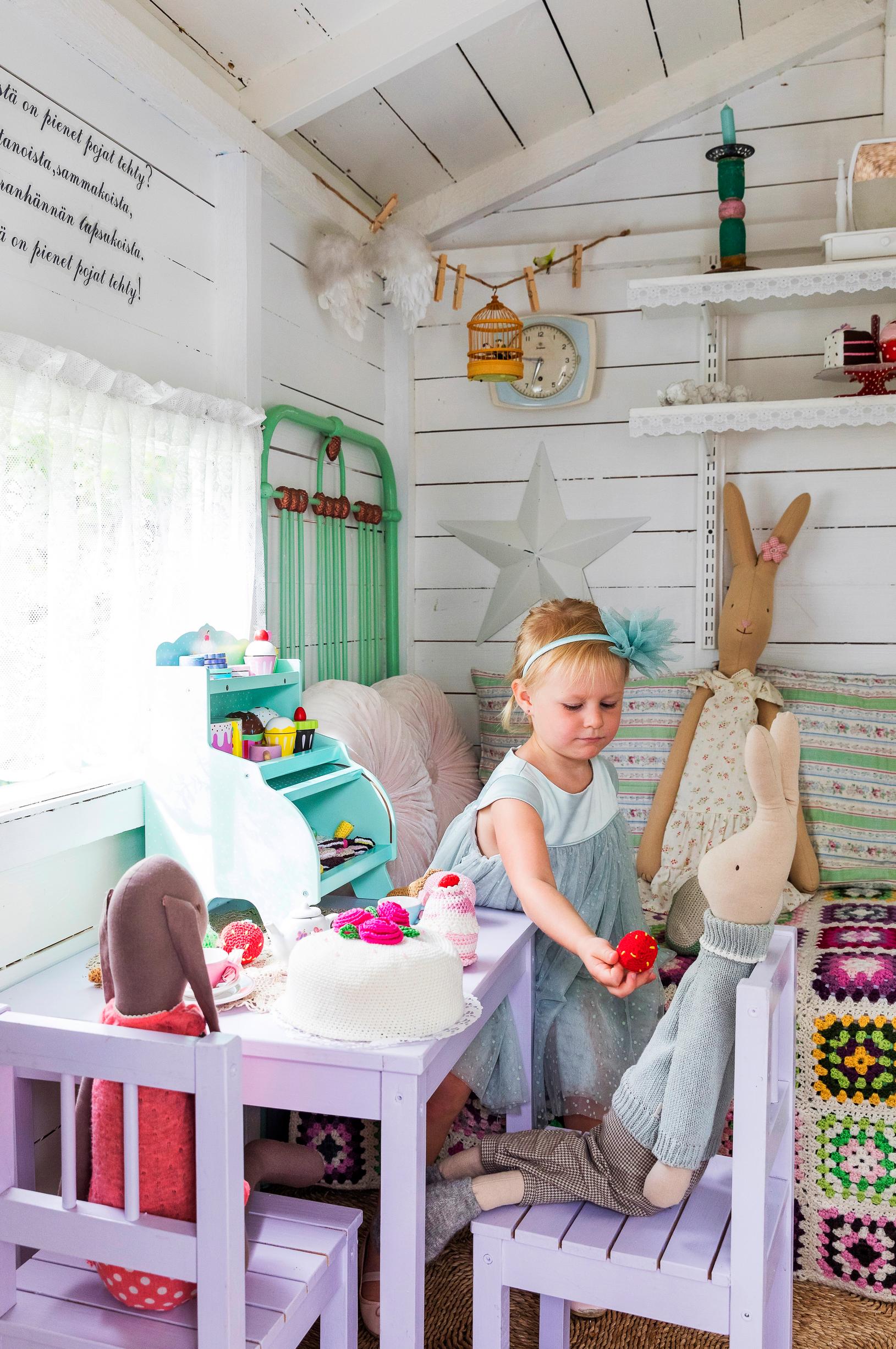 Helmi toivoi mökkiin hempeitä värejä, ja niitä täällä on koko pastellien kirjo. Tyttö on haaveillut omasta huoneesta jo jonkin aikaa. Leikkimökkiä hän pitää omana kesäkamarinaan ja viihtyy hyvin prinsessatunnelmissa.