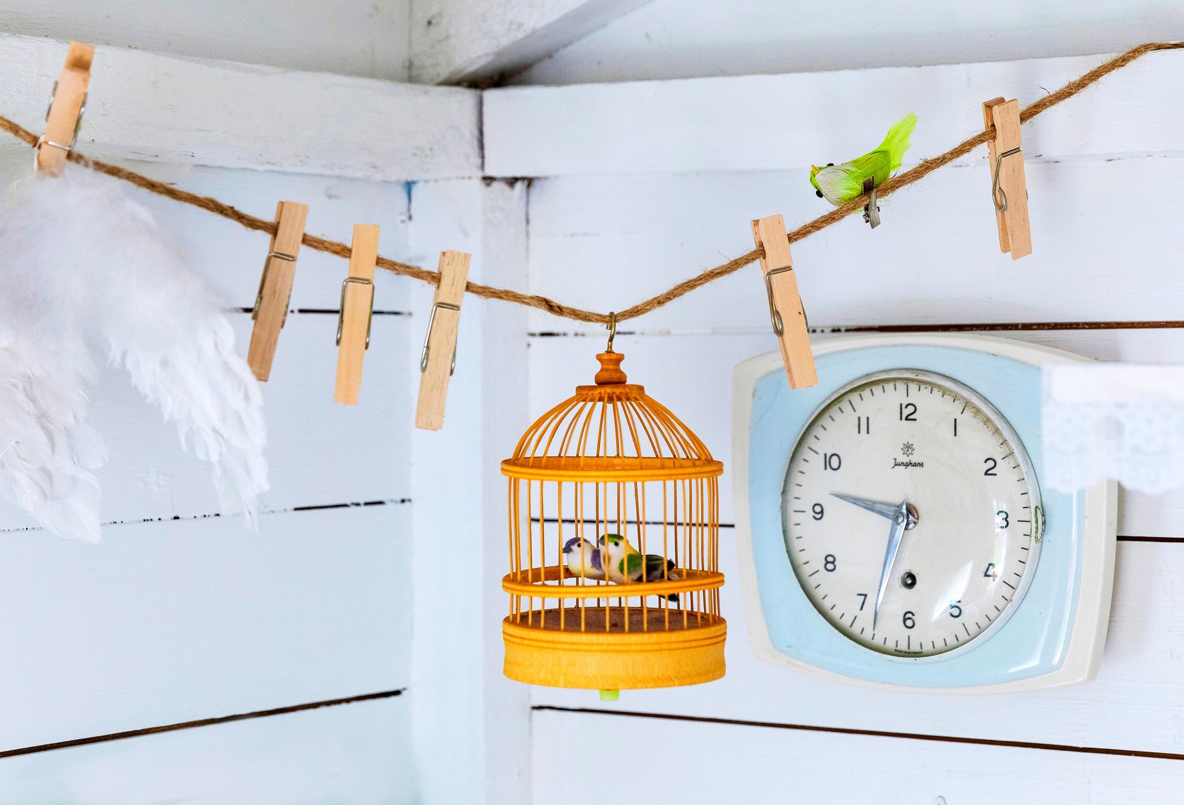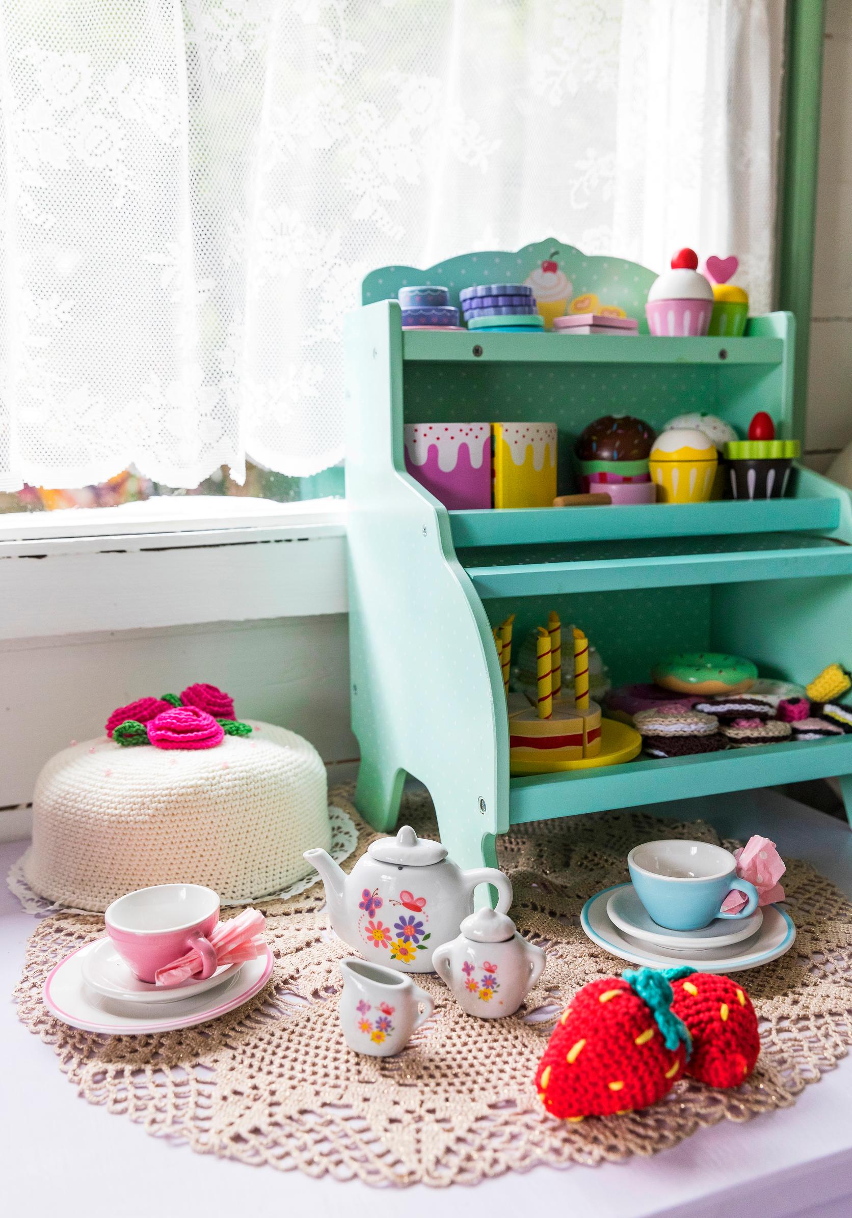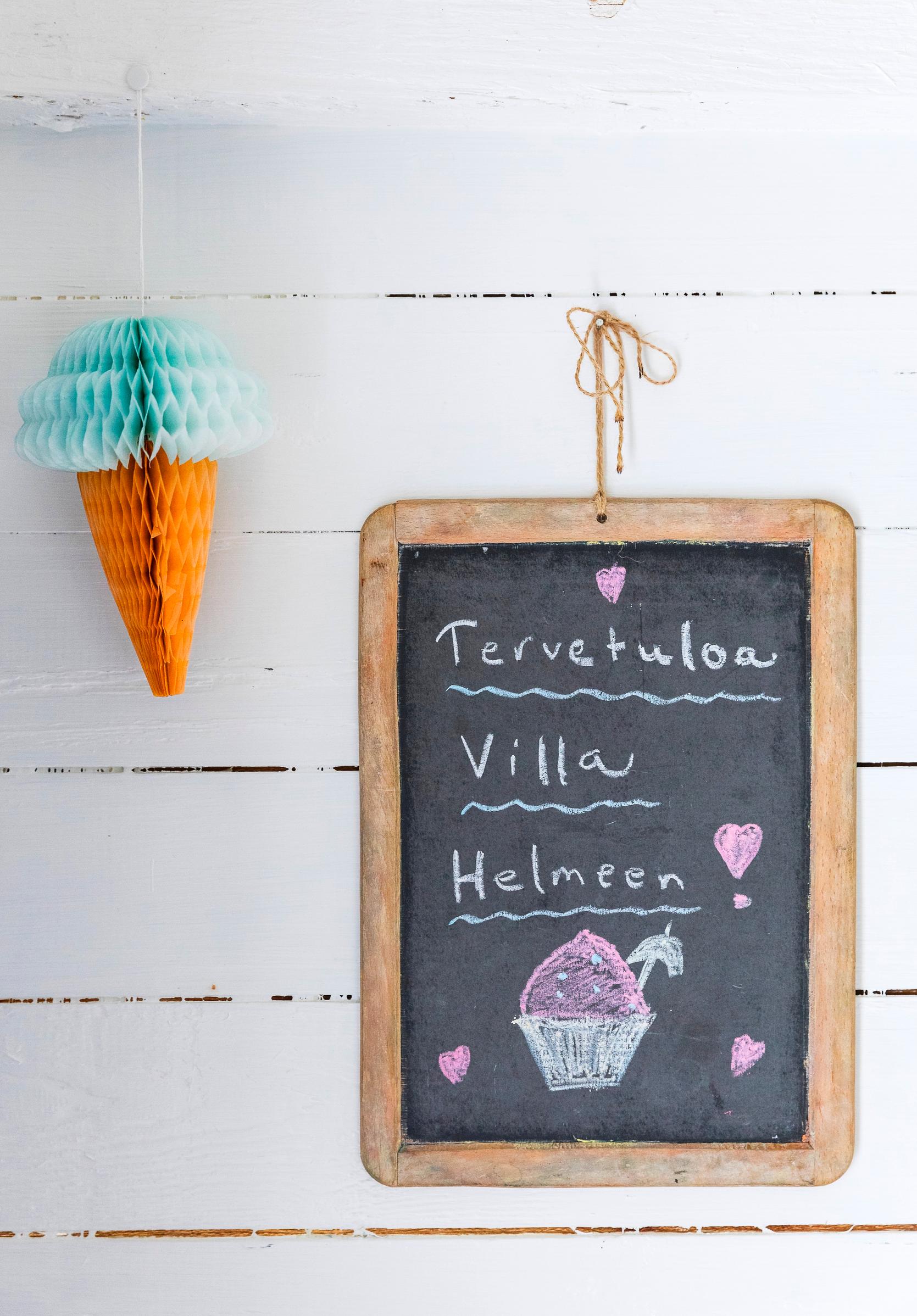 Helmi toivoi mökkiin hempeitä värejä, ja niitä täällä on koko pastellien kirjo. Tyttö on haaveillut omasta huoneesta jo jonkin aikaa. Leikkimökkiä hän pitää omana kesäkamarinaan ja viihtyy hyvin prinsessatunnelmissa.