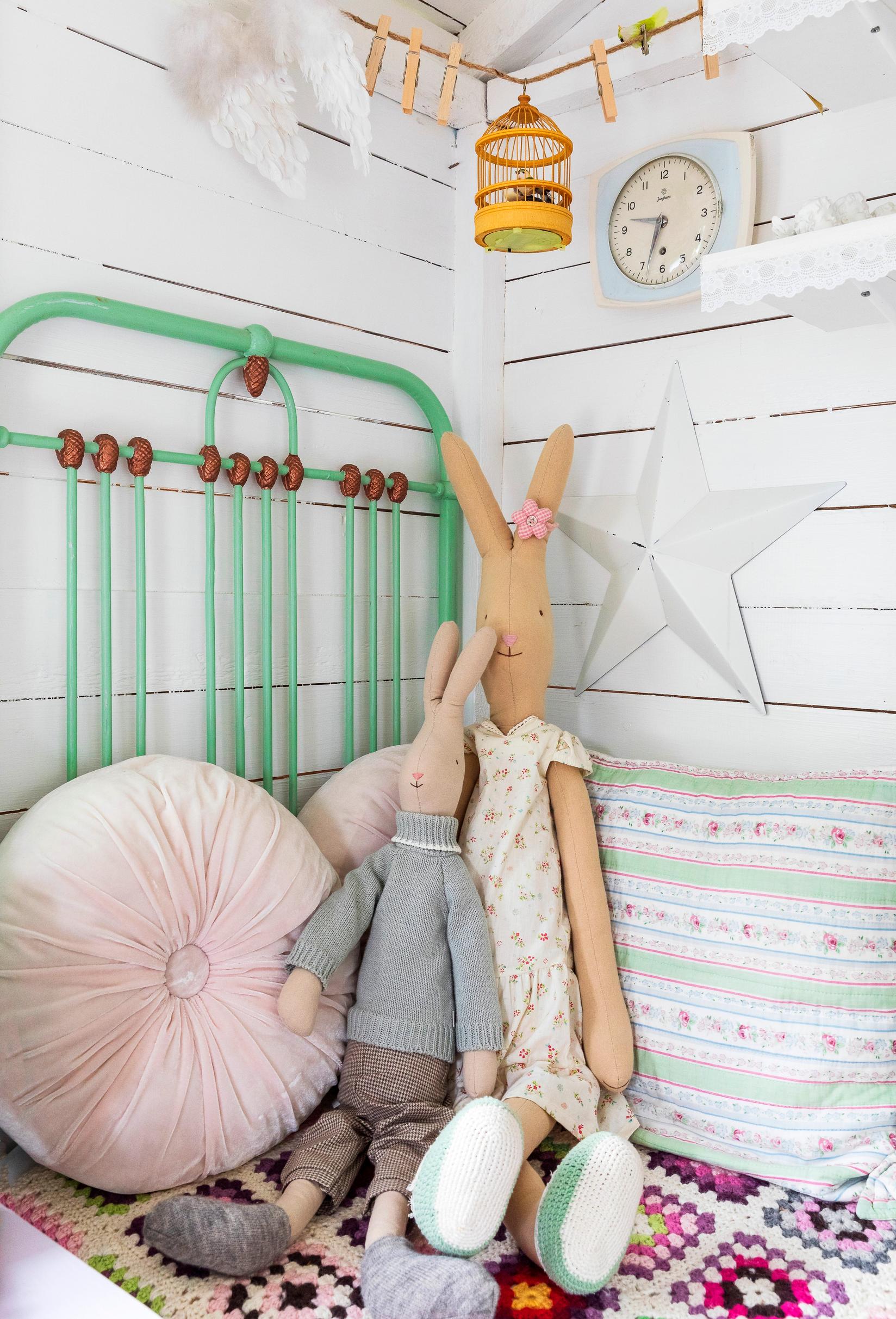Sisustin mökin kierrätyslöydöillä. Sinne mahtui hienosti vanha rautasänky, jonka löysin umpiruosteessa vanhan tavaran liikkeestä. Janne hiekkapuhalsi sängyn, ja minä maalasin sen vaaleanvihreäksi. Aikuisenkin on ihana ottaa siinä päiväunet tai lukea kirjoja kesäsateen ropistessa kattoon.