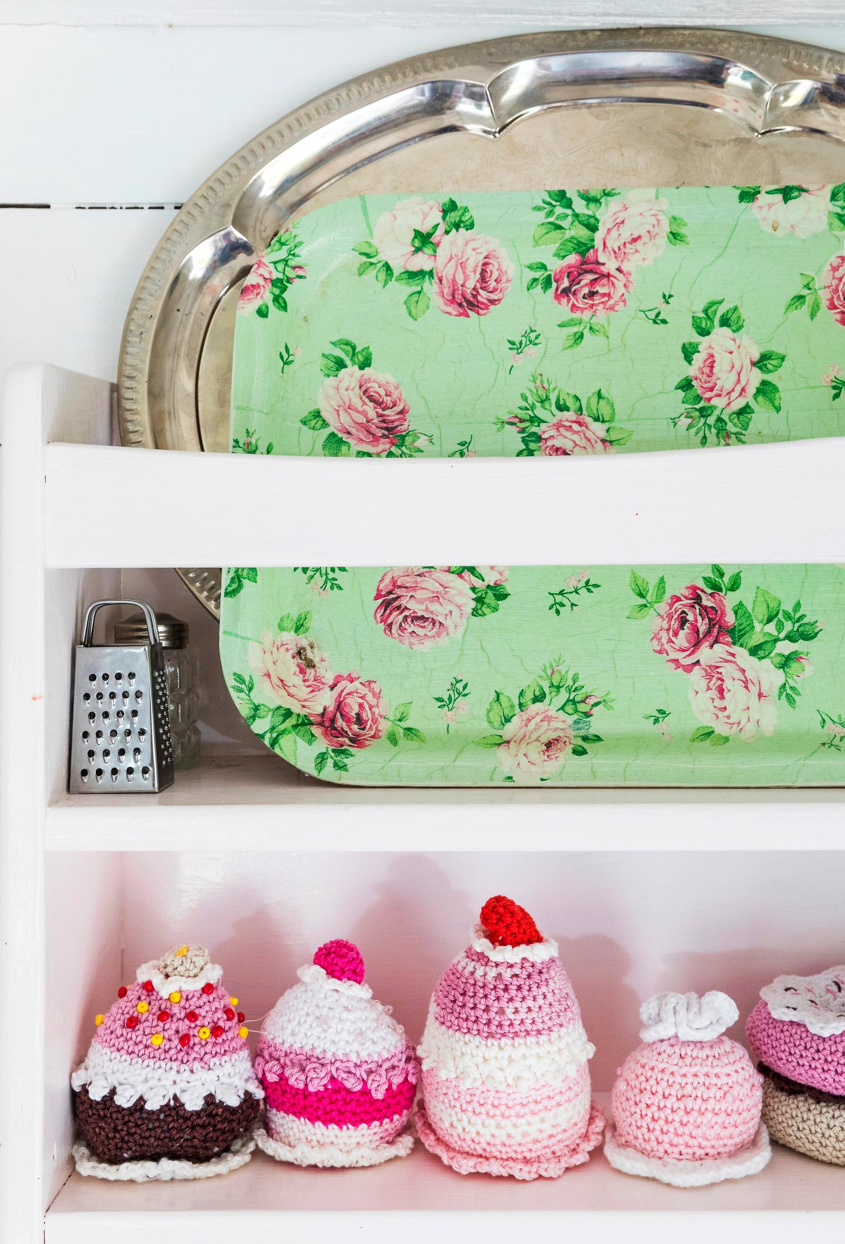 Äitini on kova virkkaamaan, ja nyt hän on innostunut väkertämään lapsille leikkiherkkuja. Hän on virkannut myös isoäidinneliöpeiton, joka koristaa rautasänkyä. Se kokoaa mökin iloisenkirjavan värimaailman yhteen.