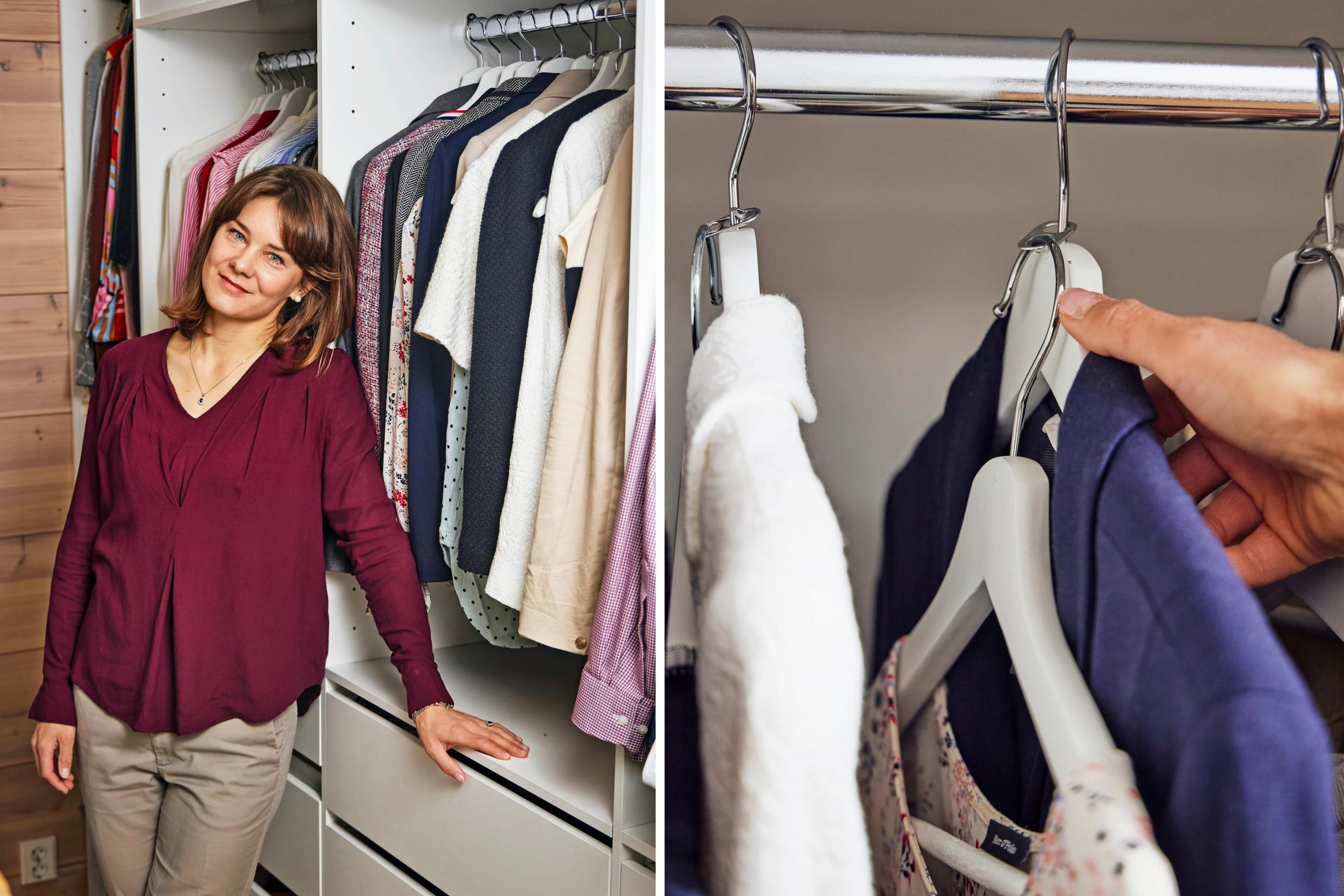 ”Yhdistelen tällä niksillä yhteensopivat jakut ja topit valmiiksi keskenään. Aamulla vaatteiden valintaan ei kulu turhaan aikaa, kun sopivia yhdistelmiä on jo olemassa.”